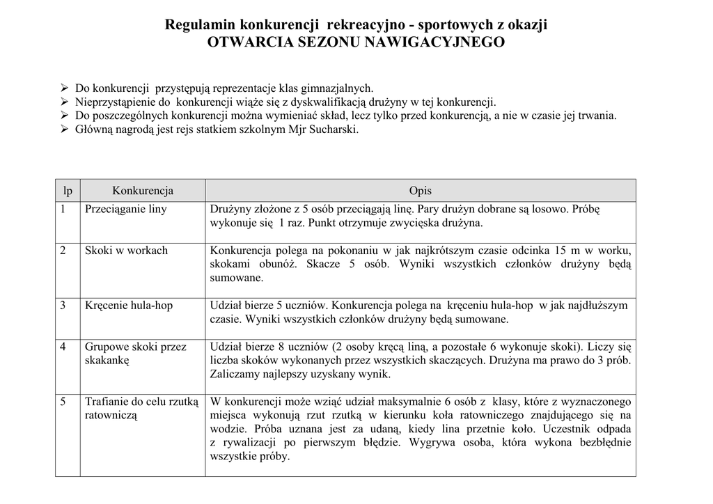 Regulamin konkurencji rekreacyjno - sportowych z okazji OTWARCIA SEZONU NAWIGACYJNEGO Do konkurencji przystępują reprezentacje klas gimnazjalnych. Nieprzystąpienie do konkurencji wiąże się z dyskwalifikacją drużyny w tej konkurencji. Do poszczególnych konkurencji można wymieniać skład, lecz tylko przed konkurencją, a nie w czasie jej trwania. Główną nagrodą jest rejs statkiem szkolnym Mjr Sucharski. lp Konkurencja Opis 1 Przeciąganie liny Drużyny złożone z 5 osób przeciągają linę. Pary drużyn dobrane są losowo. Próbę wykonuje się 1 raz. Punkt otrzymuje zwycięska drużyna. 2 Skoki w workach Konkurencja polega na pokonaniu w jak najkrótszym czasie odcinka 15 m w worku, skokami obunóż. Skacze 5 osób. Wyniki wszystkich członków drużyny będą sumowane. 3 Kręcenie hula-hop Udział bierze 5 uczniów. Konkurencja polega na kręceniu hula-hop w jak najdłuższym czasie. Wyniki wszystkich członków drużyny będą sumowane. 4 Grupowe skoki przez skakankę Udział bierze 8 uczniów (2 osoby kręcą liną, a pozostałe 6 wykonuje skoki). Liczy się liczba skoków wykonanych przez wszystkich skaczących. Drużyna ma prawo do 3 prób. Zaliczamy najlepszy uzyskany wynik. 5 Trafianie do celu rzutką W konkurencji może wziąć udział maksymalnie 6 osób z klasy, które z wyznaczonego ratowniczą miejsca wykonują rzut rzutką w kierunku koła ratowniczego znajdującego się na wodzie. Próba uznana jest za udaną, kiedy lina przetnie koło. Uczestnik odpada z rywalizacji po pierwszym błędzie. Wygrywa osoba, która wykona bezbłędnie wszystkie próby. 6 Wiązanie węzłów żeglarskich Udział bierze 3 uczniów z poszczególnych drużyn. Konkurencja polega na zawiązaniu węzła w jak najkrótszym czasie. Wyniki wszystkich członków drużyny będą sumowane. 7 Wymiana koła samochodowego na czas Udział bierze 3 uczniów z poszczególnych drużyn. Konkurencja polega na wymianie koła samochodowego w jak najkrótszym czasie. Ocenie podlegać będzie tylko jedna próba wymiany koła. 8 Składanie klawiatury komputerowej na czas Udział bierze 3 uczniów z każdej drużyny. Konkurencja polega na złożeniu klawiatury komputerowej w jak najkrótszym czasie. Ocenie podlegać będzie tylko jedna próba złożenia klawiatury. 9 Zawody strzeleckie z broni pneumatycznej W konkurencji może wziąć udział maksymalnie 6 osób, które z wyznaczonego miejsca, oddalonego od tarczy o 10 m, oddają po jednym strzale z pozycji stojącej. Ocenie podlega suma 6 strzałów, oddanych przez każdą drużynę.