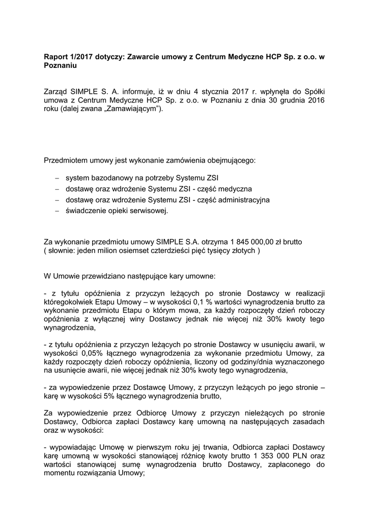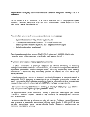 Raport 1/2017 dotyczy: Zawarcie umowy z Centrum Medyczne HCP Sp. z o.o. w Poznaniu Zarząd SIMPLE S. A. informuje, iż w dniu 4 stycznia 2017 r. wpłynęła do Spółki umowa z Centrum Medyczne HCP Sp. z o.o. w Poznaniu z dnia 30 grudnia 2016 roku (dalej zwana „Zamawiającym”). Przedmiotem umowy jest wykonanie zamówienia obejmującego: system bazodanowy na potrzeby Systemu ZSI dostawę oraz wdrożenie Systemu ZSI - część medyczna dostawę oraz wdrożenie Systemu ZSI - część administracyjna świadczenie opieki serwisowej. Za wykonanie przedmiotu umowy SIMPLE S.A. otrzyma 1 845 000,00 zł brutto ( słownie: jeden milion osiemset czterdzieści pięć tysięcy złotych ) W Umowie przewidziano następujące kary umowne: - z tytułu opóźnienia z przyczyn leżących po stronie Dostawcy w realizacji któregokolwiek Etapu Umowy – w wysokości 0,1 % wartości wynagrodzenia brutto za wykonanie przedmiotu Etapu o którym mowa, za każdy rozpoczęty dzień roboczy opóźnienia z wyłącznej winy Dostawcy jednak nie więcej niż 30% kwoty tego wynagrodzenia, - z tytułu opóźnienia z przyczyn leżących po stronie Dostawcy w usunięciu awarii, w wysokości 0,05% łącznego wynagrodzenia za wykonanie przedmiotu Umowy, za każdy rozpoczęty dzień roboczy opóźnienia, liczony od godziny/dnia wyznaczonego na usunięcie awarii, nie więcej jednak niż 30% kwoty tego wynagrodzenia, - za wypowiedzenie przez Dostawcę Umowy, z przyczyn leżących po jego stronie – karę w wysokości 5% łącznego wynagrodzenia brutto, Za wypowiedzenie przez Odbiorcę Umowy z przyczyn nieleżących po stronie Dostawcy, Odbiorca zapłaci Dostawcy karę umowną na następujących zasadach oraz w wysokości: - wypowiadając Umowę w pierwszym roku jej trwania, Odbiorca zapłaci Dostawcy karę umowną w wysokości stanowiącej różnicę kwoty brutto 1 353 000 PLN oraz wartości stanowiącej sumę wynagrodzenia brutto Dostawcy, zapłaconego do momentu rozwiązania Umowy; - wypowiadając Umowę w drugim roku jej trwania, Odbiorca zapłaci Dostawcy karę umowną w wysokości stanowiącej różnicę kwoty brutto 1 476 000 PLN oraz wartości stanowiącej sumę wynagrodzenia brutto Dostawcy, zapłaconego do momentu rozwiązania Umowy, - wypowiadając Umowę w trzecim roku jej trwania, Odbiorca zapłaci Dostawcy karę umowną w wysokości stanowiącej różnicę kwoty brutto 1 599 000 PLN oraz wartości stanowiącej sumę wynagrodzenia brutto Dostawcy, zapłaconego do momentu rozwiązania Umowy, - wypowiadając Umowę w czwartym roku jej trwania, Odbiorca zapłaci Dostawcy karę umowną w wysokości stanowiącej różnicę kwoty brutto 1 722 000 PLN oraz wartości stanowiącej sumę wynagrodzenia brutto Dostawcy, zapłaconego do momentu rozwiązania Umowy, - wypowiadając Umowę w piątym roku jej trwania, Odbiorca zapłaci Dostawcy karę umowną w wysokości stanowiącej różnicę kwoty brutto 1 845 000 PLN oraz wartości stanowiącej sumę wynagrodzenia brutto Dostawcy, zapłaconego do momentu rozwiązania Umowy. Podstawa prawna: Art. 17 ust. 1 Rozporządzenia Parlamentu Europejskiego i Rady (UE) nr 596/2014 z dnia 16 kwietnia 2014 r. w sprawie nadużyć na rynku (rozporządzenie w sprawie nadużyć na rynku) oraz uchylające dyrektywę 2003/6/WE Parlamentu Europejskiego i Rady i dyrektywy Komisji 2003/124/WE, 2003/125/WE i 2004/72/WE