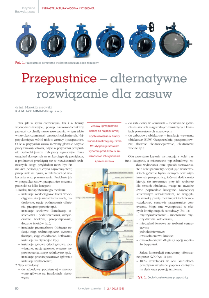 Inżynieria Bezwykopowa INFRASTRUKTURA WODNA I ŚCIEKOWA Fot. 1. Przepustnice centryczne w różnych konfiguracjach zabudowy Przepustnice – alternatywne rozwiązanie dla zasuw dr inż. Marek Brzozowski K.A.M. AVK ARMADAN sp. z o.o. Tak jak w życiu codziennym, tak i w branży wodno-kanalizacyjnej, postęp naukowo-techniczny przynosi co chwilę nowe rozwiązania, w tym także w szeroko rozumianych zaworach odcinających. Najpopularniejsze wśród nich to zasuwy i przepustnice. O ile w przypadku zasuw mówimy głównie o trybie pracy zamknij/ otwórz, o tyle w przypadku przepustnic dochodzi jeszcze tryb pracy regulacyjnej. Baza urządzeń dostępnych na rynku ciągle się powiększa, a producenci prześcigają się w rozwiązaniach technicznych, czego przykładem może być Firma AVK posiadającą chyba najszerszą ofertę przepustnic na rynku, w zależności od wykonania oraz przeznaczenia. Podobnie jak w przypadku zasuw, przepustnice możemy podzielić na kilka kategorii: 1. Rodzaj transportowanego medium: – instalacje wodociągowe (sieci wodociągowe, stacje uzdatniania wody, hydrofornie, stacje podnoszenia ciśnienia, przepompownie itp.), – instalacje ściekowe (kanalizacja ciśnieniowa i podciśnieniowa, oczyszczalnie ścieków, przepompownie, tłocznie ścieków itp.), – instalacje przemysłowe (różnego rodzaju ciągi technologiczne, systemy tłoczące, ciągi chłodnicze, kotłownie, instalacje wentylacyjne itp.), – instalacje gazowe (sieci gazowe, powietrzne, stacje gazowe, systemy napowietrzania, stacje redukcyjne itp.), – instalacje przeciwpożarowe (głównie instalacje tryskaczowe). 2. Typ zabudowy: – do zabudowy podziemnej – montowane głównie na instalacjach sieciowych, 60 Zasuwy i przepustnice należą do najpopularniejszych rozwiązań w branży wodno-kanalizacyjnej. Firma AVK dysponuje szerokim wyborem produktów, w zależności od ich wykonania i przeznaczenia kwiecień - czerwiec – do zabudowy w komarach – montowane głównie na sieciach magistralnych zamkniętych kanałach przerzutowych zrzutowych, – do zabudowy obiektowej – instalacje wewnątrz obiektowe (SUW, Oczyszczalnie, przepompownie, tłocznie elektrociepłownie, elektrownie wodne itp.). Oba powyższe kryteria wymuszają z kolei trzy inne kategorie, a mianowicie typ zabudowy, rodzaj wykonania oraz sposób sterowania. Te z kolei parametry decydują o właściwościach głównie hydraulicznych oraz użytkowych przepustnicy, którymi dość często kierują się inwestorzy przy ich wyborze dla swoich obiektów, mając na uwadze dwie poprzednie kategorie. Najczęściej stosowanym rozwiązaniem, ze względu na szeroką paletę możliwości techniczno-użytkowej, stanowią przepustnice centryczne. Mogą one występować w różnych konfiguracjach zabudowy (fot. 1): – międzykołnierzowe – montowane między dwoma kołnierzami; – międzykołnierzowe ze śrubami centrującymi; – jednokołnierzowe; – dwukołnierzowe krótkie; – dwukołnierzowe długie (z opcją montażu by-passu). Zaletą konstrukcji centrycznej oferowanej przez AVK (rys. 1) jest: – 100% szczelności w obu kierunkach przepływu uzyskane poprzez centryczny dysk oraz pozycję trzpienia; Rys. 1. Cechy konstrukcyjne przepustnicy 2 / 2014 [54] INFRASTRUKTURA WODNA I ŚCIEKOWA – niewielka strata ciśnienia ze względu na symetryczny dysk o małej grubości; – możliwość pracy przepustnicy w warunkach wysokiej próżni; – wystąpienie efektu samooczyszczenia gdy przepustnica jest zainstalowana z trzpieniem w pozycji poziomej; – gumowe uszczelnienie przytwierdzone do korpusu przepustnicy; – dobra charakterystyka przepływu i niski współczynnik Kv; – możliwość doboru przepustnicy ze względu na rodzaj uszczelnienia jak i funkcje kontrolne; – możliwość doboru przepustnicy w zależności typu zabudowy, medium, ciśnienia, temperatury; – konstrukcja górnej części trzpienia oraz jego wsparcie w górnej i dolnej części na łożyskach przeciwdziała rozerwaniu przepustnicy; – brak potrzeby bieżącego utrzymania; – długi czas użytkowania; – duży zakres średnic – Dn 40–Dn 2500. Jak wspomniano powyżej, jedną z zalet przepustnic centrycznych jest możliwość ich wykonania w różnych konfiguracjach materiałowych. Wybór materiału zależy od: – ciśnienia roboczego; – medium dla którego będzie miała zastosowanie; – temperatury; – wymagań ze względu na korozję. Wulkanizowanie przepustnic odbywa się przy użyciu metody wtryskowej, a jej sprawdzenie obejmuje: zdzieralność powłoki, jednorodność, stopień elastyczności po ściśnięciu oraz twardość. Zaletą uszczelki przytwierdzonej do korpusu (rys. 2) jest: – brak deformacji uszczelki – zarówno w przypadku zastosowania przepustnicy w warunkach próżniowych, jak i w warunkach częstego operowania przepustnicą, nie występują deformacje uszczelki, dzięki czemu nie ma tarcia pomiędzy uszczelką a korpusem; – brak korozji – uszczelnienie będące integralną częścią korpusu powoduje, że nie ma on bezpośredniego kontaktu z medium. Tym samym nie ma potrzeby wykonywania korpusu z drogiego, niekorodującego materiału, takiego jak brąz czy stal nierdzewna. Rodzaj wykonania przepustnicy zależy w dużej mierze od zastosowania. Standardowe zastosowanie, przy pokryciu powłoką o grubości 200 μ (przy zabudowie podziemnej), przewiduje odporność przepustnicy na wodę i surowy olej, wodę skażoną chemikaliami, kwasy, płyny alkaliczne, ścieranie i wysoką temperaturę. Dodatkowa ochrona (opcjonalna) zakłada grubsze powłoki o 150 μ, przy zanurzeniu przepustnicy w wodzie morskiej czy surowych olejach. Specjalne zastosowanie żywic alkydowych, poliuretanu w połączeniu z farbą epoksydową, pozwala na stosowanie przepustnic w bardzo trudnych środowiskach, dopuszczających atmosferyczne zanieczyszczenia chemiczne, obecność płynów agresywnych, węglowodorów alifatycznych, spalin, smarów. Moment ob