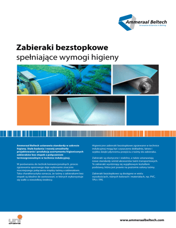 Zabieraki bezstopkowe spełniające wymogi higieny Ammeraal Beltech ustanawia standardy w zakresie higieny. Stałe badania i rozwój umożliwiły projektowanie i produkcję asortymentu higienicznych zabieraków bez stopek z połączeniem termozgrzewalnym w technice indukcyjnej. W porównaniu do technik konwencjonalnych, proces zgrzewania oporowego daje wykonanie znacznie mocniejszego połączenia między taśmą a zabierakiem. Taka charakterystyka oznacza, że taśmy z zabierakami bez stopek są idealne do zastosowań, w których wykorzystuje się wałki o niewielkiej średnicy. Higieniczne zabieraki bezstopkowe zgrzewane w technice indukcyjnej mogą być czyszczone dokładnie, łatwo i szybko dzięki płynnemu przejściu z taśmy do zabieraka. Zabieraki są elastyczne i stabilne, a także ustanawiają nowe standardy wśród akcesoriów taśm transportowych. Te zabieraki wyróżniają się wyjątkowym kształtem podstawy, która jest prawie na poziomie osłony taśmy. Zabieraki bezstopkowe są dostępne w wielu wysokościach, różnych kolorach i materiałach, np. PVC, TPU i TPE. www.ammeraalbeltech.com Ammeraal Beltech, członek Europejskiego Stowarzyszenia Inżynierów Konstruktorów Taśmy do artykułów żywnościowych są zgodne ze standardami EC1935/2004 i FDA Innovation & Service in Belting Korzyści z produktu Zastosowania Ze względu na konstrukcję geometryczną i właściwości fizyczne, zabieraki bez stopek zapewniają: Zabieraki bez stopek Ammeraal Beltech mogą być skutecznie stosowane tam, gdzie kluczowymi czynnikami są czystość, higiena i niewielkie średnice wałków. W efekcie zabieraki bezstopkowe są szczególnie przydatne do zastosowania w branżach spożywczych, takich jak: • Piekarnictwo • Cukiernictwo • Przetwórstwo mięsa i drobiu oraz ryb • Przetwórstwo owoców i warzyw • Nabiał • Zwiększona higiena › Łatwiejsze czyszczenie taśm i zabieraków › Mniejsza migracja zanieczyszczeń do produktu › Mniejszą ilość bakterii • Większą uniwersalność › Mniejsze średnice przewijania › Mniejsze uszkodzenia transportowanych produktów › Zwartą konstrukcję Ochrona przed mikroorganizmami zaczyna się od właściwej higieny i czystości. Obecne praktyki czyszczenia i higieny są istotne i należy je zachować. • Zwartą/nowoczesną konstrukcję przenośnika › Lepszy wygląd › Oszczędności kosztów › Oszczędności energii • Ładniejszy wygląd › Nowoczesna konstrukcja › Większą czystość elementów mechanicznych i taśmy • Oszczędność kosztów › Mniej materiałów stosowanych w przenośniku › Krótszy czas czyszczenia › Mniejsze zużycie energii ze względu na niższą wagę [1] • Dłuższą żywotność taśmy › Silniejsze, bardziej trwałe spoiwa [2] [1] Konwencjonalny zabierak [2] Higieniczny zabierak bez stopki • Łatwiejsze prowadzenie › Czystsze taśmy i mniej uszkodzeń • Dostępny szeroki asortyment › Dostępne różne wysokości › Dostępne różne materiały › Dostępne w różnych kolorach Data: 11/2011 Produkcja i serwis Pasy napędowe Pasy zębate Taśmy modułowe Taśmy bezkońcowe Taśmy transportujące Odpowiedzialne doradztwo Odpowiada na wszystkie potrzeby z zakresu taśm transportowych Lokalne stany magazynowe i usługi www.ammeraalbeltech.com Te informacje mogą się zmieniać ze względu na ciągły rozwój. Ammeraal Beltech nie ponosi odpowiedzialności za nieprawidłowe wykorzystanie powyższych informacji. Ta informacja zastępuje poprzednią informację. Wszystkie działania i usługi wykonywane przez Ammeraal Beltech podlegają ogólnym warunkom sprzedaży i dostawy, stosowanym przez firmy operacyjne. Ammeraal Beltech Holding B.V. Handelsstraat 1, P.O. Box 38 1700 AA Heerhugowaard Holandia T +31 (0)72 57 51 212 F +31 (0)72 57 16 455 [email protected]