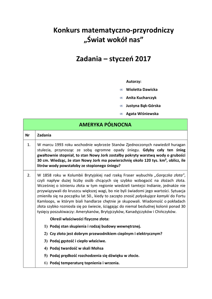 Konkurs matematyczno-przyrodniczy „Świat wokół nas” Zadania – styczeń 2017 Autorzy: • Wioletta Dawicka • Anita Kucharczyk • Justyna Bąk-Górska • Agata Wiśniewska AMERYKA PÓŁNOCNA Nr Zadania 1. W marcu 1993 roku wschodnie wybrzeże Stanów Zjednoczonych nawiedził huragan stulecia, przynosząc ze sobą ogromne opady śniegu. Gdyby cały ten śnieg gwałtownie stopniał, to stan Nowy Jork zostałby pokryty warstwą wody o grubości 30 cm. Wiedząc, że stan Nowy Jork ma powierzchnię około 120 tys. km², oblicz, ile litrów wody powstałoby ze stopionego śniegu? 2. W 1858 roku w Kolumbii Brytyjskiej nad rzeką Fraser wybuchła „Gorączka złota”, czyli napływ dużej liczby osób chcących się szybko wzbogacić na złożach złota. Wcześniej o istnieniu złota w tym regionie wiedzieli tamtejsi Indianie, jednakże nie przywiązywali do kruszcu większej wagi, bo nie byli świadomi jego wartości. Sytuacja zmieniła się na początku lat 50., kiedy to zaczęto znosić połyskujące kamyki do Fortu Kamloops, w którym biali handlarze chętnie je skupowali. Wiadomość o pokładach złota szybko rozniosła się po świecie, ściągając do niemal bezludnej kolonii ponad 30 tysięcy poszukiwaczy: Amerykanów, Brytyjczyków, Kanadyjczyków i Chińczyków. Określ właściwości fizyczne złota: 1) Podaj stan skupienia i rodzaj budowy wewnętrznej. 2) Czy złoto jest dobrym przewodnikiem cieplnym i elektrycznym? 3) Podaj gęstość i ciepło właściwe. 4) Podaj twardość w skali Mohsa 5) Podaj prędkość rozchodzenia się dźwięku w złocie. 6) Podaj temperaturę topnienia i wrzenia. INNOWCJA PEDAGOGICZNA „ŚWIAT WOKÓŁ NAS” Gimnazjum im. Kard. Stefana Wyszyńskiego w Starym Mieście 3. 2016/2017 Mając dane: - Przylądek Murchisona 71°58' N i Przylądek Punta Mariato 7°12' N - Przylądek Księcia Walii 168°05' W i Cape St. Charles 55°40' W - 1° łuku południka wynosi w przybliżeniu 111 km. 1) Oblicz rozciągłość południkową (w km) i równoleżnikową (w stopniach) Ameryki Północnej. 2) Oblicz, jaka jest różnica czasu słonecznego między przylądkami wysuniętymi najbardziej na wschód i zachód kontynentu? 4. Amerykański film fabularny pt. „Wodny świat” przedstawia przyszłość odległą od nas o około 500 lat. W wyniku globalnego ocieplenia czapy lodowe na biegunach stopniały, zalewając wodą wszystkie kontynenty. Ocalała ludzkość żyje w pływających miastach. Najcenniejszym towarem jest słodka woda. Kamil, zainspirowany filmem, odszukał w książce rysunek zestawu, który można wykorzystać, aby otrzymać wodę słodką z wody słonej. Źródło: Gallagher R. M., Ingram P., Whitehead P. (1996) Nowe vademecum ucznia. Chemia. Warszawa: Bertelsmann, s. 25. A: Korzystając z rysunku, oceń prawdziwość poniższych zdań. Lp. Zdanie 1) W miarę upływu czasu w probówce po lewej stronie ilość wody będzie maleć. Prawda czy fałsz? Prawda / Fałsz 2) W probówce po prawej stronie będzie wytrącać się sól. Prawda / Fałsz 3) Wyjęcie korka spowoduje szybsze stopienie lodu. Prawda / Fałsz Strona 2 z 3 INNOWCJA PEDAGOGICZNA „ŚWIAT WOKÓŁ NAS” Gimnazjum im. Kard. Stefana Wyszyńskiego w Starym Mieście 2016/2017 B: Śnieg powstaje wskutek zestalenia w atmosferze ziemskiej pary wodnej. Jak nazywa się to zjawisko? C: Jak nazywa się proces otrzymywania soli ze słonej wody np. wskutek odparowania wody? 5. Przeczytaj tekst dotyczący lasów liściastych strefy umiarkowanej, a następnie wykonaj kolejne polecenia. Sprawdź w słowniku ekologicznym, jakie wyróżniamy typy rozmieszczenia organizmów, jakie zależności w przyrodzie występują między organizmami oraz znaczenie pojęcia konsumenci. Lasy liściaste to naturalne ekosystemy w strefie umiarkowanej Europy i Ameryki Północnej; występują one także w krainach o umiarkowanym klimacie na półkuli południowej. Gdy zima odchodzi, las się zazielenia. Najpierw pojawiają się przylaszczki i zawilce, które wydają kwiaty i owoce zanim korony drzew pokryją się liśćmi, pozbawiając je słonecznego światła. Drzewa, takie jak: dęby, buki, klony, jesiony, wytwarzają liście. Jednak często ich liście są zjadane przez dorosłe owady i ich larwy. Obfitość owadów zapewnia ptakom, takim jak pliszka czy sikora, bogate w białko pożywienie dla piskląt. Również jeże odżywiają się owadami. Jelenie i sarny żywią się roślinami runa leśnego. We wszystkich piętrach lasu żyją drapieżniki. Polujące pająki atakują małe bezkręgowce na dnie lasu, a wysoko w górze drapieżne jastrzębie i krogulce polują na małe ptaki. Jesienią niektóre ptaki szykują się do odlotu. Sójki szukają żołędzi. Liście drzew i krzewów stają się brązowe, czerwone i złote. Grzyby, takie jak koźlarze, wyrastają w pobliżu brzóz. A. Wypisz nazwy rodzajowe wszystkich konsumentów. B. Określ zależność między wymienionymi organizmami. Organizm I Organizm II zawilec dąb dąb brudnica koźlarz brzoza Zależność C. Uzupełnij zdanie. Jastrzębie i krogulce charakteryzuje rozmieszczenie ......................................... D. Utwórz łańcuch pokarmowy, który istnieje w lesie liściastym strefy umiarkowanej. bakterie i grzyby Strona 3 z 3