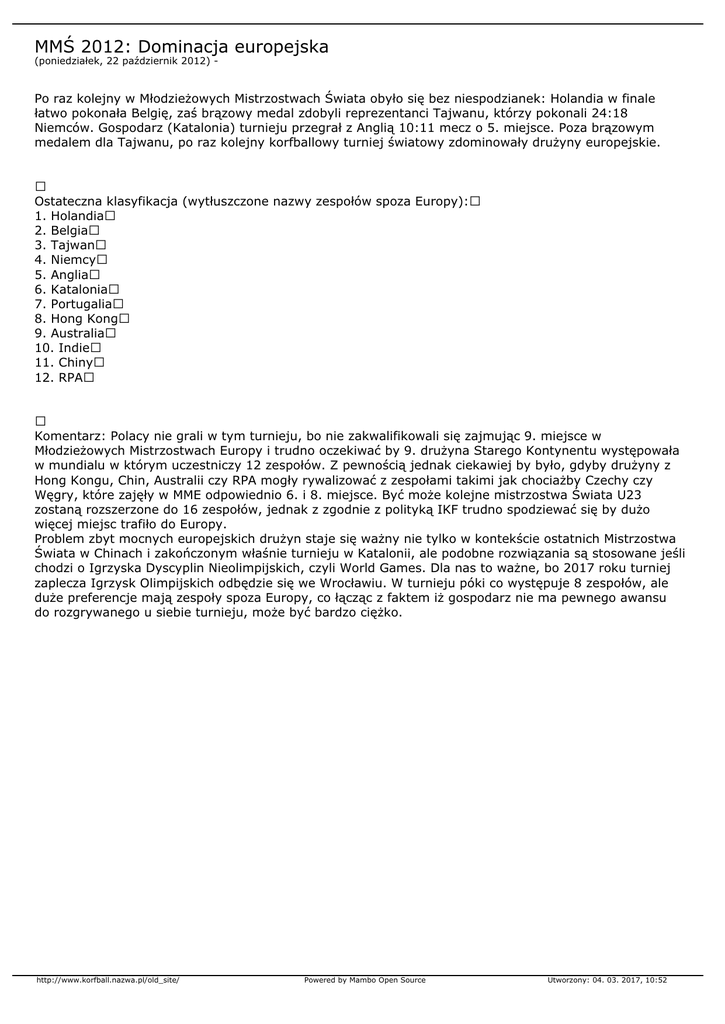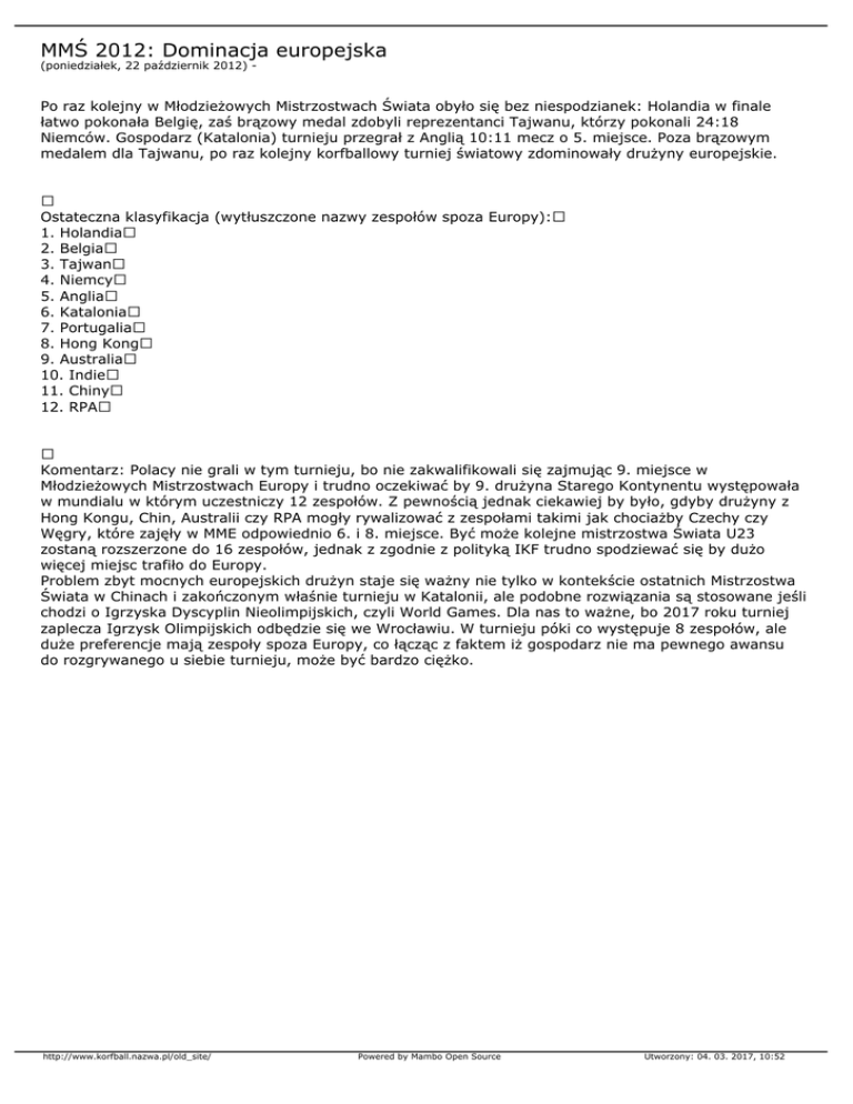 MMŚ 2012: Dominacja europejska (poniedziałek, 22 październik 2012) - Po raz kolejny w Młodzieżowych Mistrzostwach Świata obyło się bez niespodzianek: Holandia w finale łatwo pokonała Belgię, zaś brązowy medal zdobyli reprezentanci Tajwanu, którzy pokonali 24:18 Niemców. Gospodarz (Katalonia) turnieju przegrał z Anglią 10:11 mecz o 5. miejsce. Poza brązowym medalem dla Tajwanu, po raz kolejny korfballowy turniej światowy zdominowały drużyny europejskie. Ostateczna klasyfikacja (wytłuszczone nazwy zespołów spoza Europy): 1. Holandia 2. Belgia 3. Tajwan 4. Niemcy 5. Anglia 6. Katalonia 7. Portugalia 8. Hong Kong 9. Australia 10. Indie 11. Chiny 12. RPA Komentarz: Polacy nie grali w tym turnieju, bo nie zakwalifikowali się zajmując 9. miejsce w Młodzieżowych Mistrzostwach Europy i trudno oczekiwać by 9. drużyna Starego Kontynentu występowała w mundialu w którym uczestniczy 12 zespołów. Z pewnością jednak ciekawiej by było, gdyby drużyny z Hong Kongu, Chin, Australii czy RPA mogły rywalizować z zespołami takimi jak chociażby Czechy czy Węgry, które zajęły w MME odpowiednio 6. i 8. miejsce. Być może kolejne mistrzostwa Świata U23 zostaną rozszerzone do 16 zespołów, jednak z zgodnie z polityką IKF trudno spodziewać się by dużo więcej miejsc trafiło do Europy. Problem zbyt mocnych europejskich drużyn staje się ważny nie tylko w kontekście ostatnich Mistrzostwa Świata w Chinach i zakończonym właśnie turnieju w Katalonii, ale podobne rozwiązania są stosowane jeśli chodzi o Igrzyska Dyscyplin Nieolimpijskich, czyli World Games. Dla nas to ważne, bo 2017 roku turniej zaplecza Igrzysk Olimpijskich odbędzie się we Wrocławiu. W turnieju póki co występuje 8 zespołów, ale duże preferencje mają zespoły spoza Europy, co łącząc z faktem iż gospodarz nie ma pewnego awansu do rozgrywanego u siebie turnieju, może być bardzo ciężko. http://www.korfball.nazwa.pl/old_site/ Powered by Mambo Open Source Utworzony: 04. 03. 2017, 10:52