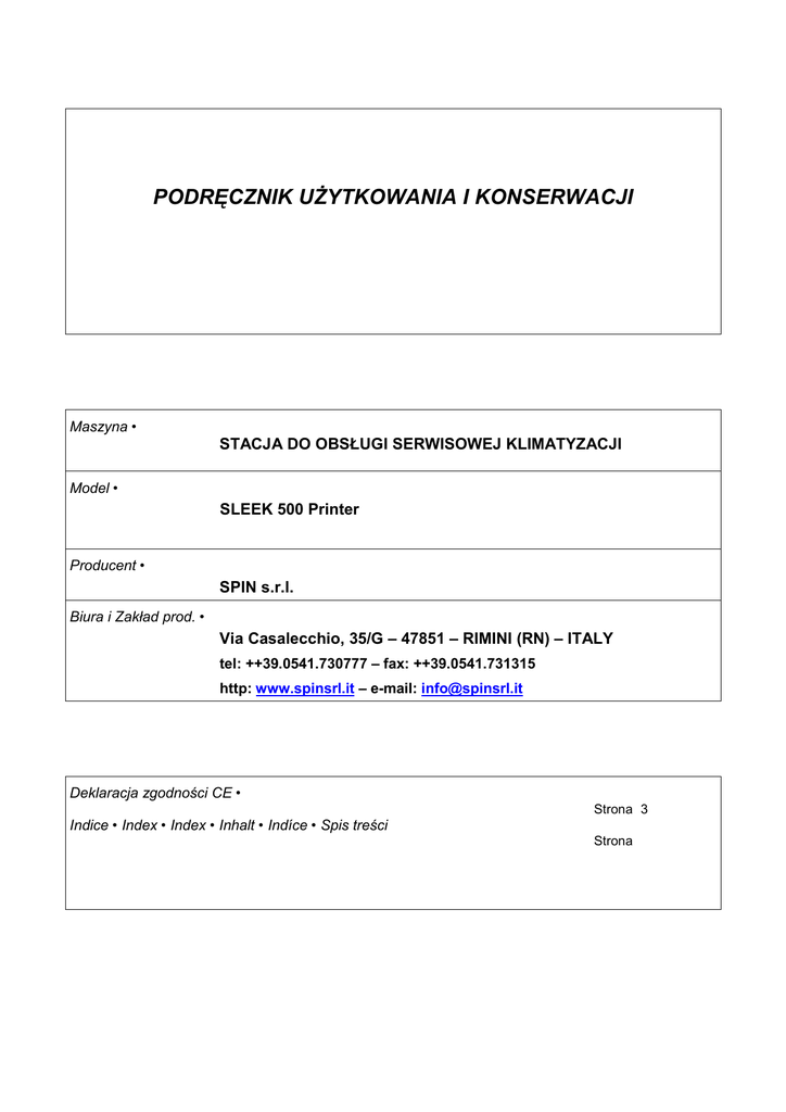 PODRĘCZNIK UŻYTKOWANIA I KONSERWACJI Maszyna • STACJA DO OBSŁUGI SERWISOWEJ KLIMATYZACJI Model • SLEEK 500 Printer Producent • SPIN s.r.l. Biura i Zakład prod. • Via Casalecchio, 35/G – 47851 – RIMINI (RN) – ITALY tel: ++39.0541.730777 – fax: ++39.0541.731315 http: www.spinsrl.it – e-mail: [email protected] Deklaracja zgodności CE • Strona 3 Indice • Index • Index • Inhalt • Indíce • Spis treści Strona DEKLARACJA ZGODNOŚCI CE SPIN srl Biura i Zakł. Prod. • Offices & Factory • Bureaux et Usine • Büro und Werk • Oficinas y Establecimiento 47851 – RIMINI (RN) – ITALY – Via Casalecchio, 35/G DELARUJE, że niżej opisany fabrycznie nowy produkt: MODEL NUMER SERYJNY SLEEK 500 Printer ____________________ ROK PRODUKCJI ____________________ JEST ZGODNY, z wymogami bezpieczeństwa oraz wymogami Normy CE: 98/37/CE NORMA BEZPIECZEŃSTWA MASZYN 73/23/CE 93/68/CE NORMA NISKIEGO NAPIĘCIA Z KOLEJNYMI ZMIANAMI 2004/108/CE NORMA ZGODNOŚCI ELEKTROMAGNETYCZNEJ 97/23/CE NORMA URZĄDZEŃ POD CIŚNIENIEM Rimini, _______________________ inż. Focchi Marco PODRĘCZNIK UŻYTKOWANIA I KONSERWACJI SPIS TREŚCI Gwarancja str. 5 Ostrzeżenia str. 5 Uwagi dotyczące środowiska str. 5 Rozdz. 1 – Informacje ogólne str. 6 Rozdz. 2 – Dane techniczne str. 7 Rozdz. 3 – Instalacja i urządzenia bezpieczeństwa str. 8 Rozdz. 4 – Opis stacji str. 9 Rozdz. 5 – Przygotowanie stacji str. 10 Rozdz. 6 – Użycie stacji – Załadunek gazu – Kontrola ciśnienia klimatyzacji – Cykl ręczny – Cykl pół-automatyczny – Cykl automatyczny – Bank danych – Mycie systemu klimatyzacji – Załadunek gazu – Operator – Narzędzia – Drukowanie wykonanych czynności – Ogrzewanie butli wewnętrznej str. 11 Rozdz. 7 – Konserwacja zwykła str. 17 Rozdz. 8 – Bank danych osobistych str. 19 GWARANCJA Maszyna objęta jest gwarancją 12 miesięczną od daty dostawy. Gwarancja nie pokrywa sprężarki i pompy próżniowej, jeżeli używane będą one z nieodpowiednim smarem lub na sucho. OSTRZEŻENIA Symbol ten używany jest, gdy nie zastosowanie się lub błędne interpretowanie instrukcji obsługi może wyrządzić szkodę osobom. Jako uzupełnienie zawartych w podręczniku informacji podajemy kilka sposobów użycia stacji: • • • • Towarzyszyć stacji podczas przemieszczania jej i wyhamować podczas użycia; Nie narażać stacji na temperaturę > 45 °C; używanie stacji na zewnątrz powinno być ograniczone wyłącznie do czasu wykonania danej czynności; Nie używać stancji w środowisku zagrożonym wybucham; Używać stacji w pomieszczeniach chcących ją przed deszczem. UWAGI DOTYCZĄCE ŚRODOWISKA HAŁAS Stacja ma wartość Lep mniejszą niż 70 db(A). Jeżeli stacja znajduje się w miejscu, w którym poziom hałasu jest większy niż 80 db(A), pracodawca zobowiązany jest poinformować operatorów o zagrożeniach wynikających z ekspozycji na hałas oraz, po konsultacji z upoważnionym lekarzem, zapewnić odpowiednie zabezpieczenia. OPAKOWANIE Nie wyrzucać do śmieci ewentualnych elementów opakowania, tylko dokonać segregacji według ich typu materiału (np.: tektura, drewno, materiały plastikowe itp.) i dokonać ich likwidacji zgodnie z obowiązującymi normami lokalnymi i narodowymi. WYŁĄCZENIE Z UŻYCIA Po zakończeniu żywotności maszyny konieczne jest: • Dezaktywowanie Stacji, odłączając ją od sieci zasilania elektrycznego oraz odcinając przewód zasilania; • Zdemontowanie Panelu Elektrycznego i odpowiedniej karty elektrycznej • Zdemontowanie części i posegregowanie ich według typów. LIKWIDACJA Po zakończeniu używania Maszyny konieczne jest zlikwidowanie jej elementów posegregowanych według typów zgodnie z obowiązującymi normami lokalnymi i krajowymi. W szczególności odnośnie części elektrycznych i elektronicznych określonych, jako „Odpady Aparatury Elektrycznej i Elektronicznej” (OAEE) stosować się do ustawy 151/2005 z późniejszymi poprawkami norm 2002/95/CE, 2002/96/CE i 2003/108/CE dotyczących likwidacji substancji niebezpiecznych w aparaturze elektrycznej i elektronicznej oraz likwidacji odpadów; Producent zaleca: • Nie wyrzucać ich jako odpadów miejskich i dokonać ich podziału; • Dowiedzieć sie w punktach dokonujących tego typu likwidacji jak przeprowadzić ją właściwie; • Przestrzegać norm właściwego zarządzania odpadami, aby nie dopuścić do zaszkodzenia środowisku lub ludzkiemu zdrowiu; • Symbol znajdujący się obok oznacza konieczność przeprowadzenia segregacji aparatury elektrycznej i elektronicznej podczas złomowania. • Firma, która nie dokona podziału według OAEE, obciążona zostanie karą administracyjną wysokości od € 30.000,00 do € 100.000,00. ROZDZ. 1 – INFORMACJE OGÓLNE 1.1 CEL PODRĘCZNIKA Podręcznik ten dotyczy użycia i konserwacji stacji, regeneracji, recyklingu, opróżniania i napełniania SLEEK 500 PRINTER, i stanowi kompletny przewodnik po użytkowaniu maszyny oraz jej okresowej konserwacji. Aby właściwie operować opisaną maszyną konieczne jest dokładne zapoznanie się z niniejszym podręcznikiem. Maszyna wyposażona jest w urządzenia bezpieczeństwa mające na celu zabezpieczenie operatora przed ewentualnymi zagrożeniami. Producent nie ponosi odpowiedzialności za niewłaściwe użycie maszyny oraz odłączenie przez użytkownika tych urządzeń bezpieczeństwa. Podręcznik ten stanowi integralną część maszyny i powinien zawsze jej towarzyszyć, również w razie ewentualnej sprzedaży. Maszyna identyfikowana jest dzięki tabliczce, na której wskazany jest model, rok produkcji i numer seryjny. Tabliczka znajduje się z boku stacji (rys.1). Rys.1 UWAGA APARATURA TA PRZEZNACZONA JEST WYŁĄCZNIE DO UŻYTKU PRZEZ SPECJALISTÓW, KTÓRZY SĄ OBOWIĄZANI ZNAĆ SYSTEMY CHŁODZĄCE, GAZY CHŁODZĄCE ORAZ EWENTUALNE ZAGROŻENIA, KTÓRE MOGĄ POWODOWAĆ URZĄDZENIE POD CIŚNIENIEM. URZĄDZENIE SLEEK 500 PRINTER MOŻE DOKONAĆ