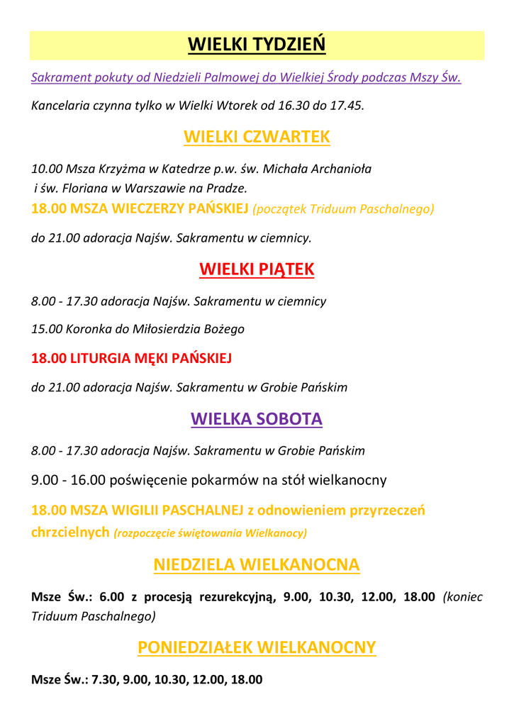 WIELKI TYDZIEŃ Sakrament pokuty od Niedzieli Palmowej do Wielkiej Środy podczas Mszy Św. Kancelaria czynna tylko w Wielki Wtorek od 16.30 do 17.45. WIELKI CZWARTEK 10.00 Msza Krzyżma w Katedrze p.w. św. Michała Archanioła i św. Floriana w Warszawie na Pradze. 18.00 MSZA WIECZERZY PAŃSKIEJ (początek Triduum Paschalnego) do 21.00 adoracja Najśw. Sakramentu w ciemnicy. WIELKI PIĄTEK 8.00 - 17.30 adoracja Najśw. Sakramentu w ciemnicy 15.00 Koronka do Miłosierdzia Bożego 18.00 LITURGIA MĘKI PAŃSKIEJ do 21.00 adoracja Najśw. Sakramentu w Grobie Pańskim WIELKA SOBOTA 8.00 - 17.30 adoracja Najśw. Sakramentu w Grobie Pańskim 9.00 - 16.00 poświęcenie pokarmów na stół wielkanocny 18.00 MSZA WIGILII PASCHALNEJ z odnowieniem przyrzeczeń chrzcielnych (rozpoczęcie świętowania Wielkanocy) NIEDZIELA WIELKANOCNA Msze Św.: 6.00 z procesją rezurekcyjną, 9.00, 10.30, 12.00, 18.00 (koniec Triduum Paschalnego) PONIEDZIAŁEK WIELKANOCNY Msze Św.: 7.30, 9.00, 10.30, 12.00, 18.00