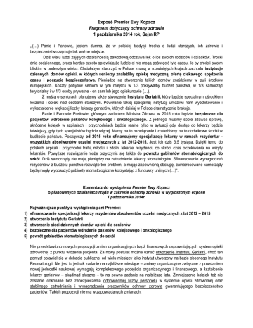 Exposé Premier Ewy Kopacz Fragment dotyczący ochrony zdrowia 1 października 2014 rok, Sejm RP ,,(…) Panie i Panowie, jestem dumna, że w polskiej tradycji troska o ludzi starszych, ich zdrowie i bezpieczeństwo zajmuje tak ważne miejsce. Dziś wielu ludzi zajętych działalnością zawodową odczuwa lęk o los swoich rodziców i dziadków. Troski dnia codziennego, praca bardzo często sprawiają że ludzie ci nie mogą poświęcić tyle czasu, ile by chcieli swoim bliskim w podeszłym wieku. Chciałabym stworzyć w Polsce znaną w rozwiniętych krajach zachodu instytucje dziennych domów opieki, w których seniorzy znaleźliby opiekę medyczną, ofertę ciekawego spędzenia czasu i poczucie bezpieczeństwa. Pieniądze na stworzenie takich domów znajdziemy w puli środków europejskich. Koszty pobytów seniora w tym miejscu w 1/3 pokrywałby budżet państwa, w 1/3 samorząd terytorialny i w 1/3 osoby prywatne - on sam lub jego opiekunowie (…). Z myślą o seniorach planujemy także stworzenie Instytutu Geriatrii, który będzie specjalnym ośrodkiem leczenia i opieki nad osobami starszymi. Powołanie takiej specjalnej instytucji umożliwi nam wyedukowanie i wykształcenie większej liczby lekarzy geriatrów, których dzisiaj w Polsce dramatycznie brakuje. Panie i Panowie Posłowie, głównym zadaniem Ministra Zdrowia w 2015 roku będzie bezpieczne dla pacjentów wdrożenie pakietów kolejkowego i onkologicznego. Z jednego musimy sobie zdawać sprawę, skrócenie kolejek w szpitalach i przychodniach będzie realne tylko w sytuacji gdy dostęp do lekarzy będzie łatwiejszy, gdy tych specjalistów będzie więcej. Mamy na to rozwiązanie i znaleźliśmy na to dodatkowe środki w budżecie państwa. Począwszy od 2015 roku sfinansujemy specjalizację lekarzy w ramach rezydentur wszystkich absolwentów uczelni medycznych z lat 2012-2015. Jest ich dziś 3,5 tysiąca. Dzięki temu do polskich szpitali i przychodni trafią młodzi i zdolni lekarze rezydenci, co skróci czas oczekiwania na wizyty lekarskie. Powyższe rozwiązanie może przyczynić się także do powrotu gabinetów stomatologicznych do szkół. Dziś samorządy nie mają pieniędzy na zatrudnienie lekarzy stomatologów. Sfinansowanie wynagrodzeń rezydentów z budżetu państwa rozwiąże ten problem, a mając zapewnioną obsługę, zainteresowane samorządy będą mogły wyposażyć gabinety stomatologiczne korzystając z funduszy unijnych (…)”. Komentarz do wystąpienia Premier Ewy Kopacz o planowanych działaniach rządu w zakresie ochrony zdrowia w wygłoszonym expose 1 października 2014r. 1) 2) 3) 4) 5) Najważniejsze punkty z wystąpienia pani Premier: sfinansowanie specjalizacji lekarzy rezydentów absolwentów uczelni medycznych z lat 2012 – 2015 stworzenie Instytutu Geriatrii stworzenie sieci dziennych domów opieki dla seniorów bezpieczne dla pacjentów wdrożenie pakietów: kolejkowego i onkologicznego powrót gabinetów stomatologicznych do szkół Nie przedstawiono nowych propozycji zmian organizacyjnych bądź finansowych usprawniających system opieki zdrowotnej z punktu widzenia pacjenta. Za nowy postulat można uznać utworzenie Instytutu Geriatrii, choć ten pomysł pojawiał się w debacie publicznej od wielu miesięcy jako instytut utworzony na bazie obecnego Instytutu Reumatologii. Nie jest to jednak zadanie na najbliższe miesiące – zmiany organizacyjne związane z powstaniem nowej jednostki naukowej wymagają kompleksowego podejścia organizacyjnego i finansowego, a kształcenie lekarzy geriatrów – skądinąd słuszne – to na pewno zadanie na najbliższe lata. Zmniejszenie kolejek też nie zostanie dokonane bez zabezpieczenia odpowiedniej liczby personelu w systemie opieki zdrowotnej oraz stabilnego zatrudniania i wynagradzania pracowników ochrony zdrowia gwarantującego bezpieczeństwo pacjentów. Takich propozycji nie ma w zapowiadanych zmianach. W ocenie OPZZ obecnie najistotniejszymi barierami z punktu widzenia pacjenta, powodującymi społeczne nierówności w zdrowiu są widoczna i odczuwalna poprawa dostępności pacjentów do świadczeń opieki zdrowotnej w Polsce oraz wzrastające ceny leków. Na ten temat Prezes Rady Ministrów nie przedstawił żadnych propozycji. Propozycje konkretnych działań OPZZ do rozważenia na rzecz realizacji ww. postulatów: domaganie się zniesienia limitów na świadczenia finansowane przez NFZ w tych zakresach świadczeń zdrowotnych gdzie jest długi czas oczekiwania (specjalizacje deficytowe: okulistyka, niektóre rodzaje specjalizacji chirurgicznych, dermatologia i inn.) – nie tylko w onkologii konieczność określenia maksymalnych (granicznych) terminów, w których pacjentowi powinno być udzielone świadczenie zdrowotne, we wszystkich rodzajach świadczeń – zgodnie z konstytucyjnym prawem każdego obywatela do ochrony zdrowia zakres świadczeń finansowanych ze środków publicznych NFZ nie może być zmniejszany - ,,koszyki świadczeń gwarantowanych” są stale modyfikowane i tak naprawdę pacjent nie ma wiedzy jakie świadczenie jest mu należne refundacja ze środków publicznych leków dla najuboższych (bądź leki darmowe dla określonych grup pacjentów) ,,Tanie leki dla najmniej zarabiających” np. zależne od kryterium dochodowego świadczeniobiorcy czy płacy minimalnej jaką otrzymuje ,, Utworzenie Instytutu Geriatrii Instytut Geriatrii ma być centrum opieki medycznej nad osobami starszymi jest może i dobrym pomysłem ale brakuje szczegółów. Intencją jest wykształcić w Polsce odpowiednią liczbę geriatrów i przede wszystkim przeszkolić w jednym miejscu wszystkich tych lekarzy, którzy sprawują opiekę medyczną nad osobami starszymi. Powstanie Instytutu ma umożliwić prowadzenie kompleksowych badań i terapii w dziedzinie geriatrii, co jest szczególnie ważne w obliczu rosnących potrzeb związanych z opieką nad osobami starszymi. Zmniejszenie kolejek do lekarzy i leczenie onkologiczne bez limitów 