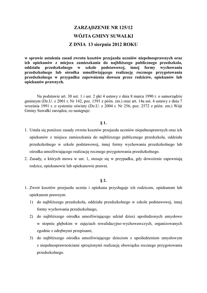 ZARZĄDZENIE NR 125/12 WÓJTA GMINY SUWAŁKI Z DNIA 13 sierpnia 2012 ROKU w sprawie ustalenia zasad zwrotu kosztów przejazdu uczniów niepełnosprawnych oraz ich opiekunów z miejsca zamieszkania do najbliższego publicznego przedszkola, oddziału przedszkolnego w szkole podstawowej, innej formy wychowania przedszkolnego lub ośrodka umożliwiającego realizację rocznego przygotowania przedszkolnego w przypadku zapewnienia dowozu przez rodziców, opiekunów lub opiekunów prawnych. Na podstawie art. 30 ust. 1 i ust. 2 pkt 4 ustawy z dnia 8 marca 1990 r. o samorządzie gminnym (Dz.U. z 2001 r. Nr 142, poz. 1591 z późn. zm.) oraz art. 14a ust. 4 ustawy z dnia 7 września 1991 r. o systemie oświaty (Dz.U. z 2004 r. Nr 256, poz. 2572 z późn. zm.) Wójt Gminy Suwałki zarządza, co następuje: § 1. 1. Ustala się poniższe zasady zwrotu kosztów przejazdu uczniów niepełnosprawnych oraz ich opiekunów z miejsca zamieszkania do najbliższego publicznego przedszkola, oddziału przedszkolnego w szkole podstawowej, innej formy wychowania przedszkolnego lub ośrodka umożliwiającego realizację rocznego przygotowania przedszkolnego. 2. Zasady, o których mowa w ust. 1, stosuje się w przypadku, gdy dowożenie zapewniają rodzice, opiekunowie lub opiekunowie prawni. § 2. 1. Zwrot kosztów przejazdu ucznia i opiekuna przysługuje ich rodzicom, opiekunom lub opiekunom prawnym: 1) do najbliższego przedszkola, oddziału przedszkolnego w szkole podstawowej, innej formy wychowania przedszkolnego, 2) do najbliższego ośrodka umożliwiającego udział dzieci upośledzonych umysłowo w stopniu głębokim w zajęciach rewalidacyjno-wychowawczych, organizowanych zgodnie z odrębnymi przepisami, 3) do najbliższego ośrodka umożliwiającego dzieciom z upośledzeniem umysłowym z niepełnosprawnościami sprzężonymi realizację obowiązku rocznego przygotowania przedszkolnego. § 3. 1. Upoważnia się Kierownika Gminnego Zespołu Ekonomiczno-Administracyjnego Szkół w Suwałkach do zawierania umów określających zasady zwrotu kosztów przejazdu ucznia niepełnosprawnego realizującego roczne przygotowanie przedszkolne i opiekuna z rodzicami, opiekunem lub opiekunem prawnym ucznia niepełnosprawnego. 2. Wzór umowy określającej zasady zwrotu kosztów przejazdu ucznia niepełnosprawnego realizującego roczne przygotowanie przedszkolne i opiekuna prywatnym samochodem osobowym stanowi Załącznik Nr 2. 3. Wzór umowy określającej zasady zwrotu kosztów przejazdu ucznia niepełnosprawnego realizującego roczne przygotowanie przedszkolne i opiekuna środkami komunikacji publicznej stanowi Załącznik Nr 3. § 4. 1. Podstawą zawarcia umowy określającej zasady zwrotu kosztów przejazdu ucznia niepełnosprawnego realizującego roczne przygotowanie przedszkolne i opiekuna jest złożenie w Gminnym Zespole Ekonomiczno-Administracyjnym Szkół w Suwałkach, ul. Kościuszki 71 wniosku, który stanowi Załącznik Nr 1 i jego pozytywne rozpatrzenie przez Kierownika Gminnego Zespołu Ekonomiczno-Administracyjnego Szkół w Suwałkach . 2. Wniosek o którym mowa w ust. 1 należy złożyć do dnia 14 sierpnia każdego roku. 3. W uzasadnionych przypadkach wniosek może być złożony po upływie terminu określonego w ust. 2. § 5. Podstawą obliczenia kwoty zwrotu kosztów dowozu uczniów niepełnosprawnych stanowi: 1) w przypadku przejazdu ucznia i opiekuna środkami komunikacji publicznej – równowartość ceny przedstawionych 2 biletów miesięcznych/biletów jednorazowych z uwzględnieniem ulgi wynikającej z ustawy z dnia 20 czerwca 1992 r. o uprawnieniach ulgowych przejazdu środkami transportu zbiorowego (Dz.U. z 2002 r. Nr 175, poz. 1440 z późn. zm.). 2) w przypadku dowożenia ucznia prywatnym samochodem przez rodzica, opiekuna lub opiekuna prawnego przyjmuje się 100% stawki za kilometr przebiegu pojazdu określoną w rozporządzeniu Ministra Infrastruktury z dnia 25 marca 2002 r. w sprawie warunków ustalania oraz sposobu dokonywania zwrotu kosztów używania do celów służbowych samochodów osobowych, motocykli i motorowerów niebędących własnością pracodawcy (Dz.U. z 2002 r. Nr 27, poz. 271 z późn. zm.) obowiązującej w dniu podpisania umowy. § 6. 1. Wysokość miesięcznej kwoty zwrotu kosztów dowozu w przypadku, o którym mowa w § 5 pkt 2 jest obliczana jako: podwójny iloczyn odległości z miejsca zamieszkania ucznia do przedszkola, oddziału przedszkolnego w szkole podstawowej, innej formy wychowania przedszkolnego lub ośrodka, stawki za kilometr przebiegu i liczby dni obecności ucznia w przedszkolu, oddziale przedszkolnym w szkole podstawowej, innej formy wychowania przedszkolnego lub ośrodku w miesiącu rozliczeniowym. 2. Za dni nieobecności ucznia w przedszkolu, oddziale przedszkolnym w szkole podstawowej, innej formy wychowania przedszkolnego lub ośrodku zwrot kosztów nie przysługuje. 3. Liczba dni obecności dziecka w przedszkolu, oddziale przedszkolnym w szkole podstawowej, innej formy wychowania przedszkolnego lub ośrodku musi być poświadczona podpisem dyrektora lub upoważnionej osoby. 4. Odległość pomiędzy miejscem zamieszkania, a przedszkolem, oddziałem przedszkolnym w szkole podstawowej, innej formy wychowania przedszkolnego lub ośrodkiem jest rozumiana jako długość najkrótszej trasy łączącej te dwa miejsca. § 7. 1. Rodzic, opiekun lub opiekun prawny, który podpisał umowę, o której mowa w § 4, aby otrzymać zwrot kosztów przejazdu składa w Gminnym Zespole EkonomicznoAdministracyjnym Szkół w Suwałkach rachunek o zwrot kosztów przejazdu ucznia niepełnosprawnego realizującego roczne przygotowanie przedszkolne oraz jego opiekuna, którego wzór stanowi załącznik do przedmiotowej umowy. 2. Rachunek należy złożyć nie później niż do 10 dnia miesiąca następującego po miesiącu w którym realizowano dowóz ucznia. W szczególnie uzasadnionych przypadkach rachunek może być złożony upływie terminu. 3. Wypłata środk