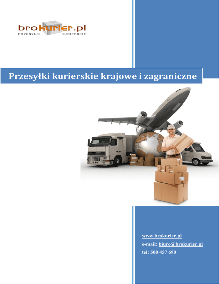 Przesyłki kurierskie krajowe i zagraniczne www.brokurier.pl e-mail: [email protected] tel: 500 457 690 Firma brokurier.pl jest platformą pośredniczącą w wysyłce paczek krajowych jak i zagranicznych. Współpracujemy z największymi kurierami w branży między innymi UPS Polska, DHL Polska, GLS Group Wysłać paczkę może każda osoba lub firma w dowolnym czasie korzystając przy tym z najniższych cen (bez żadnej umowy i zobowiązań) których nie uzyska bezpośrednio w firmie kurierskiej. Paczki są odbierane przez wybranego kuriera ze wskazanego przez Ciebie miejsca. Jedynie co trzeba zrobić to wypełnić odpowiedni formularz wysyłkowy na naszej stronie www.brokurier.pl wydrukować list przewozowy i paczka jest gotowa do odbioru, Kurier przyjedzie po paczkę pod wskazany adres w wybranym przez Ciebie terminie. Dzięki naszej stałej współpracy z firmami kurierskimi każda paczka wysłana za pośrednictwem naszej platformy jest traktowana z najwyższym priorytetem. Zapewniamy szybką fachową i profesjonalną obsługę dla każdego klienta. Stałym klientom zapewniamy pełen panel obsługi dzięki któremu wysyłka paczek będzie jeszcze prostsza oraz atrakcyjne rabaty. Nasza oferta jest przeznaczona dla osób które wysyłają sporadyczne ilości oraz dla firm i sklepów które wysyłają większą ilość paczek. Nie musisz posiadać firmy aby mieć niskie ceny za wysyłki kurierskie !!!!!! Poniższa oferta nie dotyczy firm które posiadają aktywny numer rozliczeniowy z firmą UPS Polska Cennik krajowy UPS UPS Standard UPS Saver* UPS Express** UPS Express + Sobota*** Waga netto z dopłatą paliwową. netto z dopłatą paliwową. netto z dopłatą paliwową. netto z dopłatą paliwową. do 30 kg 17,97 zł 19,08 zł 48,39 zł 70,44 zł 30-40 kg 30,52 zł 38,15 zł 70,59 zł 91,06 zł 40-50 kg 39,24 zł 38,15 zł 70,59 zł 91,06 zł 50-60 kg 44,69 zł 38,15 zł 99,13 zł 117,55 zł 60-70 kg 55,59 zł 45,78 zł 99,13 zł 117,55 zł Uwaga: cena netto z dopłata paliwową może lekko ulec zmianie jest to zależne od stawki paliwowej przewoźnika *- gwarantowane doręczanie paczki następnego dnia roboczego **- doręczenie paczki do godziny 12.00 ***- doręczenie paczki w sobotę do godziny 12.00 Opłaty dodatkowe Rodzaj usługi lub dopłaty* zwrot nie doręczonej przesyłki ubezpieczenie do 300 PLN ubezpieczenie 300 PLN - 50 000 PLN paczki krajowej ubezpieczenie 300 PLN - 50 000 PLN paczki zagranicznej doręczenie i odbiór w strefie rozszerzonej w kraju doręczenie i odbiór w strefie rozszerzonej za granicą pobranie Pobranie expres ** paczka niestandardowa paczka nadwymiarowa (duża paczka) Cena równowartość wysyłki w cenie usługi 2,5 zł 1,5% wartości ubezpieczenia 15 zł 70 zł 5 zł + 0,3% kwoty pobrania 15 zł + 0,1 % kwoty pobrania 10 zł 150 zł pisemne wezwanie do zapłaty 50 zł *-Podane ceny są cenami netto **- zwrot pobrania w ciągu 48h od doręczania przesyłki www.brokurier.pl [email protected] Cennik krajowy DHL paczki i palety Typ przesyłki Waga netto Cena netto z dopłatą paliw. Paczka od 0 do 31,5 kg 16,10 zł 18,76 zł Paleta* 200 kg 134,76 zł 157,00 zł Paleta* 400 kg 143,93 zł 167,68 zł Paleta* 1000 kg 164,99 zł 192,21 zł *- paleta euro podstawie 120x80 lub mniejszej, maksymalna wysokość palety 200 cm **- podane ceny są cenami netto Cennik zagraniczny GLS Po złożeniu zlecenia na stronie kurier przyjeżdża z wydrukowanym listem. Klient nie musi drukować listu Ceny zawierają wszystkie dopłaty takie jak dopłata paliwowa i drogowa Kraj Anglia do 2 kg 49,88 do 5 kg 82,08 do 10 kg 83,61 do 15 kg 88,21 do 25 kg 92,81 do 30 kg 95,87 do 40 kg 134,20 do 50 kg 147,99 Austria 42,22 63,68 71,34 77,48 85,14 88,21 106,60 117,33 Belgia 43,75 68,28 69,81 75,94 83,61 86,67 103,54 114,27 Bułgaria 49,88 114,27 118,87 121,93 129,60 129,60 140,33 155,66 Czechy 43,75 54,48 57,55 59,08 63,68 66,75 75,94 105,07 Dania 45,28 68,28 71,34 77,48 86,67 89,74 108,14 118,87 Estonia 63,68 83,61 86,67 91,27 98,94 102,00 154,13 170,99 Finlandia 89,74 147,99 151,06 154,13 161,79 166,39 282,90 318,16 Francja 57,55 86,67 89,74 92,81 98,94 102,00 143,40 157,19 Hiszpania 68,28 126,53 129,60 132,66 138,80 141,86 186,32 201,65 Holandia 45,28 65,21 68,28 74,41 82,08 86,67 105,07 115,80 Irlandia 98,94 143,40 144,93 147,99 154,13 157,19 193,98 207,78 Litwa 54,48 65,21 68,28 71,34 75,94 79,01 120,40 146,46 Luxemburg 46,82 63,68 66,75 74,41 83,61 88,21 108,14 120,40 Łotwa 59,08 75,94 77,48 77,48 82,08 85,14 115,80 129,60 Niemcy 39,15 54,48 57,55 63,68 68,28 72,88 125,00 143,40 Portugalia 59,08 118,87 123,47 128,07 138,80 138,80 147,99 158,73 Rumunia 68,28 112,74 115,80 118,87 128,07 128,07 137,26 152,59 Słowacja 43,75 71,34 74,41 80,54 86,67 86,67 95,87 111,20 Słowenia 54,48 92,81 97,41 102,00 109,67 115,80 123,47 131,13 Szwecja 68,28 100,47 105,07 111,20 120,40 123,47 184,79 204,72 Węgry 52,95 82,08 85,14 86,67 92,81 94,34 100,47 129,60 Włochy 60,61 94,34 95,87 100,47 106,60 108,14 149,53 164,86 *-Podane ceny są cenami netto www.brokurier.pl [email protected] Cennik usług zagranicznych Usługa UPS Standard Dostarczenie paczki w zależności od strefy od 3 do 7 dni roboczych Strefa 3 Czechy, Słowacja Strefa 4 Austria, Niemcy, Węgry Strefa 5 Belgia, Bułgaria, Dania, Estonia, Francja, Holandia, Litwa, Luksemburg, Łotwa, Monako, Rumunia Strefa 6 Anglia, Finlandia, Hiszpania, Włochy, Słowenia, Szwecja, Szkocja, Walia Strefa 7 Grecja, Irlandia, Portugalia (z wyłączeniem Azorów i Madery) Irlandia Północna Waga do 10 kg 11,0 kg 12,0 kg 13,0 kg 14,0 kg 15,0 kg 16,0 kg 17,0 kg 18,0 kg 19,0 kg 20,0 kg 21,0 kg 22,0 kg 23,0 kg 24,0 kg 25,0 kg 26,0 kg 27,0 kg 28,0 kg 29,0 kg 30,0 kg 31,0 kg 32,0 kg 33,0 kg 34,0 kg 35,0 kg od 35,1 do 40,0 kg od 40,1 do 45,0 kg od 45,1 do 50,0 kg od 50,1 do 55,0 kg od 55,1 do 60,0 kg od 60,1 do 65,0 kg od 65,1 do 70,0 kg Strefa 3 90,88 93,34 94,57 97,02 98,25 99,48 101,94 104,39 105,62 106,85 108,08 109,31 110,53 111,76 114,22 115,45 116,67 
