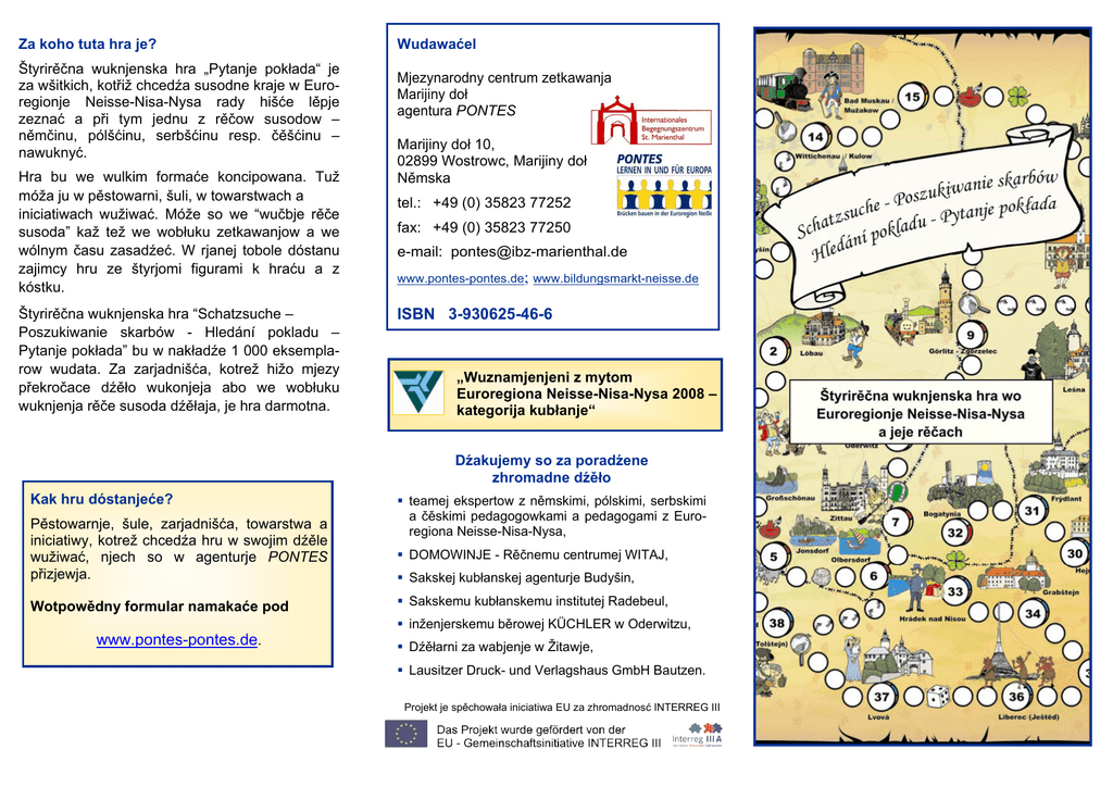 Za koho tuta hra je? Štyrirěčna wuknjenska hra „Pytanje pokłada“ je za wšitkich, kotřiž chcedźa susodne kraje w Euroregionje Neisse-Nisa-Nysa rady hišće lěpje zeznać a při tym jednu z rěčow susodow – němčinu, pólšćinu, serbšćinu resp. čěšćinu – nawuknyć. Hra bu we wulkim formaće koncipowana. Tuž móža ju w pěstowarni, šuli, w towarstwach a iniciatiwach wužiwać. Móže so we “wučbje rěče susoda” kaž tež we wobłuku zetkawanjow a we wólnym času zasadźeć. W rjanej tobole dóstanu zajimcy hru ze štyrjomi figurami k hraću a z kóstku. Štyrirěčna wuknjenska hra “Schatzsuche – Poszukiwanie skarbów - Hledání pokladu – Pytanje pokłada” bu w nakładźe 1 000 eksemplarow wudata. Za zarjadnišća, kotrež hižo mjezy překročace dźěło wukonjeja abo we wobłuku wuknjenja rěče susoda dźěłaja, je hra darmotna. Wudawaćel Mjezynarodny centrum zetkawanja Marijiny doł agentura PONTES Marijiny doł 10, 02899 Wostrowc, Marijiny doł Němska tel.: +49 (0) 35823 77252 fax: +49 (0) 35823 77250 e-mail: [email protected] www.pontes-pontes.de; www.bildungsmarkt-neisse.de ISBN 3-930625-46-6 „Wuznamjenjeni z mytom Euroregiona Neisse-Nisa-Nysa 2008 – kategorija kubłanje“ Dźakujemy so za poradźene zhromadne dźěło Kak hru dóstanjeće? Pěstowarnje, šule, zarjadnišća, towarstwa a iniciatiwy, kotrež chcedźa hru w swojim dźěle wužiwać, njech so w agenturje PONTES přizjewja. Wotpowědny formular namakaće pod www.pontes-pontes.de. teamej ekspertow z němskimi, pólskimi, serbskimi a čěskimi pedagogowkami a pedagogami z Euroregiona Neisse-Nisa-Nysa, DOMOWINJE - Rěčnemu centrumej WITAJ, Sakskej kubłanskej agenturje Budyšin, Sakskemu kubłanskemu institutej Radebeul, inženjerskemu běrowej KÜCHLER w Oderwitzu, Dźěłarni za wabjenje w Žitawje, Lausitzer Druck- und Verlagshaus GmbH Bautzen. Projekt je spěchowała iniciatiwa EU za zhromadnosć INTERREG III w skar bó wanie kłada i k u osz j e po e-P Pytan such kladu z t a o Sch d ání p Hle ... w Euroregionje Neisse-Nisa-Nysa! Raz pokłady pytać – štó wo tym hišće sonił njeje? Na slědźerske pućowanje so podać, ludźi a kraje zeznawać a z přećelemi potajne dyrdomdeje wobstać – to jenož dźěći rady nječinja. Hra „Pytanje pokłada“ přeprošuje tuž wšitkich małych a wulkich pytarjow pokłada na cyle wosebite wotkrywanske pućowanje po Euroregionje Neisse-Nisa-Nysa. Pytajo w Euroregionje Neisse-Nisa-Nysa za pokładom zeznaja dźěći městna, kotrež jim poskićuja starobje wotpowědowace zajimawe dožiwjenja (wobhladanja hódne wěcy, wólnočasne zarjadnišća, regionalne a kulturne wosebitosće atd.) w štyrjoch rěčnych rumach třoch susodnych krajow Němskeje, Pólskeje a Čěskeje. Zhromadnje z přećelemi dyrbja wšelake dyrdomdeje zmištrować a so při tym w rěčach susodow (němčinje – pólšćinje – čěšćinje) dorozumić. Hižo w lěće 2006 bě team němskich, pólskich, čěskich a serbskich pedagogow/kow a ekspert(k)ow zhromadnje z agenturu PONTES štyrirěčnu wuknjensku hru „Pytanje pokłada“ wo Euroregionje Neisse-Nisa-Nysa a jeje rěčach wuwił. Wuchadźejo z nazhonjenjow praksy při wužiwanju hry bu wona dospołnje předźěłana a ewaluowanej potrjebje přiměrjena. Druhemu nakładej hry su so nětko dalše atraktiwne dźěle přidružili … Zakładne wuhotowanje wuknjenskeje hry: Wudospołnjace dźěle hry za wužiwanje we „wučbje rěče susoda“: Hrajny plan symbolizuje pućowansku čaru po třoch susodnych krajach Němskej, Pólskej a Čěskej. Nawod k hrě wobsahuje zasadne prawidła kóstkowanskeje hry. Akciske kartki, kotrež so na ramikowym maćiznowym planje za wučbu w rěči susoda orientuja, móža so w třoch wšelakich stopjenjach ćežkosće při slědowacych temach we wučbje zasadźeć: „Ty, ja a moja swójba – mjezsobu rěčeć“ „Nakupowanje a drasta, jědź a piće“ „Swjedźenje a nałožki w běhu lěta, počasy“ We „Wujasnjenju symbolow“ rozkładuja so symbole na akciskich polach hrajneho plana. W přewodnej brošurje „Křinja pokładow“ so cyłkownje wšitkich 44 městnow dožiwjenja předstaji. Z pomocu wobrazowych kartkow, kotrež wotpowěduja starobje dźěći, móža so zakładne wokable w štyrjoch rěčach sposrědkować. W brošurje „Wujasnjenja wurjekowanja“ so zwuki susodnych rěčow we wotpowědnej maćeršćinje jednorje a zrozumliwje wujasnjeja. Wšitke dźěle hry předleža kompletnje w štyrjoch rěčach, t. r. w němčinje, pólšćinje, serbšćinje a čěšćinje. „Wólny čas, hobby“ „W šuli“ „Joker“ Zo by so pedagogowkam a pedagogam wolóžiło, hru jako wučbny a wuknjenski srědk we wučbje zasadźeć, bu přiručka ze wšelakimi hižo wupruwowanymi wariantami hry a praktiskimi pokiwami wuwita. Tute dźěle hry předleža wšitke w němčinje, pólšćinje, serbšćinje a čěšćinje.