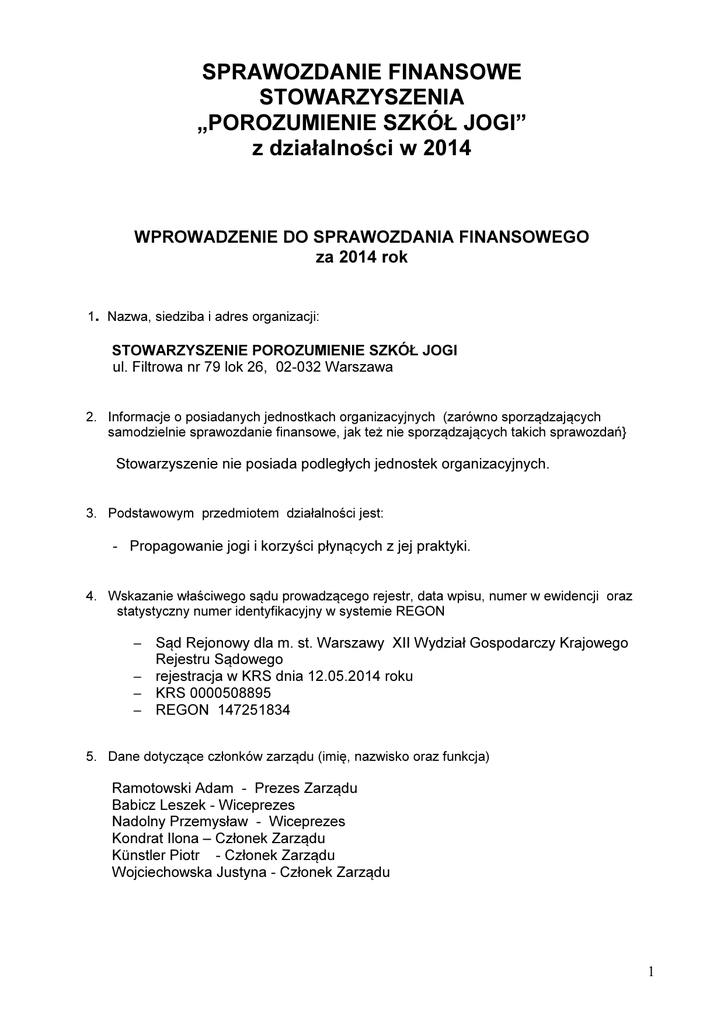 SPRAWOZDANIE FINANSOWE STOWARZYSZENIA „POROZUMIENIE SZKÓŁ JOGI” z działalności w 2014 WPROWADZENIE DO SPRAWOZDANIA FINANSOWEGO za 2014 rok 1. Nazwa, siedziba i adres organizacji: STOWARZYSZENIE POROZUMIENIE SZKÓŁ JOGI ul. Filtrowa nr 79 lok 26, 02-032 Warszawa 2. Informacje o posiadanych jednostkach organizacyjnych (zarówno sporządzających samodzielnie sprawozdanie finansowe, jak też nie sporządzających takich sprawozdań} Stowarzyszenie nie posiada podległych jednostek organizacyjnych. 3. Podstawowym przedmiotem działalności jest: - Propagowanie jogi i korzyści płynących z jej praktyki. 4. Wskazanie właściwego sądu prowadzącego rejestr, data wpisu, numer w ewidencji oraz statystyczny numer identyfikacyjny w systemie REGON – – – – Sąd Rejonowy dla m. st. Warszawy XII Wydział Gospodarczy Krajowego Rejestru Sądowego rejestracja w KRS dnia 12.05.2014 roku KRS 0000508895 REGON 147251834 5. Dane dotyczące członków zarządu (imię, nazwisko oraz funkcja) Ramotowski Adam - Prezes Zarządu Babicz Leszek - Wiceprezes Nadolny Przemysław - Wiceprezes Kondrat Ilona – Członek Zarządu Künstler Piotr - Członek Zarządu Wojciechowska Justyna - Członek Zarządu 1 6. Określenie celów statutowych organizacji 1. Propagowanie jogi i korzyści płynących z jej praktyki. 2. Rozwijanie i propagowanie inicjatyw, postaw i działań sprzyjających wszechstronnemu psychofizycznemu rozwojowi człowieka.. 3. Dbanie o wysokie standardy nauczania jogi. 4. Promocja wartości wypływających z jogi, w szczególności: uczciwości, szacunku i odpowiedzialności, zarówno w trakcie praktyki jogi, jak i w życiu codziennym oraz zawodowym. 5. Wspieranie organizacyjne i rzeczowe osób fizycznych i jednostek organizacyjnych zajmujących się nauczaniem jogi. 7. Wskazanie okresu trwania działalności organizacji. Czas nieokreślony. 8. Wskazanie okresu objętego sprawozdaniem finansowym. Od 01.05.2014r. do 31.12.2014r. 9. Roczne sprawozdanie sporządzono przy założeniu kontynuowania działalności przez, Stowarzyszenie przez co najmniej 12 miesięcy i dłużej. Nie występują okoliczności, które wskazywałyby na istnienie poważnych zagrożeń dla kontynuowania działalności Stowarzyszenia. 10. Przyjęte zasady rachunkowości, w tym metody wyceny aktywów i pasywów. Rachunkowość Stowarzyszenia prowadzona jest zgodnie z Rozporządzeniem Ministra Finansów z dnia 15 listopada 2001 roku w sprawie szczególnych zasad rachunkowości dla niektórych jednostek nie będących spółkami handlowymi, nie prowadzących działalności gospodarczej. (Dz..U. Nr 137, poz. 1539; zm. Dz .U. z 2003r. Nr 11, poz. 117) Przyjęte zasady rachunkowości stosuje się w sposób ciągły, dokonując w kolejnych latach obrotowych jednakowego grupowania operacji gospodarczych i jednakowej wyceny aktywów i pasywów. Sprawozdanie finansowe sporządza się tak, aby za kolejne lata informacje w nich zawarte były porównywalne. Stowarzyszenie nie posiada środków trwałych. Stowarzyszenie nie posiada wartości niematerialnych i prawnych. Warszawa, 05-03-2015 roku Sporządziła: Zofia Morawska podpisy członków zarządu: 2 STOWARZYSZENIE POROZUMIENIE SZKÓŁ JOGI ul. Filtrowa nr 79 lok 26, 02-032 Warszawa BILANS na dzień 31.12.2014 /zł/ Wiers z (poz.) 1 Wyszczególnienie Stan na dzień 31.12.2014. 12.05.2014 2 AKTYWA A. Aktywa trwałe I. II. III. IV. V. B. Wartości niematerialne i prawne Rzeczowe aktywa trwałe Należności długoterminowe Inwestycje długoterminowe Długoterminowe rozliczenia międzyokresowe Aktywa obrotowe I. II. III. 1. C. 3 049,23 0,00 3 049,23 3 049,23 0,00 0,00 3 049,23 0,00 Fundusze własne 3 049,23 0,00 Fundusz statutowy Fundusz z aktualizacji wyceny Wynik finansowy netto za rok obrotowy Nadwyżka przychodów nad kosztami (wielkość dodatnia) Nadwyżka kosztów nad przychodami (wielkość ujemna) 3 049,23 3 049,23 0,00 0,00 3 049,23 0,00 Zapasy rzeczowych aktywów obrotowych Należności krótkoterminowe Inwestycje krótkoterminowe Środki pieniężne Krótkoterminowe rozliczenia międzyokresowe Suma aktywów PASYWA A. I. II. III. 1. 2. B. Zobowiązania i rezerwy na zobowiązania I. Zobowiązania długoterminowe z tytułu kredytów i pożyczek II. Zobowiązania krótkoterminowe i fundusze specjalne III. Rezerwy na zobowiązania IV. Rozliczenia międzyokresowe Suma pasywów Warszawa, 05-03-2015 roku Sporządziła: Zofia Morawska podpisy członków zarządu: 3 STOWARZYSZENIE POROZUMIENIE SZKÓŁ JOGI ul. Filtrowa nr 79 lok 26, 02-032 Warszawa RACHUNEK WYNIKÓW sporządzony za 2014 rok /zł/ Kwota za rok Poz. 1. A. I. II. 1. 2. B. WYSZCZEGÓLNIENIE 2. Przychody z działalności statutowej Składki brutto określone statutem Inne przychody określone statutem Przychody z działalności statutowej nieodpłatnej pożytku publicznego Przychody z działalności statutowej odpłatnej pożytku publicznego 31.12.2014 12.05. 2014 5 820,00 2 900,00 2 920,00 0,00 0,00 0,00 5 820,00 2 770,77 0,00 0,00 2 770,77 0,00 3 049,23 0,00 3 049,23 0,00 3 049,23 0,00 Koszty realizacji zadań statutowych 1. 2. 3. C. D. Koszty realizacji zadań statutowych działalności nieodpłatnej pożytku publicznego Koszty realizacji zadań statutowych działalności odpłatnej pożytku publicznego Pozostałe koszty realizacji zadań statutowych Wynik na działalności statutowej (A-B) Koszty administracyjne 1. 2. 3. 4. 5 6. E. F. G. H. I. Zużycie materiałów i energii Usługi obce Podatki i opłaty Wynagrodzenia i narzuty na wynagrodzenia Amortyzacja Pozostałe Pozostałe przychody Pozostałe koszty Przychody finansowe Koszty finansowe Wynik brutto na działalności (C-D+E-F+G-H) Zyski i straty nadzwyczajne J. I. II. K. Zyski nadzwyczajne –wielkość dodatnia Straty nadzwyczajne – wielkość ujemna Wynik finansowy ogółem ( I. +J) I. II. Różnice zwiększające koszty roku następnego Różnice zwiększające przychody roku następnego Warszawa, 05-03-2015 roku Sporządziła: podpisy członków zar