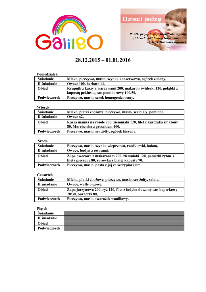 Posiłki przygotowuje firma cateringowa „Maxi-Food” Usługi Gastronomiczne Dietetyk Dagmara Baranek 28.12.2015 – 01.01.2016 Poniedziałek Śniadanie II śniadanie Obiad Podwieczorek Wtorek Śniadanie II śniadanie Obiad Podwieczorek Środa Śniadanie II śniadanie Obiad Podwieczorek Czwartek Śniadanie II śniadanie Obiad Podwieczorek Piątek Śniadanie II śniadanie Obiad Podwieczorek Mleko, pieczywo, masło, szynka konserwowa, ogórek zielony, Owoce 100, herbatniki, Krupnik z kaszy z warzywami 200, makaron świderki 120, gołąbki z kapustą pekińską, sos pomidorowy 100/50, Pieczywo, masło, serek homogenizowany. Mleko, płatki zbożowe, pieczywo, masło, ser biały, pomidor, Owoce x2, Kasza manna na rosole 200, ziemniaki 120, filet z kurczaka smażony 80, Marchewka z groszkiem 100, Pieczywo, masło, ser żółty, ogórek kiszony. Pieczywo, masło, szynka wieprzowa, rzodkiewki, kakao, Owoce, budyń z owocami, Zupa owocowa z makaronem 200, ziemniaki 120, paluszki rybne z fileta pieczone 80, surówka z białej kapusty 70, Pieczywo, masło, pasta z jaj ze szczypiorkiem. Mleko, płatki zbożowe, pieczywo, masło, ser żółty, sałata, Owoce, wafle ryżowe, Zupa jarzynowa 200, ryż 120, filet z indyka duszony, sos koperkowy 70/30, buraczki 80, Pieczywo, masło, twarożek waniliowy.