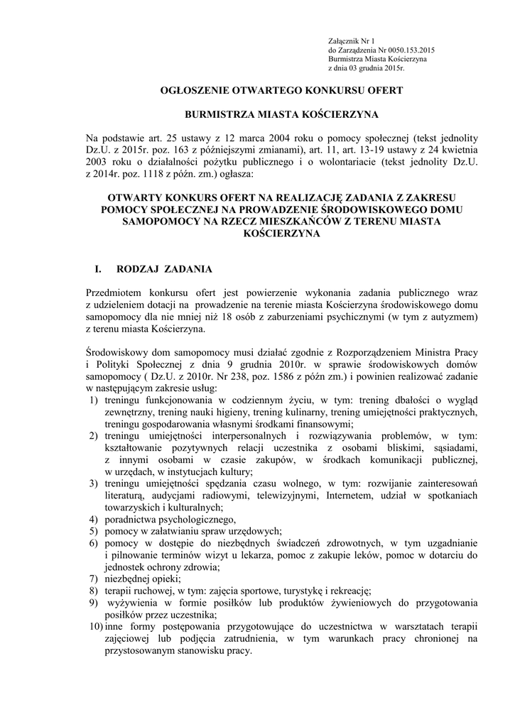 Załącznik Nr 1 do Zarządzenia Nr 0050.153.2015 Burmistrza Miasta Kościerzyna z dnia 03 grudnia 2015r. OGŁOSZENIE OTWARTEGO KONKURSU OFERT BURMISTRZA MIASTA KOŚCIERZYNA Na podstawie art. 25 ustawy z 12 marca 2004 roku o pomocy społecznej (tekst jednolity Dz.U. z 2015r. poz. 163 z późniejszymi zmianami), art. 11, art. 13-19 ustawy z 24 kwietnia 2003 roku o działalności pożytku publicznego i o wolontariacie (tekst jednolity Dz.U. z 2014r. poz. 1118 z późn. zm.) ogłasza: OTWARTY KONKURS OFERT NA REALIZACJĘ ZADANIA Z ZAKRESU POMOCY SPOŁECZNEJ NA PROWADZENIE ŚRODOWISKOWEGO DOMU SAMOPOMOCY NA RZECZ MIESZKAŃCÓW Z TERENU MIASTA KOŚCIERZYNA I. RODZAJ ZADANIA Przedmiotem konkursu ofert jest powierzenie wykonania zadania publicznego wraz z udzieleniem dotacji na prowadzenie na terenie miasta Kościerzyna środowiskowego domu samopomocy dla nie mniej niż 18 osób z zaburzeniami psychicznymi (w tym z autyzmem) z terenu miasta Kościerzyna. Środowiskowy dom samopomocy musi działać zgodnie z Rozporządzeniem Ministra Pracy i Polityki Społecznej z dnia 9 grudnia 2010r. w sprawie środowiskowych domów samopomocy ( Dz.U. z 2010r. Nr 238, poz. 1586 z późn zm.) i powinien realizować zadanie w następującym zakresie usług: 1) treningu funkcjonowania w codziennym życiu, w tym: trening dbałości o wygląd zewnętrzny, trening nauki higieny, trening kulinarny, trening umiejętności praktycznych, treningu gospodarowania własnymi środkami finansowymi; 2) treningu umiejętności interpersonalnych i rozwiązywania problemów, w tym: kształtowanie pozytywnych relacji uczestnika z osobami bliskimi, sąsiadami, z innymi osobami w czasie zakupów, w środkach komunikacji publicznej, w urzędach, w instytucjach kultury; 3) treningu umiejętności spędzania czasu wolnego, w tym: rozwijanie zainteresowań literaturą, audycjami radiowymi, telewizyjnymi, Internetem, udział w spotkaniach towarzyskich i kulturalnych; 4) poradnictwa psychologicznego, 5) pomocy w załatwianiu spraw urzędowych; 6) pomocy w dostępie do niezbędnych świadczeń zdrowotnych, w tym uzgadnianie i pilnowanie terminów wizyt u lekarza, pomoc z zakupie leków, pomoc w dotarciu do jednostek ochrony zdrowia; 7) niezbędnej opieki; 8) terapii ruchowej, w tym: zajęcia sportowe, turystykę i rekreację; 9) wyżywienia w formie posiłków lub produktów żywieniowych do przygotowania posiłków przez uczestnika; 10) inne formy postępowania przygotowujące do uczestnictwa w warsztatach terapii zajęciowej lub podjęcia zatrudnienia, w tym warunkach pracy chronionej na przystosowanym stanowisku pracy. II. WYSOKOŚĆ ŚRODKÓW PUBLICZNYCH REALIZACJĘ TEGO ZADANIA PRZEZNACZONYCH NA Planowana wysokość środków publicznych przeznaczonych na realizację zadania w roku 2016 wynosi 216.000 zł (słownie: dwieście szesnaście tysięcy złotych). Kwota dotacji może ulec zmianie w zależności od liczby uczestników. Kwota dotacji może też ulec zmianie w związku z zobowiązaniem z art. 51 c ust. 3 pkt 1 ustawy o pomocy społecznej w brzmieniu od 1 stycznia 2016r oraz art. 2 ustawy z 5.08.2015r. o zmianie ustawy o pomocy społecznej. III. ZASADY PRZYZNAWANIA DOTACJI 1. W otwartym konkursie ofert mogą uczestniczyć organizacje pozarządowe oraz podmioty wymienione w art. 3 ust. 3 ustawy z dnia 24 kwietnia 2003 r. o działalności pożytku publicznego i o wolontariacie (tekst jednolity Dz. U. z 2014r. poz. 1118 z późn. zm.), które prowadzą działalność statutową w dziedzinie objętej konkursem i zamierzają realizować zadanie na rzecz mieszkańców miasta Kościerzyna. 2. Oferta musi spełniać wszystkie warunki określone w ustawie z dnia 24 kwietnia 2003 r. o działalności pożytku publicznego i o wolontariacie (oferty niespełniające warunków formalnych nie będą rozpatrywane). 3. Rozpatrzeniu podlegać będą wyłącznie oferty sporządzone wg wzoru zawartego w Rozporządzeniu Ministra Pracy i Polityki Społecznej z dnia 15.12.2010r. w sprawie wzoru oferty i ramowego wzoru umowy dotyczących realizacji zadania publicznego oraz wzoru sprawozdania z wykonania tego zadania (Dz. U. z 2011 r. Nr 6 poz. 25). 4. Wymagane są następujące załączniki do oferty: a) kopia aktualnego odpisu z Krajowego Rejestru Sądowego, innego rejestru lub ewidencji (odpis musi być zgodny z aktualnym stanem faktycznym i prawnym, niezależnie od tego kiedy został wydany), b) w przypadku wyboru innego sposobu reprezentacji podmiotów składających ofertę wspólną niż wynikający z Krajowego Rejestru Sądowego lub innego właściwego rejestru – dokument potwierdzający upoważnienie do działania w imieniu oferenta (-ów), c) aktualny statut podmiotu uprawnionego, Kopie dokumentów muszą być potwierdzone za zgodność z oryginałem (ze wskazaniem imienia, nazwiska oraz formułą „za zgodność z oryginałem” i podpisem osoby/osób upoważnionej/upoważnionych do reprezentowania podmiotu, na każdej stronie dokumentu). 5. Dotacja udzielona będzie miesięcznie za dany miesiąc, nie później niż do 25 dnia każdego miesiąca na podstawie wydanych przez Dyrektora Miejskiego Ośrodka Pomocy Społecznej w Kościerzynie decyzji administracyjnych o skierowaniu do Środowiskowego Domu Samopomocy. IV. TERMIN I WARUNKI REALIZACJI ZADANIA 1. Zadanie będzie realizowane w okresie od 1 stycznia 2016r. do 31 grudnia 2016r. 2. Oferent zobowiązuje się do realizacji zadania na zasadach określonych w umowie. V. TERMIN I SPOSÓB SKŁADANIA OFERT: Ofertę zgodną z art. 14 ust. 1 ustawy o działalności pożytku publicznego i o wolontariacie sporządzoną według wzoru stanowiącego załącznik do Rozporządzenia Ministra Pracy i Polityki Społecznej z dnia 15 grudnia 2010r. w sprawie wzoru oferty i ramowego wzoru umowy dotyczących realizacji zadania publicznego oraz wzoru sprawozdania z wykonywania tego zadania (Dz. U z 2011r. Nr 6, poz. 25) należy składać do dnia 28 grudnia 2015r. w Miejskim Ośrodku Pomocy Społecznej w Kości