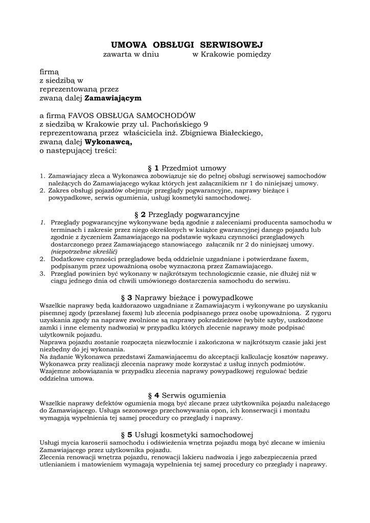 UMOWA OBSŁUGI SERWISOWEJ zawarta w dniu w Krakowie pomiędzy firmą z siedzibą w reprezentowaną przez zwaną dalej Zamawiającym a firmą FAVOS OBSŁUGA SAMOCHODÓW z siedzibą w Krakowie przy ul. Pachońskiego 9 reprezentowaną przez właściciela inż. Zbigniewa Białeckiego, zwaną dalej Wykonawcą, o następującej treści: § 1 Przedmiot umowy 1. Zamawiający zleca a Wykonawca zobowiązuje się do pełnej obsługi serwisowej samochodów należących do Zamawiającego wykaz których jest załącznikiem nr 1 do niniejszej umowy. 2. Zakres obsługi pojazdów obejmuje przeglądy pogwarancyjne, naprawy bieżące i powypadkowe, serwis ogumienia, usługi kosmetyki samochodowej. § 2 Przeglądy pogwarancyjne 1. Przeglądy pogwarancyjne wykonywane będą zgodnie z zaleceniami producenta samochodu w terminach i zakresie przez niego określonych w książce gwarancyjnej danego pojazdu lub zgodnie z życzeniem Zamawiającego na podstawie wykazu czynności przeglądowych dostarczonego przez Zamawiającego stanowiącego załącznik nr 2 do niniejszej umowy. (niepotrzebne skreślić) 2. Dodatkowe czynności przeglądowe będą oddzielnie uzgadniane i potwierdzane faxem, podpisanym przez upoważnioną osobę wyznaczoną przez Zamawiającego. 3. Przegląd powinien być wykonany w najkrótszym technologicznie czasie, nie dłużej niż w ciągu jednego dnia od chwili umówionego dostarczenia samochodu do serwisu. § 3 Naprawy bieżące i powypadkowe Wszelkie naprawy będą każdorazowo uzgadniane z Zamawiającym i wykonywane po uzyskaniu pisemnej zgody (przesłanej faxem) lub zlecenia podpisanego przez osobę upoważnioną. Z rygoru uzyskania zgody na naprawę zwolnione są naprawy pokradzieżowe (wybite szyby, uszkodzone zamki i inne elementy nadwozia) w przypadku których zlecenie naprawy może podpisać użytkownik pojazdu. Naprawa pojazdu zostanie rozpoczęta niezwłocznie i zakończona w najkrótszym czasie jaki jest niezbędny do jej wykonania. Na żądanie Wykonawca przedstawi Zamawiającemu do akceptacji kalkulację kosztów naprawy. Wykonawca przy realizacji zlecenia naprawy może korzystać z usług innych podmiotów. Wzajemne zobowiązania w przypadku zlecenia naprawy powypadkowej regulować będzie oddzielna umowa. § 4 Serwis ogumienia Wszelkie naprawy defektów ogumienia mogą być zlecane przez użytkownika pojazdu należącego do Zamawiającego. Usługa sezonowego przechowywania opon, ich konserwacji i montażu wymagają wypełnienia tej samej procedury co przeglądy i naprawy. § 5 Usługi kosmetyki samochodowej Usługi mycia karoserii samochodu i odświeżenia wnętrza pojazdu mogą być zlecane w imieniu Zamawiającego przez użytkownika pojazdu. Zlecenia renowacji wnętrza pojazdu, renowacji lakieru nadwozia i jego zabezpieczenia przed utlenianiem i matowieniem wymagają wypełnienia tej samej procedury co przeglądy i naprawy. § 6 Usługi wyposażenia dodatkowego Zakres tych usług zostaje określony przez Zamawiającego. Wykonawca działając w Jego imieniu może zbierać i analizować oferty innych podmiotów i po przedstawieniu i akceptacji Zamawiającego, nadzorować ich realizację. § 7 Zobowiązania Wykonawcy Wykonawca oświadcza, że jest członkiem sieci warsztatów Q SERVICE o zasięgu ogólnopolskim będącej dobrowolnym zrzeszeniem samodzielnych warsztatów samochodowych, działającym na zasadzie dobrowolności wszelkich wzajemnych zobowiązań. Dzięki wysokiej jakości części zamiennych sieć Q SERVICE udziela w przypadku użycia tych części do naprawy, rocznej gwarancji dokumentowanej w jednakowej dla całej sieci książkach serwisowych. Wykonawca zobowiązuje się do: 1. Przyjmowania pojazdów Zamawiającego w swojej siedzibie we wszystkie dni tygodnia z wyjątkiem niedziel oraz innych dni ustawowo wolnych od pracy w godzinach od 8.00 do 17.00 - w soboty od 8.00 do 12.00. Poza wyznaczonymi godzinami Wykonawca umożliwia pozostawienie samochodu do obsługi lub naprawy przez udostępnienie parkingu przed siedzibą firmy i wrzutni zabezpieczającej klucze do pozostawianego pojazdu. 2. Przyjmowania w pierwszej kolejności samochodów Zamawiającego bez konieczności wcześniejszej rezerwacji terminu usługi. 3. Posiadania stałych zapasów materiałów eksploatacyjnych i części zamiennych niezbędnych do wykonania przeglądów okresowych. 4. Stosowania w naprawach pojazdów części zamiennych • oryginalnych zakupionych w sieci Autoryzowanych Stacji Obsługi danej marki samochodu lub • powierzonych przez Zamawiającego lub • części dostarczanych do sieci warsztatów Q SERVICE przez firmę INTER CARS nadzorującą działalność tej sieci. 5. Wykonawca zobowiązuje się wykonywać naprawy w sposób zgodny ze sztuką oraz swoimi najlepszymi umiejętnościami i wiedzą, przy zastosowaniu najbardziej skutecznych środków. 6. Wykonawca ponosi pełną odpowiedzialność materialną z tytułu wad wykonanej naprawy, niewykonania naprawy w ustalonym terminie oraz za szkody powstałe w wyniku swojej nieprawidłowej działalności. § 8 Zobowiązania Zamawiającego Zamawiający zobowiązuje się do: 1. Dostarczania samochodów na przeglądy zgodnie z wymogami książki gwarancyjnej pojazdu lub w terminie uzgodnionym z Wykonawcą przez użytkownika samochodu. 2. Wyznaczenia osób upoważnionych do • podejmowania decyzji o zakresie i terminie napraw, • akceptowania kalkulacji kosztów napraw, • potwierdzania wykonania naprawy, • odbioru faktur VAT Lista wyznaczonych osób jest załącznikiem nr 3 do niniejszej umowy. 3. Terminowego regulowania należności z tytułu wykonanych usług. § 9 Warunki rozliczeń finansowych Zamawiający zobowiązuje się do dokonywania płatności za wykonane usługi przelewem, na podstawie faktury VAT wystawionej przez Wykonawcę na rachunek bankowy nr 77 1060 0076 0000 3200 0047 3067 w Banku Przemysłowo Handlowym S.A. Oddział w Krakowie ul. Pijarska 1 w terminie 7dni od daty przekazania faktury. Jako dzień zapłaty prz