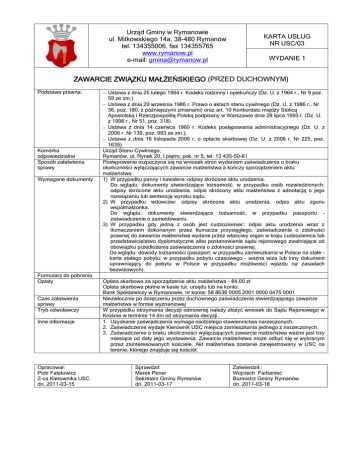 Urząd Gminy w Rymanowie ul. Mitkowskiego 14a, 38-480 Rymanów tel. 134355006, fax 134355765 www.rymanow.pl e-mail: [email protected] KARTA USŁUG NR USC/03 WYDANIE 1 ZAWARCIE ZWIĄZKU MAŁŻEŃSKIEGO (PRZED DUCHOWNYM) Podstawa prawna: Komórka odpowiedzialna Sposób załatwienia sprawy Wymagane dokumenty Formularz do pobrania Opłaty Czas załatwienia sprawy Tryb odwoławczy Inne informacje Opracował: Piotr Fałatowicz Z-ca Kierownika USC dn. 2011-03-15 Ustawa z dnia 25 lutego 1964 r. Kodeks rodzinny i opiekuńczy (Dz. U. z 1964 r., Nr 9 poz. 59 ze zm.) Ustawa z dnia 29 września 1986 r. Prawo o aktach stanu cywilnego (Dz. U. z 1986 r., Nr 36, poz. 180, z późniejszymi zmianami) oraz art. 10 Konkordatu między Stolicą Apostolską i Rzeczpospolitą Polską podpisany w Warszawie dnia 28 lipca 1993 r. (Dz. U. z 1998 r., Nr 51, poz. 318). Ustawa z dnia 14 czerwca 1960 r. Kodeks postępowania administracyjnego (Dz. U. z 2006 r. Nr 139, poz. 993 ze zm.), Ustawa z dnia 16 listopada 2006 r. o opłacie skarbowej (Dz. U. z 2006 r. Nr 225, poz. 1635) Urząd Stanu Cywilnego, Rymanów, ul. Rynek 20, I piętro, pok. nr 5, tel: 13 435-50-81 Postępowanie rozpoczyna się na wniosek stron wydaniem zaświadczenia o braku okoliczności wyłączających zawarcie małżeństwa a kończy sporządzeniem aktu małżeństwa 1) W przypadku panny i kawalera: odpisy skrócone aktu urodzenia. Do wglądu: dokumenty stwierdzające tożsamość. w przypadku osób rozwiedzionych: odpisy skrócone aktu urodzenia, odpis skrócony aktu małżeństwa z adnotacją o jego rozwiązaniu lub sentencję wyroku sądu. 2) W przypadku wdowców: odpisy skrócone aktu urodzenia, odpis aktu zgonu współmałżonka. Do wglądu: dokumenty stwierdzające tożsamość, w przypadku paszportu zaświadczenie o zameldowaniu. 3) W przypadku gdy jedną z osób jest cudzoziemiec: odpis aktu urodzenia wraz z tłumaczeniem dokonanym przez tłumacza przysięgłego, zaświadczenie o zdolności prawnej do zawarcia małżeństwa wydane przez właściwy organ w kraju cudzoziemca lub przedstawicielstwo dyplomatyczne albo postanowienie sądu rejonowego zwalniające od obowiązku przedłożenia zaświadczenia o zdolności prawnej. Do wglądu: dowody tożsamości (paszport; w przypadku zamieszkania w Polsce na stałe karta stałego pobytu; w przypadku pobytu czasowego - ważna wiza lub inny dokument uprawniający do pobytu w Polsce w przypadku możliwości wjazdu na zasadach bezwizowych). Opłata skarbowa za sporządzenie aktu małżeństwa - 84,00 zł Opłata skarbowa płatna w kasie tut. urzędu lub na konto: Bank Spółdzielczy w Rymanowie, nr konta: 58 8636 0005 2001 0000 0475 0001 Niezwłocznie po doręczeniu przez duchownego zaświadczenia stwierdzającego zawarcie małżeństwa w formie wyznaniowej W przypadku otrzymania decyzji odmownej należy złożyć wniosek do Sądu Rejonowego w Krośnie w terminie 14 dni od otrzymania decyzji. 1. Uzyskanie zaświadczenia wymaga osobistego stawiennictwa narzeczonych. 2. Zaświadczenie wydaje Kierownik USC miejsca zamieszkania jednego z narzeczonych. 3. Zaświadczenie o braku okoliczności wyłączających zawarcie małżeństwa ważne jest trzy miesiące od daty jego wystawienia. Zawarcie małżeństwa może odbyć się w wybranym przez zainteresowanych kościele. Akt małżeństwa zostanie zarejestrowany w USC na terenie, którego znajduje się kościół. Sprawdził: Marek Penar Sekretarz Gminy Rymanów dn. 2011-03-17 Zatwierdził:: Wojciech Farbaniec Burmistrz Gminy Rymanów. dn. 2011-03-18