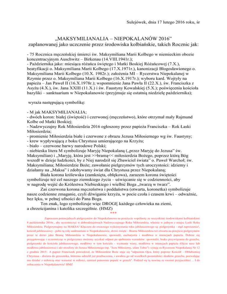 Sulejówek, dnia 17 lutego 2016 roku, śr „MAKSYMILIANALIA – NIEPOKALANÓW 2016” zaplanowanej jako uczczenie przez środowiska kolbiańskie, takich Rocznic jak: - 75 Rocznica męczeńskiej śmierci św. Maksymiliana Marii Kolbego w niemieckim obozie koncentracyjnym Auschwitz – Birkenau (14.VIII.1941r.); - Października jako: miesiąca różańca świętego i Matki Boskiej Różańcowej (7.X.), beatyfikacji o. Maksymiliana Marii Kolbego (17.X.1971r.), kanonizacji Błogosławionego o. Maksymiliana Marii Kolbego (10.X. 1982r.); założenia MI – Rycerstwa Niepokalanej w Rzymie przez o. Maksymiliana Marii Kolbego (16.X.1917r.); wyboru kard. Wojtyły na papieża – Jan Paweł II (16.X.1978r.); wspomnienie Jana Pawła II (22.X.), św. Franciszka z Asyżu (4.X.), św. Jana XXIII (11.X.) i św. Faustyny Kowalskiej (5.X.); poświęcenia kościoła bazyliki – sanktuarium w Niepokalanowie (przyjmuje się ostatnią niedzielę października); wyraża następującą symbolikę: - M jak MAKSYMILIANALIA; - dwóch koron: białej (świętość) i czerwonej (męczeństwo), które otrzymał mały Rajmund Kolbe od Matki Boskiej; - Nadzwyczajny Rok Miłosierdzia 2016 ogłoszony przez papieża Franciszka – Rok Łaski Miłosierdzia; - promienie Miłosierdzia białe i czerwone z obrazu Jezusa Miłosiernego wg św. Faustyny; - krew wypływającą z boku Chrystusa umierającego na Krzyżu; - biało – czerwone barwy narodowe Polski; - niebieska litera M symbolizuje Maryję Niepokalaną („przez Maryję do Jezusa” św. Maksymilian) i „Maryję, która jest >>bramą<< miłosierdzia Bożego, poprzez którą Bóg wszedł w dzieje ludzkości, by z Niej narodził się Zbawiciel świata” o. Paweł Warchoł; św. Maksymiliana; Miłosierdzie Boże; zawołanie pielgrzymów tych uroczystości: idziemy i działamy na „Maksa” i zdobywamy świat dla Chrystusa przez Niepokalaną; Biała korona królewska (zamknięta, obłękowa), zarazem korona świętości symbolizuje też cel naszego ziemskiego życia – uświęcanie się w codzienności, aby w nagrodę wejść do Królestwa Niebieskiego i wielbić Boga „twarzą w twarz”. Zaś czerwona korona męczeństwa i poddaństwa (otwarta, koronetka) symbolizuje nasze codzienne zmaganie, czyli dźwiganie krzyża, w pocie czoła i czasem krwi – odważnie, bez lęku, w pełnej ufności do Pana Boga. Ten znak, logo symbolizuje więc DROGĘ każdego człowieka na ziemi, a chrześcijanina i katolika szczególnie. (HMZ) *** Zapraszam potencjalnych pielgrzymów do Niepokalanowa na przeżycie wspólnoty ze wszystkimi środowiskami kolbiańskimi 8 października 2016r., aby uczestniczyć w dobrodziejstwach Nadzwyczajnego Roku Miłosierdzia, właśnie w jednym z miejsc Łaski Roku Miłosierdzia. Pielgrzymujmy na MAKSA! Kluczem do owocnego wykorzystania roku jubileuszowego są: pielgrzymka - stąd zaproszenie!, kościół jubileuszowy - pełni tą rolę sanktuarium w Niepokalanowie, drzwi święte - Brama Miłosierdzia też otwarta na przejście pielgrzymów przez te drzwi jako Bramę Miłosierdzia w Niepokalanowie, spowiedź, eucharystia i modlitwa w intencjach papieża. Dobrze się przygotowując i uczestnicząc w pielgrzymce możemy uzyskać odpust po spełnieniu warunków: spowiedzi, braku przywiązania do grzechu, pielgrzymki do kościoła jubileuszowego, modlitwy w tym kościele - wyznanie wiary, modlitwa w intencjach papieża (Ojcze nasz lub modlitwa jubileuszowa) i akt strzelisty do Jezusa Miłosiernego (np. "Jezu Miłosierny, ufam Tobie") /cytuję za Rycerzem Niepokalanej Nr 12 z grudnia 2015/. A papież Franciszek powiedział, że Miłosierdzie Boże staje się "odpustem Ojca, który poprzez Kościół - Oblubienicę Chrystusa - dociera do grzesznika, któremu udzielił już przebaczenia, i uwalnia go od wszelkich pozostałości skutków grzechu, pozwalając mu działać z miłością oraz wzrastać w miłości, zamiast ponownie popaść w grzech". Podziel się tą nowiną ze swoimi przyjaciółmi ... I do zobaczenia w Niepokalanowie! HMZ