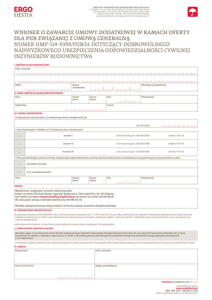 SOPOCKIE TOWARZYSTWO UBEZPIECZEŃ ERGO HESTIA SA ul. Hestii 1, 81-731 Sopot. Numer KRS 0000024812 Sądu Rejonowego Gdańsk-Północ w Gdańsku, VIII Wydział Gospodarczy Krajowego Rejestru Sądowego. NIP 585-000-16-90. Wysokość kapitału zakładowego, który został opłacony w całości: 185.980.900 zł. WNIOSEK O ZAWARCIE UMOWY DODATKOWEJ W RAMACH OFERTY DLA PIIB ZWIĄZANEJ Z UMOWĄ GENERALNĄ NUMER UMP-114-0390/PIIB/14 DOTYCZĄCY DOBROWOLNEGO NADWYŻKOWEGO UBEZPIECZENIA ODPOWIEDZIALNOŚCI CYWILNEJ INŻYNIERÓW BUDOWNICTWA I. UBEZPIECZAJĄCY/UBEZPIECZONY Imię i nazwisko PESEL Numer członkowski / / / PKD głównej działalności II. ADRES UBEZPIECZAJĄCEGO/UBEZPIECZONEGO Ulica Numer domu Numer lokalu Kod - Miejscowość E-mail Telefon/fax III. UMOWA UBEZPIECZENIA 1. Proponowana data początku 12 miesięcznego okresu ubezpieczenia od (DD:MM:RRRR) 2. Suma Gwarancyjna i składka za 12 miesięczny okres ubezpieczenia wariant I Suma Gwarancyjna: 100.000 EURO składka 195 PLN wariant II Suma Gwarancyjna: 200.000 EURO składka 395 PLN wariant III Suma Gwarancyjna: 250.000 EURO składka 475 PLN 3. Polisę potwierdzającą zawarcie umowy ubezpieczenia odpowiedzialności cywilnej inżyniera budownictwa na dodatkową sumę gwarancyjną, proszę przesłać na adres jak podany powyżej inny, jak podany poniżej Ulica Numer domu Numer lokalu Kod - Miejscowość UWAGA! Wypełniony i podpisany wniosek należy przesłać: listem na adres STU Ergo Hestia, Agencja Wyłączna ul. Mściwoja 9/12, 81-361 Gdynia lub mailem na adres [email protected] lub faxem na numer 58 500 80 87 W razie pytań proszę o kontakt telefoniczny 58 698 65 58. Składkę ubezpieczeniową należy wpłacić na konto podane na polisie ubezpieczeniowej. IV. OŚWIADCZENIA UBEZPIECZYCIELA Na podstawie Ustawy z dnia 29.08.1997 roku o ochronie danych osobowych Dz. U. z 1997 roku, Nr 133, poz. 883), informujemy, że Sopockie Towarzystwo Ubezpieczeniowe Ergo Hestia SA z siedzibą w Sopocie przy ul. Hestii 1 jest administratorem Pana/i danych osobowych, pobranych zgodnie z treścią art. 815 kc., które będą przez nas przetwarzane w celu wywiązania się z umowy ubezpieczenia. Jednocześnie informujemy, iż służy Panu/i prawo wglądu do swoich danych osobowych i ich poprawiania. V. OŚWIADCZENIA UBEZPIECZAJĄCEGO Wyrażam zgodę na przetwarzanie moich danych osobowych przez Sopockie Towarzystwo Ubezpieczeniowe Ergo Hestia SA oraz Sopockie Towarzystwo Ubezpieczeń na Życie Ergo Hestia SA, obydwa z siedzibą w Sopocie przy ul. Hestii 1, dla celów promocji (marketingu) ich produktów (usług) oraz produktów (usług) podmiotów powiązanych z nimi kapitałowo. * od wyrażenia zgody na powyższe nie uzależnia się zawarcia umowy ubezpieczenia. W przypadku braku zgody Ubezpieczającego na treść powyższej klauzuli, prosimy o jej wykreślenie w całości VI. PODPISY Miejscowość Imię i nazwisko Data (DD:MM:RRRR) Podpis wnioskodawcy ORYGINAŁ OC/WN030/1405 str. 1 / 1 Skontaktuj się z nami: www.ergohestia.pl 801 107 107*, 58 555 5 555 *opłata za połączenie zgodnie z cennikiem operatora