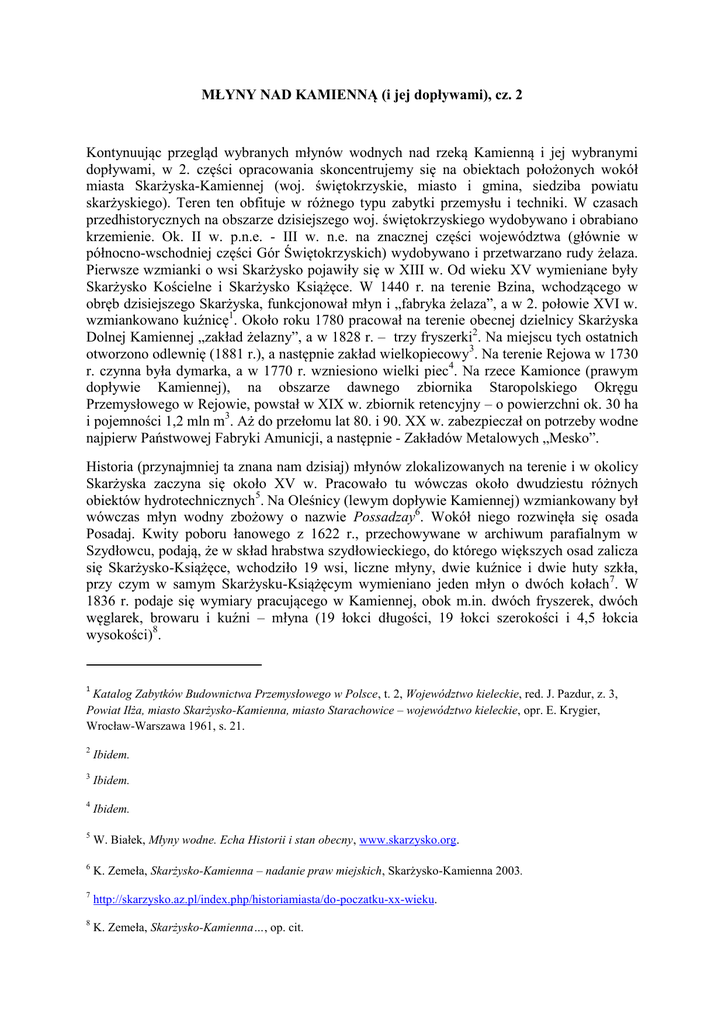 MŁYNY NAD KAMIENNĄ (i jej dopływami), cz. 2 Kontynuując przegląd wybranych młynów wodnych nad rzeką Kamienną i jej wybranymi dopływami, w 2. części opracowania skoncentrujemy się na obiektach położonych wokół miasta Skarżyska-Kamiennej (woj. świętokrzyskie, miasto i gmina, siedziba powiatu skarżyskiego). Teren ten obfituje w różnego typu zabytki przemysłu i techniki. W czasach przedhistorycznych na obszarze dzisiejszego woj. świętokrzyskiego wydobywano i obrabiano krzemienie. Ok. II w. p.n.e. - III w. n.e. na znacznej części województwa (głównie w północno-wschodniej części Gór Świętokrzyskich) wydobywano i przetwarzano rudy żelaza. Pierwsze wzmianki o wsi Skarżysko pojawiły się w XIII w. Od wieku XV wymieniane były Skarżysko Kościelne i Skarżysko Książęce. W 1440 r. na terenie Bzina, wchodzącego w obręb dzisiejszego Skarżyska, funkcjonował młyn i „fabryka żelaza”, a w 2. połowie XVI w. wzmiankowano kuźnicę1. Około roku 1780 pracował na terenie obecnej dzielnicy Skarżyska Dolnej Kamiennej „zakład żelazny”, a w 1828 r. – trzy fryszerki2. Na miejscu tych ostatnich otworzono odlewnię (1881 r.), a następnie zakład wielkopiecowy3. Na terenie Rejowa w 1730 r. czynna była dymarka, a w 1770 r. wzniesiono wielki piec4. Na rzece Kamionce (prawym dopływie Kamiennej), na obszarze dawnego zbiornika Staropolskiego Okręgu Przemysłowego w Rejowie, powstał w XIX w. zbiornik retencyjny – o powierzchni ok. 30 ha i pojemności 1,2 mln m3. Aż do przełomu lat 80. i 90. XX w. zabezpieczał on potrzeby wodne najpierw Państwowej Fabryki Amunicji, a następnie - Zakładów Metalowych „Mesko”. Historia (przynajmniej ta znana nam dzisiaj) młynów zlokalizowanych na terenie i w okolicy Skarżyska zaczyna się około XV w. Pracowało tu wówczas około dwudziestu różnych obiektów hydrotechnicznych5. Na Oleśnicy (lewym dopływie Kamiennej) wzmiankowany był wówczas młyn wodny zbożowy o nazwie Possadzay6. Wokół niego rozwinęła się osada Posadaj. Kwity poboru łanowego z 1622 r., przechowywane w archiwum parafialnym w Szydłowcu, podają, że w skład hrabstwa szydłowieckiego, do którego większych osad zalicza się Skarżysko-Książęce, wchodziło 19 wsi, liczne młyny, dwie kuźnice i dwie huty szkła, przy czym w samym Skarżysku-Książęcym wymieniano jeden młyn o dwóch kołach7. W 1836 r. podaje się wymiary pracującego w Kamiennej, obok m.in. dwóch fryszerek, dwóch węglarek, browaru i kuźni – młyna (19 łokci długości, 19 łokci szerokości i 4,5 łokcia wysokości)8. 1 Katalog Zabytków Budownictwa Przemysłowego w Polsce, t. 2, Województwo kieleckie, red. J. Pazdur, z. 3, Powiat Iłża, miasto Skarżysko-Kamienna, miasto Starachowice – województwo kieleckie, opr. E. Krygier, Wrocław-Warszawa 1961, s. 21. 2 Ibidem. 3 Ibidem. 4 Ibidem. 5 W. Białek, Młyny wodne. Echa Historii i stan obecny, www.skarzysko.org. 6 K. Zemeła, Skarżysko-Kamienna – nadanie praw miejskich, Skarżysko-Kamienna 2003. 7 http://skarzysko.az.pl/index.php/historiamiasta/do-poczatku-xx-wieku. 8 K. Zemeła, Skarżysko-Kamienna…, op. cit. Skarżysko-Kamienna (Posadaj) – w 1961 r. czynny był jeszcze młyn wodny zbożowy, wybudowany na miejscu poprzedniego w 1920 r.9 Trudno dziś, rzecz jasna, osądzić, czy obiekt zlokalizowany był w miejscu wzmiankowanego w końcu XV w. młyna Possadzay. Bliżej zainteresowanych tematem młyna w Posadaju odsyłam do interesującej dyskusji na forum mieszkańców Skarżyska-Kamiennej: http://www.skarzysko.org/modules.php?name=Forums&file=viewtopic&t=6482. Młyn z 1920 r. był drewniany, w konstrukcji szkieletowej, oszalowany. Wzniesiono go na palach, wbitych w dno Oleśnicy. Budynek założony był na planie prostokąta, z drewnianą komorą turbinową, przekryty wysokim dachem dwuspadowym, krytym eternitem. Nieduże, kwadratowe okna doświetlały wnętrze. Spiętrzenie wody następowało poprzez drewniany upust roboczy i jałowy z kamiennymi przyczółkami. Jak podaje Katalog Zabytków Budownictwa Przemysłowego w Polsce, od 1920 r. we młynie pracowała turbina własnej konstrukcji, przemiał następował na jedną parę walców i jedno złożenie kamieni młyńskich10. Opracowanie podkreśla stan dobry obiektu jeszcze w roku 1961. Fot. 1. Skarżysko-Kamienna (Posadaj), młyn wodny zbożowy(wg Katalog Zabytków Budownictwa Przemysłowego w Polsce, t. 2, Województwo kieleckie, red. J. Pazdur, z. 3, Powiat Iłża, miasto SkarżyskoKamienna, miasto Starachowice – województwo kieleckie, opr. E. Krygier, Wrocław-Warszawa 1961) Nowy Młyn – obiekt wybudowany został w 1930 r., na miejscu istniejącego przedtem, spalonego młyna, jako budynek drewniany, w konstrukcji szkieletowej, oszalowany, na podmurówce z kamienia, wystawiony na palach wbitych w ziemię11. Założony na planie prostokąta, z drewnianą komorą na turbinę. Elewacje przeprute przez nieduże, prostokątne 9 Katalog Zabytków…, op. cit., s. 22. 10 Ibidem. 11 Ibidem, s. 15. okna. Dach dwuspadowy, kryty eternitem. Upust roboczy i jałowy drewniany, z kamiennymi przyczółkami. Napęd na turbinę konstrukcji własnej, a przemiał na jedną parę walców i jedno złożenie kamieni młyńskich. Katalog Zabytków Budownictwa Przemysłowego w Polsce z 1961 r. określa stan zachowania obiektu na dość dobry; młyn był wówczas jeszcze czynny. Obecnie, wpisany do rejestru zabytków obiekt, pozostający w rękach prywatnych, jest w stanie znacznie posuniętej dewastacji, a urządzenia wodne są niekompletne12. Michałów, położony w gm. Skarżysko-Kościelne, w powiecie skarżyskim – na przestrzeni XVII-XX w. istniały i pracowały tu cztery młyny wodne na Kamiennej i jeden młyn na Żarnówce13. Młyny te prowadziły działalność usługową dla okolicznych mieszkańców. Jednym z czynnych w 1. poł. XX w. michałowskich młynów był tzw. młyn Piaska. Na miejscu drewnianego, czynnego przed I wojną światow