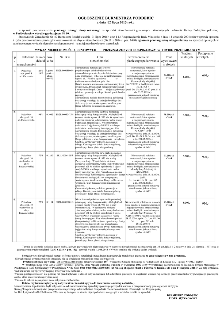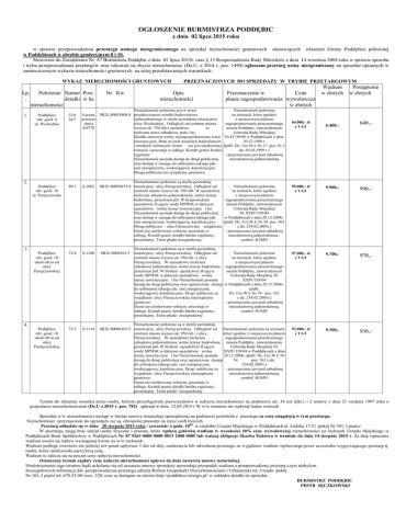 OGŁOSZENIE BURMISTRZA PODDĘBIC z dnia 02 lipca 2015 roku w sprawie przeprowadzenia przetargu ustnego nieograniczonego na sprzedaż nieruchomości gruntowych stanowiących własność Gminy Poddębice położonej w Poddębicach w obrębie geodezyjnym 8 i 10. Stosownie do Zarządzenia Nr 87 Burmistrza Poddębic z dnia 01 lipca 2015r. oraz § 13 Rozporządzenia Rady Ministrów z dnia 14 września 2004 roku w sprawie sposobu i trybu przeprowadzania przetargów oraz rokowań na zbycie nieruchomości (Dz.U. z 2014 r. poz. 1490) ogłaszam przetarg ustny nieograniczony na sprzedaż opisanych w zamieszczonym wykazie nieruchomości gruntowych na niżej przedstawionych warunkach: WYKAZ NIERUCHOMOŚCI GRUNTOWYCH Lp. . 1. 2. 3 4. Położenie Numer Pow. działki w ha nieruchomości Łączna powierz chnia 0,0770 Poddębice obr. geod. 8 ul. Wschodnia 23/6 24/7 Poddębice obr. geod. 10 ul. Parzęczewska 98/1 0,1082 Poddębice obr. geod. 10 około 60 m od ulicy Parzęczewskiej 72/4 0,1280 Poddębice obr. geod. 10 około 60 m od ulicy Parzęczewskiej 72/3 0,1114 Nr Kw PRZEZNACZONYCH DO SPRZEDAŻY W TRYBIE PRZETARGOWYM Opis nieruchomości Nieruchomość położona jest w nowo SR2L/00018806/4 projektowanym osiedlu budownictwa jednorodzinnego w strefie pośredniej miasta przy ulicy Wschodniej . Odległość od centrum miasta wynosi ok. 750 mb a sąsiedztwo to nieliczna nowa zabudowa, pola i las. Działki stanowią wolny niezagospodarowany teren inwestycyjny. Brak na nich naniesień budowlanych i trwałych roślinnych. Grunt nie jest użytkowany rolniczo i pozostaje w odłogu. Kształt granic bardzo regularny Nieruchomość posiada dostęp do drogi publicznej oraz dostęp w zasięgu do uzbrojenia takiego jak: sieć energetyczna, wodociągowa, kanalizacyjna. Droga publiczna nie urządzona, gruntowa. Nieruchomości położone są strefie pośredniej SR2L/00030475/4 miasta przy ulicy Parzęczewskiej . Odległość od centrum miasta wynosi ok. 950 mb. W sąsiedztwie nieliczna zabudowa jednorodzinna, wolne tereny budowlane, przestrzeń pól. W bezpośrednim sąsiedztwie II ujęcie wody MPWiK.w dalszym sąsiedztwie wolne tereny inwestycyjne i las Nieruchomość posiada dostęp do drogi publicznej oraz dostęp w zasięgu do uzbrojenia takiego jak: sieć energetyczna, wodociągową, kanalizacyjna. Droga publiczna - ulica Parzęczewska urządzona. Grunt nie użytkowany rolniczo, pozostaje w odłogu. Kształt granic działki bardzo regularny, prostokątny. Teren płaski nieogrodzony. SR2L/0006101/5 Nieruchomości położone są w strefie pośredniej miasta przy ulicy Parzęczewskiej . Odległość od centrum miasta wynosi ok. 950 mb. z ulicy Parzęczewskiej. W sąsiedztwie nieliczna zabudowa jednorodzinna, wolne tereny budowlane, przestrzeń pól. W bliskim sąsiedztwie II ujęcie wody MPWiK w dalszym sąsiedztwie wolne tereny inwestycyjne i las Nieruchomość posiada dostęp do drogi publicznej oraz ograniczony dostęp do uzbrojenia takiego jak: sieć energetyczna, wodociągowa, kanalizacyjna. Drogi publiczne za wyjątkiem ulicy Parzęczewskiej nieurządzone gruntowe. Grunt nie użytkowany rolniczo, pozostaje w odłogu. Kształt granic działki bardzo regularny, prostokątny. Teren płaski nieogrodzony . Przeznaczenie w Cena planie zagospodarowania wywoławcza w złotych Nieruchomość położona na terenach, które zgodnie z miejscowym planem zagospodarowania przestrzennego miasta Poddębic, zatwierdzonym Uchwałą Rady Miejskiej Nr IV/30/98 w Poddębicach z dnia 30.12.1998 r. (publ. Dz. Urz.W.Ł.Nr 17 poz. 61 z dn. 05.03.1999 r.) - przeznaczona jest pod zabudowę mieszkaniową jednorodzinną Wadium w złotych Postąpienie w złotych 64.000,- zł z VAT 6.400,- 640,- Nieruchomość położona na terenach, które zgodnie z miejscowym planem zagospodarowania przestrzennego miasta Poddębic, zatwierdzonym Uchwałą Rady Miejskiej Nr XXIV/158/04 w Poddębicach z dnia 28.12.2004r. (publ. Dz. Urz.W.Ł.Nr 54 poz. 563 z dn. 254.02.2005r.) - przeznaczona jest pod zabudowę mieszkaniową jednorodzinną , symbol -K5MN 99.000,- zł z VAT 9.900,- 990,- Nieruchomość położona na terenach, które zgodnie z miejscowym planem zagospodarowania przestrzennego miasta Poddębic, zatwierdzonym Uchwałą Rady Miejskiej Nr XXIV/158/04 w Poddębicach z dnia 28.12.2004r. (publ. Dz. Urz.W.Ł.Nr 54 poz. 563 z dn. 254.02.2005r.) - przeznaczona jest pod zabudowę mieszkaniową jednorodzinną, symbol -K5MN 97.000,- zł z VAT 9.700,- 970,- 93.000,- zł z VAT 9.300,- 930,- Nieruchomości położone są w strefie pośredniej SR2L/00006101/5 miasta przy ulicy Parzęczewskiej . Odległość od Nieruchomość położona na terenach, centrum miasta wynosi ok. 950 mb. z ulicy które zgodnie z miejscowym planem Parzęczewskiej. W sąsiedztwie nieliczna zagospodarowania przestrzennego zabudowa jednorodzinna, wolne tereny budowlane, miasta Poddębic, zatwierdzonym przestrzeń pól. W bliskim sąsiedztwie II ujęcie Uchwałą Rady Miejskiej Nr wody MPWiK w dalszym sąsiedztwie wolne XXIV/158/04 w Poddębicach z dnia tereny inwestycyjne i las Nieruchomość posiada 28.12.2004r. (publ. Dz. Urz.W.Ł.Nr dostęp do drogi publicznej oraz ograniczony dostęp 54 poz. 563 z dn. do uzbrojenia takiego jak: sieć energetyczna, 254.02.2005r.) wodociągowa, kanalizacyjna. Drogi publiczne za - przeznaczona jest pod zabudowę wyjątkiem ulicy Parzęczewskiej nieurządzone mieszkaniową jednorodzinną, gruntowe. symbol -K5MN Grunt nie użytkowany rolniczo, pozostaje w odłogu. Kształt granic działki bardzo regularny, prostokątny. Teren płaski nieogrodzony . Termin do złożenia wniosku przez osoby, którym przysługiwało pierwszeństwo w nabyciu nieruchomości na podstawie art. 34 ust.1pkt.1 i 2 ustawy z dnia 21 sierpnia 1997 roku o gospodarce nieruchomościami (Dz.U z 2015 r. poz. 782) upłynął w dniu 12.05.2015 r W w/w terminie nie wpłynął żaden wniosek. Sprzedaż w/w nieruchomości nastąpi w formie umowy notarialnej sporządzonej na podstawie protokółu z p