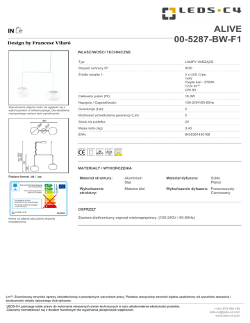 ALIVE 00-5287-BW-F1 IN Design by Francesc Vilaró WŁAŚCIWOŚCI TECHNICZNE Wykończenie zdjęcia może nie zgadzać się z wykończeniem nr referencyjnego. Dla określenia rzeczywistego zobacz opis wykończenia. Typ: LAMPY WISZĄCE Stopień ochrony IP: IP20 Źródło światła 1: 2 x LED Cree 14W Ciepła biel - 2700K 1224 lm(N) CRI 80 Całkowity pobór (W): 16.3W Napięcie / Częstotliwość: 100-240V/50-60Hz Gwarancja (Lat): 2 Możliwość przedłużenia gwarancji (Lat): 5 Sztuk na pudełko: 20 Masa netto (kg): 3.43 EAN: 8435381450168 MATERIAŁY / WYKOŃCZENIA Pobierz format .ldt / .ies Materiał struktury: Aluminium Stal Materiał dyfuzora: Szkło Pleksi Wykończenie struktury: Matowa biel Wykończenie dyfuzora: Przezroczysty Cieniowany OSPRZĘT Kliknij na zdjęcie aby pobrać etykietę energetyczną. Zawiera elektroniczny osprzęt wielonapięciowy. (100-240V / 50-60Hz) Lm(N): Znamionowy strumień oprawy oświetleniowej w prawdziwych warunkach pracy. Państwa rzeczywisty strumień będzie uzależniony od warunków otoczenia i skuteczności układu optycznego i/lub dyfuzora. LEDS-C4 zastrzega sobie prawo do wykonania stosownych zmian technicznych w celu udoskonalenia właściwości produktu. Zalecamy skontaktować się z działem handlowym dla wyjaśnienia jakiejkolwiek wątpliwości. (+34) 973 468 100 [email protected] www.leds-c4.com 00-5287 460 STEEL / ACERO STEEL / ACERO STEEL / ACERO FABRIC WIRE / CABLE TELA MAX 2500 MIN 650 STEEL WIRE / SIRGA ACERO STEEL / ACERO 550 490 STEEL / ACERO TRANSPARENT CLASS / CRISTAL TRANSPARENTE Ø250 799 Ø120 3-Ø4.5 Ø155 01-04-16 71-5285 1 2 3 x2 4 6 N 6A +- + +- - - L + 5 6B 13/12/15 71-5285 + - 7 8 8B x3 8A 9 9B 9A 13/12/15 71-5287 1 2 15/12/15