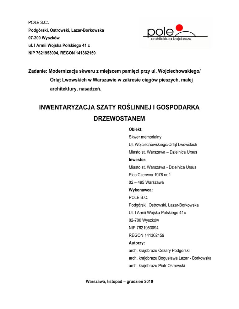 POLE S.C. Podgórski, Ostrowski, Lazar-Borkowska 07-200 Wyszków ul. I Armii Wojska Polskiego 41 c NIP 7621953094, REGON 141362159 Zadanie: Modernizacja skweru z miejscem pamięci przy ul. Wojciechowskiego/ Orląt Lwowskich w Warszawie w zakresie ciągów pieszych, małej architektury, nasadzeń. INWENTARYZACJA SZATY ROŚLINNEJ I GOSPODARKA DRZEWOSTANEM Obiekt: Skwer memorialny Ul. Wojciechowskiego/Orląt Lwowskich Miasto st. Warszawa – Dzielnica Ursus Inwestor: Miasto st. Warszawa - Dzielnica Ursus Plac Czerwca 1976 nr 1 02 – 495 Warszawa Wykonawca: POLE S.C. Podgórski, Ostrowski, Lazar-Borkowska Ul. I Armii Wojska Polskiego 41c 02-700 Wyszków NIP 7621953094 REGON 141362159 Autorzy: arch. krajobrazu Cezary Podgórski arch. krajobrazu Bogusława Lazar - Borkowska arch. krajobrazu Piotr Ostrowski Warszawa, listopad – grudzień 2010 Spis treści I. Opis techniczny 1. Podstawa opracowania....................................................................................................3 2. Cel i zakres opracowania................................................................................................3 3. Ogólny opis szaty roślinnej.............................................................................................4 4. Inwentaryzacja szaty roślinnej........................................................................................5 5. Projekt gospodarki szatą roślinną...................................................................................6 6. Spis rysunków.................................................................................................................8 II. Część rysunkowa Rys. nr 1: Inwentaryzacja szaty roślinnej - skala 1: 250 Rys. nr 2: Gospodarka drzewostanem – skala 1: 250 2 1. Podstawa opracowania Podstawą opracowania inwentaryzacji drzewostanu i gospodarki szatą roślinną terenu skweru były: - mapa zasadnicza w skali 1:500; - wizja lokalna i dokumentacja fotograficzna przeprowadzona w listopadzie 2010 roku; - pomiary drzew i krzewów wykonane osobiście; - ocena stanu zdrowia roślin; - wytyczne i sugestie inwestora. 2. Cel i zakres opracowania Celem opracowania jest inwentaryzacja szaty roślinnej oraz opracowanie wytycznych do gospodarki szatą roślinną na terenie skweru – zieleńca memorialnego, w kontekście sporządzanego dla ww. obszaru projektu zagospodarowania terenu. Opracowywany teren znajduje się w dzielnicy Warszawy – Ursusie, przy skrzyŜowaniu ulic Wojciechowskiego i Orląt Lwowskich. Opracowanie zawiera: − ogólny opis szaty roślinnej (drzewa, krzewy); − szczegółowy wykaz zinwentaryzowanych drzew i krzewów ze zmierzonymi obwodami na wysokości 130 cm, pierśnicą i średnicą korony (w przypadku drzew) lub wysokością/powierzchnią zajmowana przez roślinę (w przypadku krzewów) i uwagami dotyczącymi stanu zachowania (tabela 1); − projekt gospodarki szatą roślinną – opis i zestawienie tabelaryczne (tabela 2); − rysunek w skali 1:250 pt.: „Inwentaryzacja szaty roślinnej” z zaznaczoną lokalizacją drzew i krzewów; − rysunek w skali 1:250 pt.: „Gospodarka drzewostanem” z zaznaczoną lokalizacją drzew i krzewów oraz uwagami do postępowania z nimi. 3 3. Ogólny opis szaty roślinnej Na opracowywanym terenie znajduje się 3 sztuki drzew, 21 krzewów i grup krzewów okrywowych oraz 2 rabaty ze 160 sztukami róŜ wielkokwiatowych. Drzewa na terenie opracowania naleŜą do gatunku klon jesionolistny (Acer negundo). Są to dojrzałe egzemplarze o dobrym stanie zdrowotnym, z prawidłowo wykształconą koroną (choć widać ślady nieprawidłowego cięcia, charakteryzujace się nadmierna ilością odrostów na konarach). Drzewa te posadzono w szpalerze, w równych odstępach, około 7 m. Na terenie opracowania znajduje się grupa krzewów iglastych tworzących kompozycję, w skład której wchodzą odmiany roślin o pokroju kolumnowym, wzniesionym i płoŜącym. Rosną tu następujące gatunki i odmiany krzewów: 1. śywotnik zachodni (Thuja occidentalis) ‘Columna’: 3 sztuki 2. Jałowiec skalny (Juniperus scopulorum) ‘Skyrocket’: 8 sztuk 3. Jałowiec łuskowy (Juniperus squamata) ‘Meyeri’: 3 sztuki 4. Jałowiec łuskowy (Juniperus squamata) ‘Blue Carpet’: 3 sztuki/grupy 5. Jałowiec sabiński (Juniperus sabina) w odmianach: 4 grupy/sztuki Stan zdrowotny większości krzewów jest ogólnie dobry, tylko dwa krzewy są w złym stanie i zamierają. Na terenie skweru stworzono dwie rabaty z róŜ wielkokwiatowych w sąsiedztwie istniejącego tu pomnika, wzdłuŜ nawierzchni pieszej. Na rabatach znajduje się łącznie 160 sztuk roślin. Ich stan zdrowotny moŜna ocenić jako dobry. 4 4. Inwentaryzacja szaty roślinnej Tabela 1. Wykaz inwentaryzacyjny drzew i krzewów L.p. 1. 2. 3. 4. 5. 6. 7. 8. 9. 10. 11. 12. 13. 14. 15. Nazwa gatunkowa Klon jesionolistny (Acer negundo) Klon jesionolistny (Acer negundo) Klon jesionolistny (Acer negundo) śywotnik zachodni (Thuja occidentalis) ‘Columna’ śywotnik zachodni (Thuja occidentalis) ‘Columna’ śywotnik zachodni (Thuja occidentalis) ‘Columna’ Jałowiec skalny (Juniperus scopulorum) ‘Skyrocket’ Jałowiec skalny (Juniperus scopulorum) ‘Skyrocket’ Jałowiec skalny (Juniperus scopulorum) ‘Skyrocket’ Jałowiec skalny (Juniperus scopulorum) ‘Skyrocket’ Jałowiec skalny (Juniperus scopulorum) ‘Skyrocket’ Jałowiec skalny (Juniperus scopulorum) ‘Skyrocket’ Jałowiec skalny (Juniperus scopulorum) ‘Skyrocket’ Jałowiec skalny (Juniperus scopulorum) ‘Skyrocket’ Jałowiec łuskowy (Juniperus squamata) Obwód pnia na wys. 1,30 [cm] Pierśnica [cm] Średnica korony φ [m] lub powierzch nia krzewu lub grupy krzewów [m2] 149 47 φ 8,00 dobry 131 42 φ 10,00 dobry 180 57 φ 14,00 dobry - - φ 0,8 – 1,2 4 dobry - - φ 0,8 – 1,2 4 dobry - - φ 0,8 – 1,2 4 dobry - - φ 0,8 – 1,2 6 dobry - - φ 0,8 – 1,2 6 dobry - - φ 0,8 – 1,2 6 dobry - - φ 0,8 – 1,2 6 dobry - - φ 0,8 – 