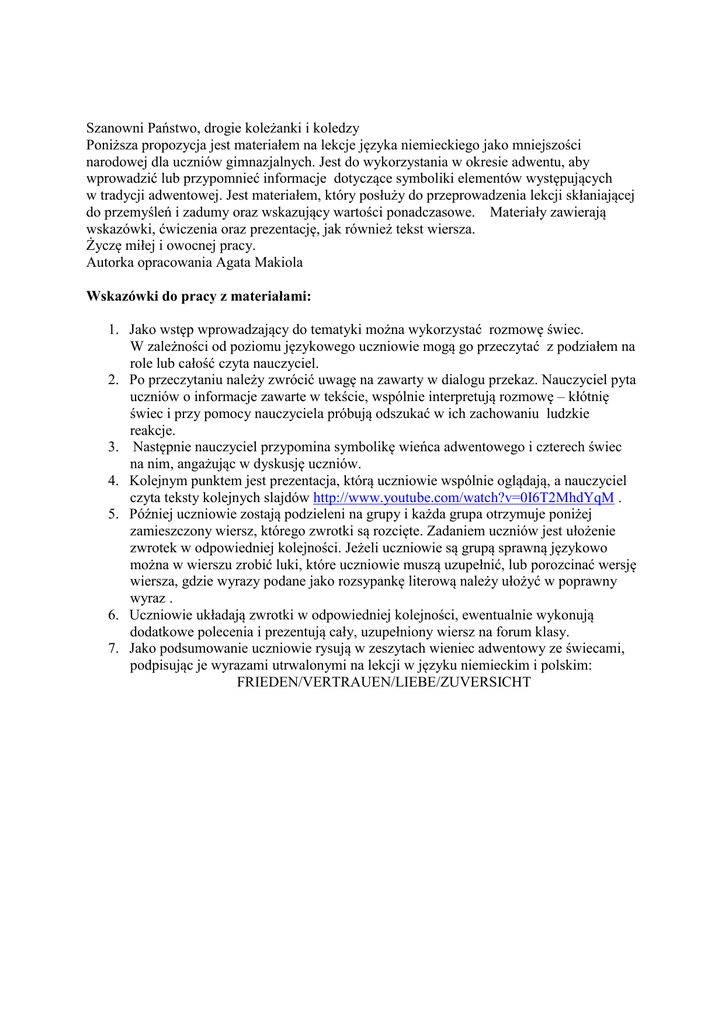Szanowni Państwo, drogie koleżanki i koledzy Poniższa propozycja jest materiałem na lekcje języka niemieckiego jako mniejszości narodowej dla uczniów gimnazjalnych. Jest do wykorzystania w okresie adwentu, aby wprowadzić lub przypomnieć informacje dotyczące symboliki elementów występujących w tradycji adwentowej. Jest materiałem, który posłuży do przeprowadzenia lekcji skłaniającej do przemyśleń i zadumy oraz wskazujący wartości ponadczasowe. Materiały zawierają wskazówki, ćwiczenia oraz prezentację, jak również tekst wiersza. Życzę miłej i owocnej pracy. Autorka opracowania Agata Makiola Wskazówki do pracy z materiałami: 1. Jako wstęp wprowadzający do tematyki można wykorzystać rozmowę świec. W zależności od poziomu językowego uczniowie mogą go przeczytać z podziałem na role lub całość czyta nauczyciel. 2. Po przeczytaniu należy zwrócić uwagę na zawarty w dialogu przekaz. Nauczyciel pyta uczniów o informacje zawarte w tekście, wspólnie interpretują rozmowę – kłótnię świec i przy pomocy nauczyciela próbują odszukać w ich zachowaniu ludzkie reakcje. 3. Następnie nauczyciel przypomina symbolikę wieńca adwentowego i czterech świec na nim, angażując w dyskusję uczniów. 4. Kolejnym punktem jest prezentacja, którą uczniowie wspólnie oglądają, a nauczyciel czyta teksty kolejnych slajdów http://www.youtube.com/watch?v=0I6T2MhdYqM . 5. Później uczniowie zostają podzieleni na grupy i każda grupa otrzymuje poniżej zamieszczony wiersz, którego zwrotki są rozcięte. Zadaniem uczniów jest ułożenie zwrotek w odpowiedniej kolejności. Jeżeli uczniowie są grupą sprawną językowo można w wierszu zrobić luki, które uczniowie muszą uzupełnić, lub porozcinać wersję wiersza, gdzie wyrazy podane jako rozsypankę literową należy ułożyć w poprawny wyraz . 6. Uczniowie układają zwrotki w odpowiedniej kolejności, ewentualnie wykonują dodatkowe polecenia i prezentują cały, uzupełniony wiersz na forum klasy. 7. Jako podsumowanie uczniowie rysują w zeszytach wieniec adwentowy ze świecami, podpisując je wyrazami utrwalonymi na lekcji w języku niemieckim i polskim: FRIEDEN/VERTRAUEN/LIEBE/ZUVERSICHT Der Streit der Adventskerzen (ein Stück zum Vorspielen von Kindern) von Alfons Schweigert Erzähler 1: Es waren einmal vier rote Adventskerzen. Die saßen auf einem schönen Adventskranz. Erzähler 2: Am ersten Sonntag im Advent sollte die erste Kerze brennen. Aber welche war die erste? Erzähler 1: Da fingen die vier Adventskerzen zu streiten an. 1. Kerze: Ich bin die erste Kerze! 2. Kerze: Nein, ich bin die erste Kerze! 3. Kerze: Was fällt euch ein, ich will als erste brennen! 4.Kerze: Was? Warum soll ich nicht als erste brennen? 1. Kerze: Nein! Ich bin größer als ihr. Ich darf zuerst leuchten! 2. Kerze: Ach was, ich bin röter als ihr. Ich muß zuerst angezündet werden. 3. Kerze: Nein, ich will als erste brennen! 2. Kerze: Warum eigentlich du? Mit welchem Recht? 3. Kerze: Weil ich den schönsten Docht von euch allen habe. Also darf ich auch zuerst brennen. Erzähler 1: Die vierte Kerze schüttelte den Kopf. 4. Kerze: Seht mich an. Ich stehe am geradesten auf im Kranz. Ihr drei seit krumm und schief. Deshalb muss i c h die erste sein. Erzähler 2: So stritten die vier hin und her. Sie stritten nicht nur am ersten Adventssonntag, nein auch am zweiten und dritten und sogar auch am vierten. Erzähler 1: Und sie waren sich immer noch nicht einig, welche von ihnen als erste brennen sollte. Erzähler 2: Da kam der Weihnachtsmann ins Zimmer und rief: Weihnachtsmann: Schluss jetzt mit eurer ewigen Streiterei! Wisst ihr überhaupt, welcher Tag heute ist? 1. Kerze: Nnnnnein.Jaaaaa. 2. Kerze: Heute ist Samstag. 3. Kerze: Ich weiß es nicht. 4. Kerze: Heute ist doch der vierte Adventssonntag. Weihnachtsmann: Seht ihr! Vor lauter Streiterei wisst ihr nicht einmal, dass heute der Heilige Abend ist. 1./2. Kerze: Wirklich! Heute kommt das Christkind. 3./4. Kerze: Und wir sollten es doch ankündigen. Weihnachtsmann: Genau! Und deswegen wird nicht mehr gestritten. Verstanden! Erzähler 1: Er nahm die Kerzen vom Adventskranz und befestigte sie auf dem Christbaum. 1.Kerze: Oh, Was macht der Mann mit mir? 2. Kerze: Wie geht er mit mir um? 3. Kerze: Nanu, wo bin ich jetzt? 4. Kerze: Was ist jetzt los? Erzähler 2: Dann zündete er alle vier gleichzeitig an. 4.Kerze: Ui, ich leuchte! 3. Kerze: Oh, ich brenne! 2. Kerze: Ah, ich strahle! 1. Kerze: Oh, ich wärme! Alle vier: Schön! Erzähler 1: Da waren die vier Kerzen plötzlich Weihnachtskerzen. Erzähler 2: Jetzt waren sie alle zufrieden und haben vor Freude ganz hell gestrahlt. Wiersz w wersji oryginalnej Die vier Kerzen Adventsgedicht Im Advent, zur Weihnachtszeit, da war es hell im Zimmer. Vier Kerzen waren aufgereiht, und leuchteten wie immer. Doch zum Flackern und zum Knistern hörte man die Kerzen flüstern. Die erste Kerze seufzt und spricht: “Mein Licht brennt für den FRIEDEN, die Menschen aber woll’n mich nicht, es ist nur Streit hienieden." Die Kerze verlor den schönen Glanz, wurde klein und kleiner und erlosch dann ganz. Die zweite Kerze traurig spricht: “Für den GLAUBEN will ich brennen, doch Gottes Worten glaubt man nicht, Glauben will man nicht mehr kennen.” Ein Luftzug wehte durch das Haus, die zweite Kerze, die ging aus. Die dritte Kerze kraftlos spricht: “Die LIEBE will ich künden, doch mit Neid und Hass im Angesicht kann kein Lieb’ man finden.” So flüsterte sie und ward ganz klein, erlosch und verlor den hellen Schein. Ins Zimmer trat ein kleines Kind, sah die Kerzen, die nicht scheinen, erloschen durch den kalten Wind, fast fing es an zu weinen. Mit Tränen es sehr traurig spricht: “Leuchtet, ich brauche euer Licht!” Da fällt die vierte Kerze ein: “HOFFNUNG will ich geben, mit meinem hellen Schein soll’n alle Kerzen leben. Hoffnung will ich hell verkünden und alle Kerzen neu entzünden!” ( Unbekannter Verfasser: In Versfo