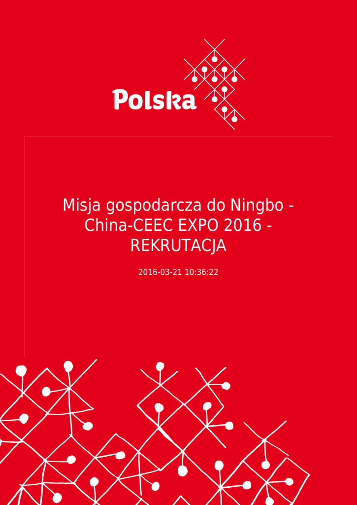 Misja gospodarcza do Ningbo China-CEEC EXPO 2016 REKRUTACJA 2016-03-21 10:36:22 2 Polska Agencja Informacji i Inwestycji Zagranicznych w ramach programu GoChina rozpoczyna nabór na misję gospodarczą do Ningbo (Chiny) w dniach 9-12 czerwca 2016. China-CEEC Investment and Trade Expo 2016 to targi towarów eksportowych z państw Europy Środkowej i Wschodniej. Impreza targowa odbywa się w mieście Ningbo (prowincja Zhejiang), jednym z głównych portów morskich w Chinach. Podczas targów prezentowana będzie oferta towarów rynkowych, a szczególnie istotne są takie branże, jak artykuły spożywcze, biżuteria, kosmetyki, nowoczesne wzornictwo wyrobów rynkowych (szkło, kryształ itp.), towary konsumpcyjne codziennego użytku, dzieła sztuki, prezenty, produkty ochrony zdrowia, artykuły gospodarstwa domowego, itp. Ponadto w ramach tegorocznej edycji targów po raz pierwszy wydzielona zostanie dodatkowa strefa - High & New Technology Fair - dedykowana produktom o wysokim zaawansowaniu technologicznym. Obecność handlowców, agentów, importerów, przedstawicieli chińskich sieci dystrybucji daje możliwość zbudowania doskonałych kontaktów przy wejściu na rynek chiński. Dla wyselekcjonowanych firm polskich PAIiIZ oferuje: ■ ■ ■ ■ ■ ■ ■ ■ ■ ■ bezpłatną powierzchnię targową dla polskich firm w ramach polskiego stoiska narodowego (ok. 9 m2/firmę) rabaty w hotelach na miejscu w Ningbo – hotele 3, 4, 5 – gwiazdkowe w cenie 330-580 RMB/dobę hotelową (ok. 50-88 EUR); obsługę logistyczną - bezpłatny transport z Szanghaju do Ningbo oraz transport pomiędzy hotelem a kompleksem targowym; udział w wydarzeniach organizowanych w czasie targów; dedykowane spotkania B2B; bezpłatny tłumacz angielsko-chiński dla każdej firmy; uproszczone procedury odprawy towarów; bezpłatny transport towarów (na terytorium Chin); pomoc przy przygotowaniu Państwa wizyty urządzenie stoiska w promocyjnej cenie - 2500 PLN (netto). Więcej informacji dostępnych pod adresem: www.gochina.gov.pl/China-CEEC_Investment_and_Trade_Expo_NINGBO_2016 Rekrutację eksporterów i zgłoszenia do udziału w ekspozycji prowadzi Polska Agencja Informacji i Inwestycji Zagranicznych, która służy także szeregiem praktycznych uwag i wskazówek związanych z przygotowaniem się do tej imprezy (w tym ważne formalności w odniesieniu do dostaw próbek towarów, aranżacji stoisk itp.) 3 Zgłoszenia należy składać do 25 marca 2016 roku poprzez formularz elektroniczny pod adresem: www.gochina.gov.pl/Ningbo_2016. Ilość bezpłatnych stoisk jest ograniczona, wyłącznie dla wyselekcjonowanych firm. 4