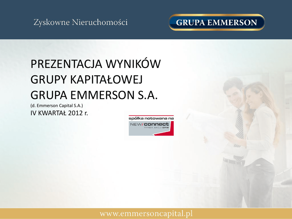 PREZENTACJA WYNIKÓW GRUPY KAPITAŁOWEJ GRUPA EMMERSON S.A. (d. Emmerson Capital S.A.) IV KWARTAŁ 2012 r. AGENDA Historia Profil działalności Projekty w realizacji Grupa Kapitałowa Wyniki finansowe Strategia rozwoju HISTORIA 19.08.2010 29.04.2011 Powstanie EMMERSON CAPITAL S.A. Rejestracja podwyższenia kapitału zakładowego Emmerson Capital S.A. do kwoty 1.050.000 zł w drodze emisji 3.000.000 akcji serii C oraz emisji 2.500.000 akcji serii D 26.08.2011 28.08.2012 12.11.2012 DEBIUT NA NEWCONNECT Rejestracja podwyższenia kapitału zakładowego Emmerson Capital S.A. do kwoty 1.800.000 zł w drodze emisji 7.500.000 akcji serii E Rejestracja podwyższenia kapitału zakładowego Emmerson Capital S.A. do kwoty 5.000.000 zł w drodze emisji 32.000.000 akcji serii F PROFIL DZIAŁALNOŚCI Grupa Emmerson S.A. (d.Emmerson Capital S.A.) zajmuje się inwestowaniem w atrakcyjne nieruchomości na terenie całej Polski. Spółka nabywa nieruchomości mieszkalne, komercyjne oraz grunty - na rachunek własny ze środków pozyskanych od inwestorów celem ich dalszej odsprzedaży. Emitent na bieżąco monitoruje oraz analizuje koniunkturę we wszystkich segmentach rynku nieruchomości. Emitent jest na etapie budowy portfela inwestycyjnego nieruchomości, które w założeniu mają przynieść jak najwyższą stopę zwrotu przy możliwie jak najmniejszym ryzyku inwestycyjnym. Zarówno w IV kwartale 2012 roku jak i obecnie prowadzone są rozmowy, które mają doprowadzić do kolejnych transakcji sprzedaży nieruchomości, w które zainwestował Emitent. Należy jednak pamiętać, że inwestycje na rynku nieruchomości najczęściej mają charakter długoterminowy. Dobór portfela inwestycyjnego oraz sam proces sprzedaży nieruchomości po optymalnej cenie wymaga czasu. Spółka angażuje się merytorycznie i kapitałowo w małe oraz średnie firmy w z branży budownictwa i nieruchomości, a także udział w innych przedsięwzięciach biznesowych na rynku nieruchomości, w roli inwestora pasywnego lub aktywnego. PROJEKTY W REALIZACJI NIERUCHOMOŚCI MIESZKANIOWE 7 mieszkań o łącznej powierzchni ok. 430 m kw. w apartamentowcu w centrum Warszawy mieszkania w innych miastach Polski (m.in. Kraków, Gdańsk) GRUNTY BUDOWLANE grunt budowlany w prestiżowej dzielnicy Gdyni o powierzchni 734 m kw. niezabudowane działki budowlane we Wrocławiu o łącznej powierzchni 4 751 m kw. PROJEKTY ZREALIZOWANE Od początku 2012 roku sprzedane zostały 3 z 5 wydzielonych działek we Wrocławiu: działka nr 32/4 AM 11 o powierzchni 0,1425 ha, działka nr 32/7 AM 11 o powierzchni 0,0577 ha oraz działka nr 32/8 AM 11 o powierzchni 0,1451 ha. W okresie objętym niniejszym raportem, na mocy umowy z dnia 3 grudnia 2012 r. Grupa Emmerson S.A. sfinalizowała transakcję sprzedaży działki gruntu nr 32/4 AM 11 położonej we Wrocławiu o powierzchni 0,1425 ha, na kwotę 590.000 zł. Sprzedaż powyższych gruntów stanowi element założonej przez Emitenta strategii rozwoju, która zakłada odsprzedaż wcześniej zakupionych aktywów finansowych po cenie umożliwiającej realizację planowanej średniorocznej stopy zwrotu na portfelu inwestycji. GRUPA KAPITAŁOWA Na dzień 31.12.2012 roku w skład Grupy Kapitałowej Emitenta wchodziły: EM-Inwestycje 2 Sp. z o.o. Podstawową działalnością Spółki jest wykonywanie robót ogólnobudowlanych. EM INVEST Sp. z o.o. Podstawową działalnością Spółki jest wykonywanie robót budowlanych oraz pośrednictwo w obrocie nieruchomościami. Koncept Media Sp. z o.o. Podstawowa działalność Spółki jest związana z budową stron internetowych. WYNIKI FINANSOWE GRUPA EMMERSON S.A. (wybrane dane jednostkowe z rachunku zysków i strat Emitenta) IV kwartał 2012 r. (rok bieżący) 01.10.2012 – 31.12.2012 IV kwartał 2011 r. (rok ubiegły) 01.10.2011 – 31.12.2011 Narastająco za okres od 01.01.2011 do 31.12.2011 Narastająco za okres od 01.09.2010 do 31.12.2011* 479 674,80 0,00 2 853,25 2 853,25 4 613,61 4 613,64 18 454,54 12 303,04 12 303,04 Zysk/strata na sprzedaży -435 121,64 - 98 504,21 -818 794,88 - 315 597,89 - 347 012,92 Zysk/strata na działalności operacyjnej -457 059,19 - 98 504,63 -841 644,22 - 315 598,47 - 347 013,50 Zysk/strata brutto -740 166,48 - 1 645 044,61 -4 376 039,63 - 1 897 930,58 - 1 929 345,61 Zysk/strata netto -1 054 578,59 - 1 351 190,13 -3 735 689,22 - 1 609 116,10 - 1 640 531,13 Wyszczególnienie Przychody netto ze sprzedaży Amortyzacja Narastająco za okres od 01.01.2012 do 31.12.2012 1 035 528,46 W 2012 roku Spółka osiągnęła przychody netto ze sprzedaży w wysokości 1.035.528,46 zł. Zaplanowane przedsięwzięcia inwestycyjne na rynku nieruchomości zaczynają zatem przynosić już pierwsze efekty. Strata netto jest przede wszystkim rezultatem wyceny bilansowej instrumentów finansowych (niski kurs rynkowy posiadanych walorów finansowych). WYNIKI FINANSOWE GRUPY KAPITAŁOWEJ GRUPA EMMERSON S.A. (wybrane dane skonsolidowane z rachunku zysków i strat Grupy Kapitałowej Grupa Emmerson S.A.) IV kwartał 2012 r. (rok bieżący) 01.10.2012 – 31.12.2012 IV kwartał 2011 r. (rok ubiegły) 01.10.2011 – 31.12.2011 Narastająco za okres od 01.01.2012 do 31.12.2012 Narastająco za okres od 01.01.2011 do 31.12.2011 Narastająco za okres od 01.09.2010 do 31.12.2011* 479 674,80 0,00 1 035 528,46 2 853,25 2 853,25 4 613,61 4 613,64 18 454,54 12 303,04 12 303,04 Zysk/strata na sprzedaży -435 121,64 - 98 504,21 -818 794,88 - 315 597,89 - 347 012,92 Zysk/strata na działalności operacyjnej -457 059,19 - 98 504,63 -841 644,22 - 315 598,47 - 347 013,50 Zysk/strata brutto -740 166,48 - 1 645 044,61 -4 376 039,63 - 1 897 930,58 - 1 929 345,61 Zysk/strata netto -1 054 578,59 - 1 351 190,13 -3 735 689,22 - 1 609 116,10 - 1 640 531,13 Wyszczególnienie Przychody netto ze sprzedaży Amortyzacja UWAGA: W zakresie skonsolidowanych wyników Grupy Kapitałowej Grupa Emmerson S.A. konsolidacją zostały objęte wyniki spółki EM-Inwestycje 2 Sp. z o.o. STRATEGIA ROZWOJ