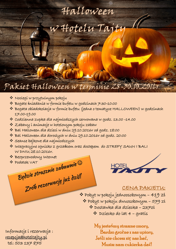 Halloween • w Hotelu Tajty Pakiet Halloween w terminie 28-30.10.2016r Noclegi w przytulnym pokoju Bogate śniadania w formie bufetu w godzinach 7:30-10:00 Bogata obiadokolacja w formie bufetu (jedna o tematyce HALLOWEEN) w godzinach 17.00-19.00 Codzienna zupka dla najmłodszych serwowana w godz. 13.00 -14.00 Zabawy i animacje w hotelowym pokoju zabaw Bal Halloween dla dzieci w dniu 29.10.2016r od godz. 18:00 Bal Halloween dla dorosłych w dniu 29.10.2016r od godz. 20:00 Seanse bajkowe dla najmłodszych Integracyjne ognisko z grzańcem oraz dostępem do STREFY SAUN I BALI W DNIU 28.10.2016r. Bezprzewodowy Internet Podatek VAT CENA PAKIETU: Pobyt w pokoju jednoosobowym – 419 zł Pobyt w pokoju dwuosobowym – 579 zł Dostawka dla dziecka – 237zł Dziecko do lat 4 – gratis Informacje i rezerwacja : [email protected] tel: 503 137 875 My jesteśmy straszne zmory, Bardzo groźne z nas upiory, Jeśli nie chcesz się nas bać, Musisz nam cukierka dać!