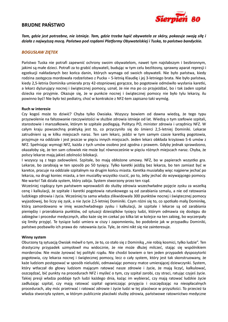 BRUDNE PAŃSTWO Tam, gdzie jest potrzebne, nie istnieje. Tam, gdzie trzeba łupić obywatela ze skóry, pokazuje swoją siłę i działa z najwyższą mocą. Państwo pod rządami Platformy Obywatelskiej i Tuska, to państwo bandyckie. BOGUSŁAW ZIĘTEK Państwo Tuska nie potrafi zapewnić ochrony swoim obywatelom, nawet tym najsłabszym i bezbronnym, jakimi są małe dzieci. Potrafi za to grabić obywateli, budując w tym celu bezlitosny, sprawny aparat represji i egzekucji nakładanych bez końca danin, których wymaga od swoich obywateli. Nie było państwa, kiedy rodzina zastępcza mordowała rodzeństwo z Pucka – 5-letnią Klaudię i jej 3-letniego brata. Nie było państwa, kiedy 2,5-letnia Dominika umierała przy 42-stopniowej gorączce, bo pogotowie odmówiło wysłania karetki, a lekarz dyżurujący nocnej i świątecznej pomocy, uznał, że nie ma po co przyjeżdżać, bo i tak żaden szpital dziecka nie przyjmie. Okazuje się, że w punkcie nocnej i świątecznej pomocy nie było tylu lekarzy, ilu powinno być! Nie było też pediatry, choć w kontrakcie z NFZ-tem zapisano taki wymóg. Ruch w interesie Czy kogoś może to dziwić? Chyba tylko Owsiaka. Wszyscy bowiem od dawna wiedzą, że tego typu przyzwolenie na fałszowanie rzeczywistości w służbie zdrowia istnieje od lat. Wiedzą o tym szefowie szpitali, starostowie i marszałkowie, którym te szpitale podlegają. Politycy PO, minister zdrowia i urzędnicy NFZ. W całym kraju powszechną praktyką jest to, co przyczyniło się do śmierci 2,5-letniej Dominiki. Lekarze zatrudnieni są w kilku miejscach naraz. Ten sam lekarz, jeździ w tym samym czasie karetką pogotowia, przyjmuje na oddziale i jest jeszcze w pięciu innych miejscach. Jeden lekarz obkłada krzyżowo 5-6 umów z NFZ. Spełniając wymogi NFZ, każda z tych umów osobno jest zgodna z prawem. Gdyby jednak sprawdzono, okazałoby się, że ten sam człowiek nie może być równocześnie w pięciu różnych miejscach naraz. Chyba, że polscy lekarze mają jakieś zdolności bilokacji. I wszyscy są z tego zadowoleni. Szpitale, bo mają obłożone umowy. NFZ, bo w papierach wszystko gra. Lekarze, bo zarabiają w ten sposób po 50 tysięcy. Tylko karetki jeżdżą bez lekarza, bo ten zamiast być w karetce, pracuje na oddziale szpitalnym na drugim końcu miasta. Karetka musiałaby więc najpierw jechać po lekarza, na drugi koniec miasta, a ten musiałby wszystko rzucić, po to, żeby jechać do wzywającego pomocy. Nie warto! Tak działa system, który zabija. System stworzony przez ten rząd. Wcześniej rządzący tym państwem wprowadzili do służby zdrowia wszechwładne pojęcie zysku za wszelką cenę i kalkulacji, że szpitale i karetki pogotowia ratunkowego są od zarabiania szmalu, a nie od ratowania ludzkiego zdrowia i życia. Wcześniej ta sama władza zlikwidowała 300 punktów nocnej i świątecznej pomocy wyjazdowej, bo liczy się zysk, a nie życie 2,5-letniej Dominiki. Czym różni się to, co spotkało małą Dominikę, którą zamordowano w imię wszechwładnego zysku i kalkulacji, że szpitale i lekarze są od zarabiania pieniędzy i przerabiania punktów, od sytuacji dziesiątków tysięcy ludzi, którym odmawia się dostępu do zabiegów i procedur medycznych, albo każe się im czekać po kilka lat w kolejce na ten zabieg, bo wyczerpały się limity przyjęć. Te tysiące ludzi umiera w ciszy i zapomnieniu, bo podobnie jak w przypadku Dominiki, państwo pozbawiło ich prawa do ratowania życia. Tyle, że nimi nikt się nie zainteresuje. Winny system Oburzony tą sytuacją Owsiak mówił o tym, że to, co stało się z Dominiką „nie robią kosmici, tylko ludzie”. Ten drastyczny przypadek uzmysłowił mu widocznie, że nie może dłużej milczeć, stając się wspólnikiem morderców. Nie może żyrować tej polityki rządu. Nie chodzi bowiem o ten jeden przypadek dyspozytorki pogotowia, czy lekarza nocnej i świątecznej pomocy, lecz o cały system, który jest tak skonstruowany, że każe ludziom postępować w sposób nieludzki, odmawiając pomocy matce umierającej dziewczynki. System, który wtłaczał do głowy ludziom mającym ratować nasze zdrowie i życie, że mają liczyć, kalkulować, oszczędzać, bić punkty na procedurach NFZ i myśleć o tym, czy szpital zarobi, czy straci, ratując czyjeś życie. Takiej presji władza poddaje tych ludzi każdego dnia, każąc im wybierać, czy mają ratować ludzkie życie zadłużając szpital, czy mają ratować szpital ograniczając przyjęcia i oszczędzając na nieopłacalnych procedurach, aby móc przetrwać i ratować zdrowie i życie ludzi w tej placówce w przyszłości. To przecież ta władza stworzyła system, w którym publicznie placówki służby zdrowia, państwowe ratownictwo medyczne ma obowiązek ratować zdrowie i życie ludzi, wykonując niskowyceniane i nieopłacalne procedury, które zadłużają publiczną służbę zdrowia na miliardy złotych, a prywatne szpitale są od zarabiania milionów, na kontraktach z NFZ, bo one ratować niczyjego życia nie muszą. One mogą skoncentrować się wyłącznie na zbijaniu kasy, żerując na naszym zdrowiu. To państwo stworzyło taki system, w którym publiczne pieniądze – około 60 mld zł – transferowane są do prywatnych spółek przejmujących szpitale, a w publicznej służbie zdrowia ludzie zdychają, bo brakuje na wszystko i trzeba liczyć każdą złotówkę, pod presją narastających wielomiliardowych długów. Ci sami ludzie, którzy tworzą taki system, potem bezczelnie mogą oświadczyć, że trzeba wszystko sprywatyzować, bo publiczne szpitale nie radzą sobie i potrafią się tylko zadłużać. Ale, aby te prywatne szpitale mogły zarabiać miliony, niezbędne są im nasze – publiczne pieniądze. I nic nie będzie... To samo państwo, które nie potrafiło ochronić rodzeństwa z Pucka i małej Dominiki, inne dzieci potrafi pozbawić wszelkich szans. Najpierw na edukację. W tym roku w całym kraju 