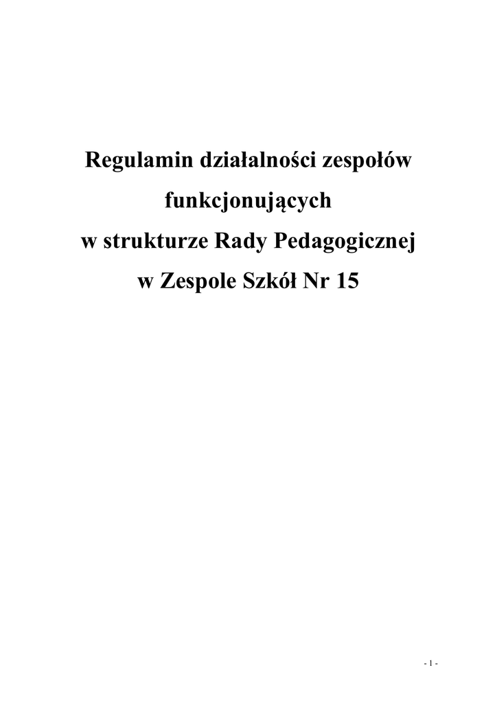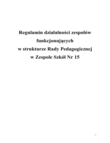 Regulamin działalności zespołów funkcjonujących w strukturze Rady Pedagogicznej w Zespole Szkół Nr 15 -1- §1 POSTANOWIENIA OGÓLNE 1. W Zespole Szkół nr 15 funkcjonują zespoły powołane zgodnie z postanowieniami Statutu. 2. Pracą zespołu kieruje przewodniczący powołany przez dyrektora szkoły. 3. W ramach zespołów oraz poza ich strukturami można tworzyć sekcje. 4. Pracą sekcji kieruje nauczyciel wyznaczony przez dyrektora pełniący funkcję koordynatora. 5. Skład osobowy poszczególnych zespołów i sekcji określa dyrektor uwzględniając specyfikę nauczanych przez nauczycieli przedmiotów i rodzaj zadań do wykonania. 6. Skład osobowy zespołów i sekcji może ulec zmianie w ciągu roku szkolnego. §2 ZESPOŁY I SEKCJE 1. Zespół Nauczycieli Nauczania Zintegrowanego tworzą nauczyciele nauczania zintegrowanego, języka obcego, religii w zakresie pierwszego etapu edukacyjnego, gimnastyki korekcyjnej, zespołów wyrównawczych, zespołu korekcyjno kompensacyjnego, wychowawcy świetlicy. 2. Zespół Nauczycieli Bloku Humanistycznego tworzą nauczyciele następujących przedmiotów: j.polski, historia, wos, sztuka (plastyka, muzyka), religia, bibliotekoznawstwo. 3. Zespół Nauczycieli Bloku Matematyczno-Przyrodniczego tworzą nauczyciele następujących przedmiotów: matematyka, przyroda, fizyka, chemia, geografia, biologia, technika, informatyka. 4. Zespół Nauczycieli Języków Obcych tworzą nauczyciele następujących przedmiotów: j.niemiecki, j.angielski.. 5. Zespół Nauczycieli Wychowania Fizycznego tworzą nauczyciele tego przedmiotu. 6. Zespół Nauczycieli Wychowawców tworzą nauczyciele wychowawcy. Zespół pracuje w sekcjach: a) sekcja wychowawców klas I – III Szkoły Podstawowej b) sekcja wychowawców klas czwartych SP c) sekcja wychowawców klas piątych SP -2- 7. d) sekcja wychowawców klas szóstych SP e) sekcja wychowawców klas pierwszych gimnazjum f) sekcja wychowawców klas drugich gimnazjum g) sekcja wychowawców klas trzecich gimnazjum Zespół Diagnozy i Ewaluacji Szkolnej tworzą nauczyciele różnych specjalności powołani przez dyrektora. W skład zespołu diagnozy i ewaluacji szkolnej obligatoryjnie wchodzą przewodniczący zespołów wymienionych w ust. 1 – 5 oraz pedagodzy szkolni. 8. Do realizacji określonych zadań, w zakresie wewnętrznego i zewnętrznego mierzenia jakości pracy szkoły, wynikających z Planu Pracy Zespołu nr 15 powołuje się sekcje: 9. a) humanistyczne, b) matematyczno-przyrodnicze, c) wychowawcze. Szczegółowy rodzaj zadań do wykonania przez poszczególne sekcje oraz Zespół Diagnozy i Ewaluacji Szkolnej określa dyrektor w Planie nadzoru pedagogicznego ZS nr 15 w Toruniu. 10. Sekcja liczy od 2 do 5 osób wyznaczonych przez dyrektora spośród wszystkich nauczycieli. 11. Osoba koordynująca pracę sekcji odpowiedzialna jest za wykonanie zadania, które zostało wyznaczone nauczycielom tworzącym sekcję. §3 PLAN PRACY ZESPOŁU 1. Każdy zespół pracuje zgodnie z opracowanym i zatwierdzonym przez dyrektora szkoły „Planem Pracy Zespołu”. 2. Plan pracy zespołu musi uwzględniać następujące zadania: a) diagnozę wiedzy i umiejętności uczniów, b) wymianę doświadczeń pedagogicznych (np. lekcje otwarte, opracowanie i prezentacja ciekawych planów metodycznych, itp.) c) rozwijanie zainteresowań i uzdolnień uczniów (np. organizacja konkursów przedmiotowych, międzyprzedmiotowych i imprez ogólnoszkolnych), -3- d) doskonalenie warsztatu pracy (np. projekt międzyprzedmiotowy, opracowanie testów, sprawdzianów, dyktand, itp.) e) spotkania doskonaląco-informacyjne, służące m.in. wymianie doświadczeń z ukończonych przez członków zespołu form doskonalenia zawodowego, f) 3. inne zadania określone przez członków zespołu. W planie pracy zespołu należy wskazać nauczycieli odpowiedzialnych za wykonanie poszczególnych zadań. 4. Plan pracy zespołu sporządzany jest przy wykorzystaniu techniki komputerowej. §4 ZADANIA ZESPOŁÓW. ZADANIA PRZEWODNICZĄCEGO 1. Zadaniem zespołów określonych w §2 ust.1 – 5 jest szeroko rozumiane doskonalenie i unowocześnianie procesu dydaktyczno-wychowawczego służące podnoszeniu jakości pracy nauczycieli i szkoły oraz zaspakajanie potrzeb edukacyjnych uczniów umożliwiających rozwijaniu talentów i zainteresowań. 2. Zadaniem Zespołu Diagnozy i Ewaluacji Szkolnej jest organizowanie i przeprowadzanie badań z zakresu wewnętrznego mierzenia jakości pracy szkoły, wynikających z przyjętych w szkole obszarów i standardów pracy, przygotowanie narzędzi badawczych, opracowanie raportów, wspomaganie sekcji wymienionych w §2 ust.7 w realizacji przydzielonych im zadań. 3. Zadaniem Zespołu Wychowawców jest przygotowanie do planu wychowawczego szkoły propozycji zadań i sposobów ich realizacji, wymiana doświadczeń z zakresu organizacji procesu wychowawczego, popularyzacja wśród uczniów i rodziców literatury popularno-naukowej, aktów prawnych i innych dokumentów, których problematyka dotyczy szeroko pojętego wychowania, profilaktyki uzależnień, praw dziecka, praw i obowiązków ucznia. 4. Do zadań przewodniczącego zespołu należy: a) organizowanie pracy zespołu, b) monitorowanie rytmiczności wykonania zadań zaplanowanych do realizacji, c) przedkładanie, w wyznaczonym terminie, dyrektorowi szkoły podpisanego planu pracy zespołu, -4- d) sporządzanie, przy wykorzystaniu techniki komputerowej, semestralnego i rocznego sprawozdania z działalności zespołu, e) organizowanie i przeprowadzenie, w uzgodnieniu z przewodniczącym zespołu diagnozy i ewaluacji szkolnej, badań zaplanowanych przez zespół, f) dokumentowanie pracy zespołu (protokoły z posiedzeń zespołu, wypracowane materiały, raporty z przeprowadzonych badań, itp.) §5 POSTANOWIENIA KOŃCOWE 1. Zmiany do regulaminu wprowadza dyrektor szkoły. 2. Załącznikami do Regulaminu są: składy osobowe poszczególnych zespołów i sekcji. 3. Załączniki,