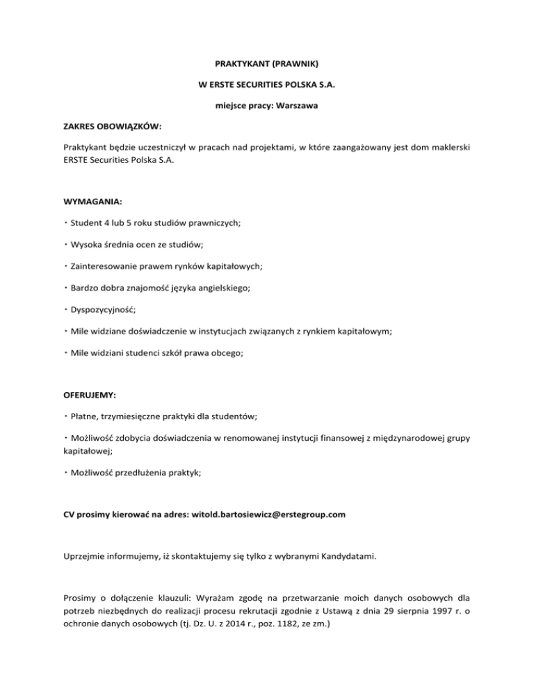 PRAKTYKANT (PRAWNIK) W ERSTE SECURITIES POLSKA S.A. miejsce pracy: Warszawa ZAKRES OBOWIĄZKÓW: Praktykant będzie uczestniczył w pracach nad projektami, w które zaangażowany jest dom maklerski ERSTE Securities Polska S.A. WYMAGANIA: ▪ Student 4 lub 5 roku studiów prawniczych; ▪ Wysoka średnia ocen ze studiów; ▪ Zainteresowanie prawem rynków kapitałowych; ▪ Bardzo dobra znajomość języka angielskiego; ▪ Dyspozycyjność; ▪ Mile widziane doświadczenie w instytucjach związanych z rynkiem kapitałowym; ▪ Mile widziani studenci szkół prawa obcego; OFERUJEMY: ▪ Płatne, trzymiesięczne praktyki dla studentów; ▪ Możliwość zdobycia doświadczenia w renomowanej instytucji finansowej z międzynarodowej grupy kapitałowej; ▪ Możliwość przedłużenia praktyk; CV prosimy kierować na adres: [email protected] Uprzejmie informujemy, iż skontaktujemy się tylko z wybranymi Kandydatami. Prosimy o dołączenie klauzuli: Wyrażam zgodę na przetwarzanie moich danych osobowych dla potrzeb niezbędnych do realizacji procesu rekrutacji zgodnie z Ustawą z dnia 29 sierpnia 1997 r. o ochronie danych osobowych (tj. Dz. U. z 2014 r., poz. 1182, ze zm.)