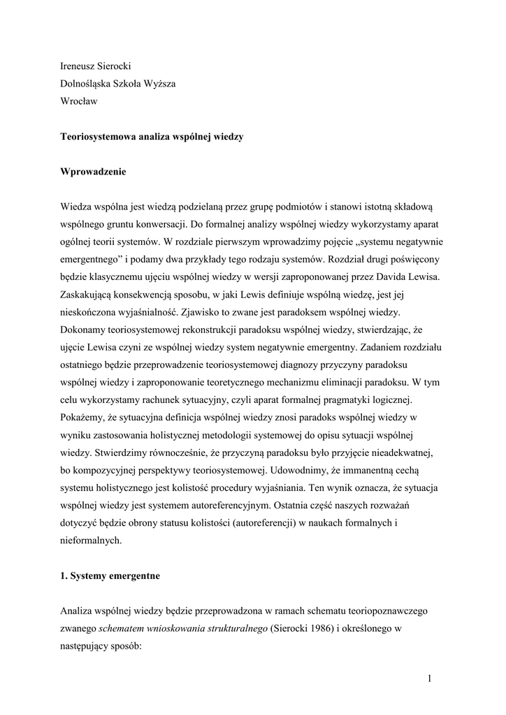 Ireneusz Sierocki Dolnośląska Szkoła Wyższa Wrocław Teoriosystemowa analiza wspólnej wiedzy Wprowadzenie Wiedza wspólna jest wiedzą podzielaną przez grupę podmiotów i stanowi istotną składową wspólnego gruntu konwersacji. Do formalnej analizy wspólnej wiedzy wykorzystamy aparat ogólnej teorii systemów. W rozdziale pierwszym wprowadzimy pojęcie „systemu negatywnie emergentnego” i podamy dwa przykłady tego rodzaju systemów. Rozdział drugi poświęcony będzie klasycznemu ujęciu wspólnej wiedzy w wersji zaproponowanej przez Davida Lewisa. Zaskakującą konsekwencją sposobu, w jaki Lewis definiuje wspólną wiedzę, jest jej nieskończona wyjaśnialność. Zjawisko to zwane jest paradoksem wspólnej wiedzy. Dokonamy teoriosystemowej rekonstrukcji paradoksu wspólnej wiedzy, stwierdzając, że ujęcie Lewisa czyni ze wspólnej wiedzy system negatywnie emergentny. Zadaniem rozdziału ostatniego będzie przeprowadzenie teoriosystemowej diagnozy przyczyny paradoksu wspólnej wiedzy i zaproponowanie teoretycznego mechanizmu eliminacji paradoksu. W tym celu wykorzystamy rachunek sytuacyjny, czyli aparat formalnej pragmatyki logicznej. Pokażemy, że sytuacyjna definicja wspólnej wiedzy znosi paradoks wspólnej wiedzy w wyniku zastosowania holistycznej metodologii systemowej do opisu sytuacji wspólnej wiedzy. Stwierdzimy równocześnie, że przyczyną paradoksu było przyjęcie nieadekwatnej, bo kompozycyjnej perspektywy teoriosystemowej. Udowodnimy, że immanentną cechą systemu holistycznego jest kolistość procedury wyjaśniania. Ten wynik oznacza, że sytuacja wspólnej wiedzy jest systemem autoreferencyjnym. Ostatnia część naszych rozważań dotyczyć będzie obrony statusu kolistości (autoreferencji) w naukach formalnych i nieformalnych. 1. Systemy emergentne Analiza wspólnej wiedzy będzie przeprowadzona w ramach schematu teoriopoznawczego zwanego schematem wnioskowania strukturalnego (Sierocki 1986) i określonego w następujący sposób: 1 a) Dany jest system S zbudowany z n-systemów składowych (obiektów) S1, ..., Sn. b) Systemy składowe S1,..., Sn posiadają własność W. c) Pytanie: czy system złożony S posiada również własność W? Jeżeli odpowiedź jest pozytywna, to system S nazwiemy nieemergentnym (addytywnym); w przeciwnym wypadku będzie on nazywany systemem emergentnym (addytywnym) (Foo, Ziegler 1985, Searle 1999, Sierocki 1986). Dalej powiemy, że emergentny system S jest negatywny, jeżeli własność W jest pozytywna (dobra, pożądana). Systemy negatywnie emergentne to zatem takie systemy, które nie dziedziczą pozytywnej własności swoich składowych. W analogiczny sposób definiowany jest system pozytywnie emergentny. Przytoczymy teraz dwa przykłady systemów negatywnie emergentnych. Pierwszy z nich pochodzi ze świata matematyki, natomiast drugi ze świata społecznego. Przykład 1. System liczb (arytmetyka) a) System liczb S z dodawaniem i mnożeniem jest zbudowany z systemu S1 liczb z dodawaniem i systemu S2 liczb z mnożeniem. b) Wiadomo, ze systemy S1 i S2 są zupełne (rozstrzygalne), tzn. w skończonej ilości kroków można udowodnić, czy jakieś zdanie tych systemów jest, czy też nie jest prawdziwe. c) Pytanie czy arytmetyka z dodawaniem i mnożeniem jest systemem zupełnym, zostało negatywnie rozstrzygnięte w ramach słynnego twierdzenia Gödla. Swobodny sens twierdzenia Gödla jest następujący: istnieją niedowodliwe prawdy matematyczne. Tym samym, mówiąc metaforycznie, Gödel wykazał, ze matematyka jest jedyną religią, która udowodniła, że nią jest (Barrow 2005). Przykład 2. System wyborców (kolektyw wyborczy) a) System wyborców S składa się z n-obywateli S1, ..., Sn. b) Zakłada się, że preferencje każdego obywatela Si spełniają jeden z warunków racjonalności, czyli są przechodnie, tzn. że jeżeli Si woli X niż Y i Si woli Y niż Z, to Si woli X niż Z. c) Pytanie, czy preferencje kolektywu wyborców są również przechodnie, ma rozstrzygnięcie negatywne. Mocniejsza wersja tego faktu jest zawarta w twierdzeniu Arrowa mówiącego o tym, że nie istnieje wiarygodny sposób uzyskania racjonalnych wyborów kolektywnych. Twierdzenie Arrowa jest świetnie obrazowane przez następujące zdanie: w autokracji jedna osoba działa tak, jak chce, w arystokracji kilka osób działa tak, jak chce, w demokracji nikt nie działa tak, jak chce (Barrow 2005). 2. Wiedza indywidualna a wiedza wspólna Wiedza indywidualna podmiotu Si jest reprezentowana za pomocą zwrotu „Si wie, że X”, przy czym X jest zdaniem. Na użytek tej pracy przyjmujemy klasyczną definicję wiedzy, tzn. zakładamy, że Si wie, że X, wtedy i tylko wtedy, gdy: (a) Si jest przekonany, że X; (b) X jest prawdziwe; (c) X jest uzasadnione. (Zrewidowana wersja tej definicji jest zamieszczona w: Woleński 2001). Dodatkowo, ze względu na charakter wiedzy wspólnej, wprowadzamy aksjomat stwierdzający, że wiedza o X pociąga wiedzę o wiedzy o X. To oznacza, iż zakładamy, że zachodzi następująca implikacja: jeżeli Si wie, że X, to Si wie, że wie, że X. Z tego aksjomatu wynika bezpośrednio następująca charakterystyka wiedzy indywidualnej: Twierdzenie 1. Wiedza indywidualna jest skończenie iterowana, tzn. Si wie, że wie, ..., że wie, że X. wtedy i tylko wtedy, gdy Si wie, że X. Mówiąc równoważnie, skończona iterowalność wiedzy indywidualnej oznacza, że wielokrotne użycie operatora „wiem” jest redukowalne do jego jednokrotnego zastosowania. Mówiąc swobodnie, wiedza wspólna o X jest wiedzą podzielaną przez grupę podmiotów. Podstawowym zastosowaniem wspólnej wiedzy w teorii i praktyce komunikacyjnej jest to, że wiedza ta stanowi istotną składową wspólnego gruntu konwersacji (Devlin 1999). To oznacza, że wspólnota epistemiczna, czyli grupa podmiotów posiadająca wspólną wiedzę, jest zasadniczą częścią wspólnoty komunikacyjnej. Analiza zastosowań wspólnej wiedzy w teorii rozpro
