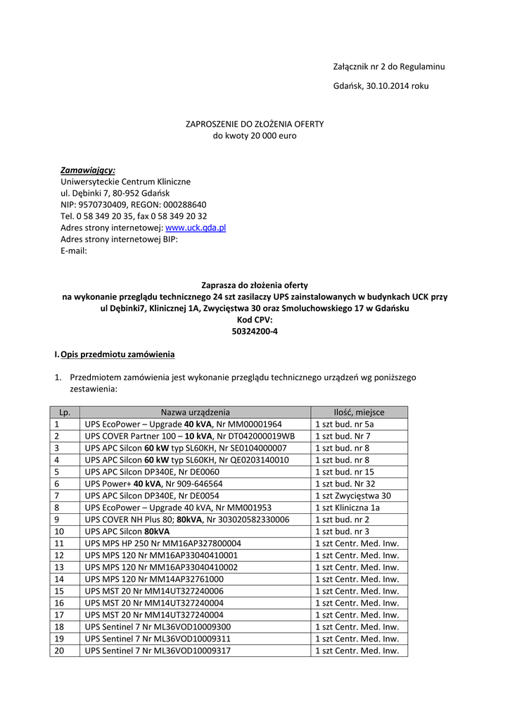 Załącznik nr 2 do Regulaminu Gdańsk, 30.10.2014 roku ZAPROSZENIE DO ZŁOŻENIA OFERTY do kwoty 20 000 euro Zamawiający: Uniwersyteckie Centrum Kliniczne ul. Dębinki 7, 80-952 Gdańsk NIP: 9570730409, REGON: 000288640 Tel. 0 58 349 20 35, fax 0 58 349 20 32 Adres strony internetowej: www.uck.gda.pl Adres strony internetowej BIP: E-mail: Zaprasza do złożenia oferty na wykonanie przeglądu technicznego 24 szt zasilaczy UPS zainstalowanych w budynkach UCK przy ul Dębinki7, Klinicznej 1A, Zwycięstwa 30 oraz Smoluchowskiego 17 w Gdańsku Kod CPV: 50324200-4 I. Opis przedmiotu zamówienia 1. Przedmiotem zamówienia jest wykonanie przeglądu technicznego urządzeń wg poniższego zestawienia: Lp. 1 2 3 4 5 6 7 8 9 10 11 12 13 14 15 16 17 18 19 20 Nazwa urządzenia UPS EcoPower – Upgrade 40 kVA, Nr MM00001964 UPS COVER Partner 100 – 10 kVA, Nr DT042000019WB UPS APC Silcon 60 kW typ SL60KH, Nr SE0104000007 UPS APC Silcon 60 kW typ SL60KH, Nr QE0203140010 UPS APC Silcon DP340E, Nr DE0060 UPS Power+ 40 kVA, Nr 909-646564 UPS APC Silcon DP340E, Nr DE0054 UPS EcoPower – Upgrade 40 kVA, Nr MM001953 UPS COVER NH Plus 80; 80kVA, Nr 303020582330006 UPS APC Silcon 80kVA UPS MPS HP 250 Nr MM16AP327800004 UPS MPS 120 Nr MM16AP33040410001 UPS MPS 120 Nr MM16AP33040410002 UPS MPS 120 Nr MM14AP32761000 UPS MST 20 Nr MM14UT327240006 UPS MST 20 Nr MM14UT327240004 UPS MST 20 Nr MM14UT327240004 UPS Sentinel 7 Nr ML36VOD10009300 UPS Sentinel 7 Nr ML36VOD10009311 UPS Sentinel 7 Nr ML36VOD10009317 Ilość, miejsce 1 szt bud. nr 5a 1 szt bud. Nr 7 1 szt bud. nr 8 1 szt bud. nr 8 1 szt bud. nr 15 1 szt bud. Nr 32 1 szt Zwycięstwa 30 1 szt Kliniczna 1a 1 szt bud. nr 2 1 szt bud. nr 3 1 szt Centr. Med. Inw. 1 szt Centr. Med. Inw. 1 szt Centr. Med. Inw. 1 szt Centr. Med. Inw. 1 szt Centr. Med. Inw. 1 szt Centr. Med. Inw. 1 szt Centr. Med. Inw. 1 szt Centr. Med. Inw. 1 szt Centr. Med. Inw. 1 szt Centr. Med. Inw. 21 22 23 24 UPS Sentinel 7 Nr ML36VOD10009322 UPS Sentinel 7 Nr ML36VOD10009323 UPS Sentinel 7 Nr ML36VOD10009324 UPS Sentinel 7 Nr ML36VOD10009325 1 szt Centr. Med. Inw. 1 szt Centr. Med. Inw. 1 szt Centr. Med. Inw. 1 szt Centr. Med. Inw. 2. Dostawa/realizacja przedmiotu zamówienia nastąpi: miesiąc od daty podpisania umowy II. Sposób sporządzenia oferty 1. 2. 3. 4. 5. 6. 7. Ofertę należy sporządzić wg wzoru stanowiącego załącznik nr 1 do niniejszego zaproszenia Ofertę należy złożyć/przesłać na adres: [email protected] W przypadku składania oferty w formie papierowej na kopercie należy umieścić napis: „Oferta na wykonanie przeglądu technicznego 24 szt zasilaczy UPS” W przypadku składania oferty drogą mailową należy przesłać ofertę na adres e-mail: [email protected] w formie załącznika podpisanego przez osobę upoważnioną. Oferta musi być podpisana przez osobę uprawnioną do reprezentowania Wykonawcy bądź osobę upoważnioną przez Wykonawcę na piśmie Ceny w ofercie muszą być wyrażone w polskich złotych i zaokrąglone do dwóch miejsc po przecinku) Rozliczenia między Zamawiającym a wykonawcą będą prowadzone tylko w złotych polskich III. Oferta musi zawierać następujące dokumenty i informacje: 1. Formularz oferty – wg wzoru stanowiącego załącznik 1 do niniejszego zaproszenia IV. Termin złożenia oferty: Do 12.11.2014 roku do godziny 11.00. V. Osoba uprawniona do kontaktów: Mgr inż. Halina Dorocińska Tel 58 349 20 39 Fax 58 349 20 32 e-mail [email protected] VI. Kryterium: 100% cena VII. Pozostałe informacje: 1. Zamawiający zastrzega sobie prawo do unieważnienia postępowania na każdym etapie przed podpisaniem umowy bez podawania przyczyn.