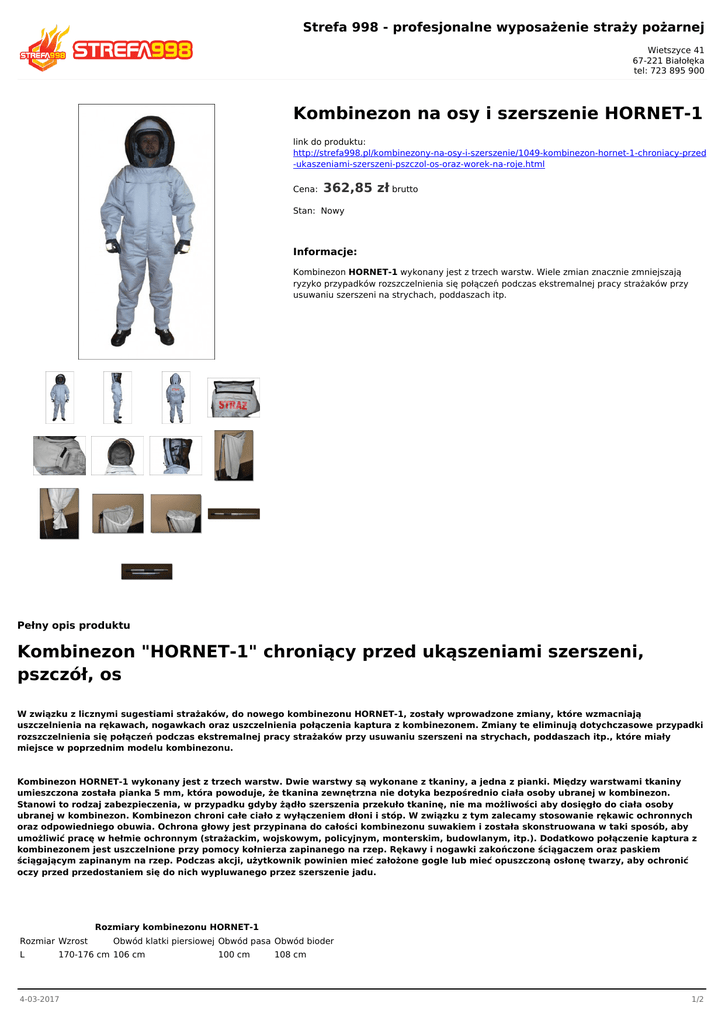 Strefa 998 - profesjonalne wyposażenie straży pożarnej Wietszyce 41 67-221 Białołęka tel: 723 895 900 Kombinezon na osy i szerszenie HORNET-1 link do produktu: http://strefa998.pl/kombinezony-na-osy-i-szerszenie/1049-kombinezon-hornet-1-chroniacy-przed -ukaszeniami-szerszeni-pszczol-os-oraz-worek-na-roje.html Cena: 362,85 zł brutto Stan: Nowy Informacje: Kombinezon HORNET-1 wykonany jest z trzech warstw. Wiele zmian znacznie zmniejszają ryzyko przypadków rozszczelnienia się połączeń podczas ekstremalnej pracy strażaków przy usuwaniu szerszeni na strychach, poddaszach itp. Pełny opis produktu Kombinezon "HORNET-1" chroniący przed ukąszeniami szerszeni, pszczół, os W związku z licznymi sugestiami strażaków, do nowego kombinezonu HORNET-1, zostały wprowadzone zmiany, które wzmacniają uszczelnienia na rękawach, nogawkach oraz uszczelnienia połączenia kaptura z kombinezonem. Zmiany te eliminują dotychczasowe przypadki rozszczelnienia się połączeń podczas ekstremalnej pracy strażaków przy usuwaniu szerszeni na strychach, poddaszach itp., które miały miejsce w poprzednim modelu kombinezonu. Kombinezon HORNET-1 wykonany jest z trzech warstw. Dwie warstwy są wykonane z tkaniny, a jedna z pianki. Między warstwami tkaniny umieszczona została pianka 5 mm, która powoduje, że tkanina zewnętrzna nie dotyka bezpośrednio ciała osoby ubranej w kombinezon. Stanowi to rodzaj zabezpieczenia, w przypadku gdyby żądło szerszenia przekuło tkaninę, nie ma możliwości aby dosięgło do ciała osoby ubranej w kombinezon. Kombinezon chroni całe ciało z wyłączeniem dłoni i stóp. W związku z tym zalecamy stosowanie rękawic ochronnych oraz odpowiedniego obuwia. Ochrona głowy jest przypinana do całości kombinezonu suwakiem i została skonstruowana w taki sposób, aby umożliwić pracę w hełmie ochronnym (strażackim, wojskowym, policyjnym, monterskim, budowlanym, itp.). Dodatkowo połączenie kaptura z kombinezonem jest uszczelnione przy pomocy kołnierza zapinanego na rzep. Rękawy i nogawki zakończone ściągaczem oraz paskiem ściągającym zapinanym na rzep. Podczas akcji, użytkownik powinien mieć założone gogle lub mieć opuszczoną osłonę twarzy, aby ochronić oczy przed przedostaniem się do nich wypluwanego przez szerszenie jadu. Rozmiary kombinezonu HORNET-1 Rozmiar Wzrost L Obwód klatki piersiowej Obwód pasa Obwód bioder 170-176 cm 106 cm 4-03-2017 100 cm 108 cm 1/2 Rozmiary kombinezonu HORNET-1 XL 176-182 cm 106 cm 100 cm 108 cm XXL 182-188 cm 112 cm 104 cm 118 cm 4-03-2017 2/2