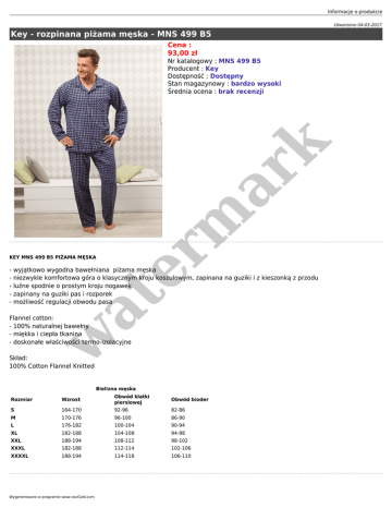 Informacje o produkcie Utworzono 04-03-2017 Key - rozpinana piżama męska - MNS 499 B5 Cena : 93,00 zł KEY MNS 499 B5 PIŻAMA MĘSKA er m ar k Nr katalogowy : MNS 499 B5 Producent : Key Dostępność : Dostępny Stan magazynowy : bardzo wysoki Średnia ocena : brak recenzji at - wyjątkowo wygodna bawełniana piżama męska - niezwykle komfortowa góra o klasycznym kroju koszulowym, zapinana na guziki i z kieszonką z przodu - luźne spodnie o prostym kroju nogawek - zapinany na guziki pas i rozporek - możliwość regulacji obwodu pasa w Flannel cotton: - 100% naturalnej bawełny - miękka i ciepła tkanina - doskonałe właściwości termo-izolacyjne Skład: 100% Cotton Flannel Knitted Bielizna męska Rozmiar Wzrost Obwód klatki piersiowej Obwód bioder S 164-170 92-96 82-86 M 170-176 96-100 86-90 L 176-182 100-104 90-94 XL 182-188 104-108 94-98 XXL 188-194 108-112 98-102 XXXL 182-188 112-114 102-106 XXXXL 188-194 114-118 106-110 Wygenerowano w programie www.oscGold.com Dostępne opcje Key - rozpinana piżama męska - MNS 499 B5 w at er m ar k » rozmiar: M. » kolor: granat.