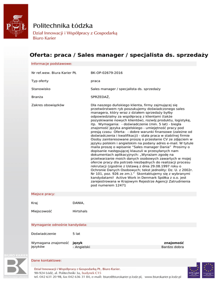 Oferta: praca / Sales manager / specjalista ds. sprzedaży Informacje podstawowe: Nr ref.wew. Biura Karier PŁ BK-OP-02679-2016 Typ oferty praca Stanowisko Sales manager / specjalista ds. sprzedaży Branża SPRZEDAŻ, Zakres obowiązków Dla naszego duńskiego klienta, firmy zajmującej się przetwórstwem ryb poszukujemy doświadczonego sales managera, który wraz z działem sprzedaży byłby odpowiedzialny za współpracę z klientami (także pozyskiwanie nowych klientów), rozwój produktu, logistykę, itp. Wymagania: - doświadczenie (min. 5 lat) - biegła znajomość języka angielskiego - umiejętność pracy pod presją czasu Oferta: - dobre warunki finansowe (zależne od doświadczenia i kwalifikacji) - stała praca w stabilnej firmie Osoby zainteresowane proszę o przesłanie CV ze zdjęciem w języku polskim i angielskim na podany adres e-mail. W tytule maila proszę o wpisanie “Sales manager Dania” Prosimy o dopisanie następującej klauzuli w przesyłanych nam dokumentach aplikacyjnych: „Wyrażam zgodę na przetwarzanie moich danych osobowych zawartych w mojej ofercie pracy dla potrzeb niezbędnych do realizacji procesu rekrutacji (zgodnie z Ustawą z dnia 29.08.1997 roku o Ochronie Danych Osobowych; tekst jednolity: Dz. U. z 2002r. Nr 101, poz. 926 ze zm.).” Skontaktujemy się z wybranymi kandydatami! Active Work in Denmark Spółka z o.o. jest zarejestrowana w Krajowym Rejestrze Agencji Zatrudnienia pod numerem 12471 Miejsce pracy: Kraj DANIA, Miejscowość Hirtshals Wymaganie odnośnie kandydata: Doświadczenie 5 lat Wymagana znajomość języków język - Angielski Dane kontaktowe: znajomość Bardzo dobra Nazwa firmy/Pracodawcy Osoba kontaktowa Telefon Email Active Work in Denmark Sp. z o.o. Anna Nowak 692134377 [email protected] Sposób aplikacji: Osoby zainteresowane proszę o przesłanie CV ze zdjęciem w języku polskim i angielskim na podany adres e-mail. W tytule maila proszę o wpisanie “Sales manager Dania” Data umieszczenia: Oferta ważna od 21-12-2016 do 31-12-2017 Politechnika Łódzka, jest wpisana pod numerem 2414 do rejestru podmiotów prowadzących agencje zatrudnienia.