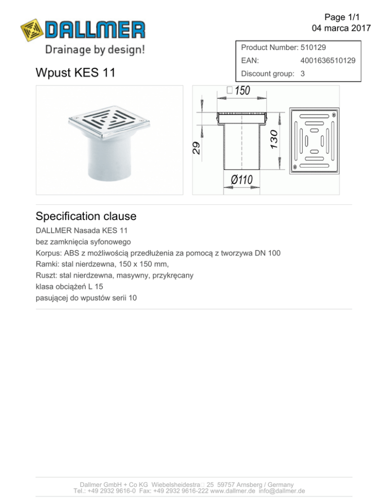 Page 1/1 04 marca 2017 Product Number: 510129 EAN: Wpust KES 11 4001636510129 Discount group: 3 Specification clause DALLMER Nasada KES 11 bez zamknięcia syfonowego Korpus: ABS z możliwością przedłużenia za pomocą z tworzywa DN 100 Ramki: stal nierdzewna, 150 x 150 mm, Ruszt: stal nierdzewna, masywny, przykręcany klasa obciążeń L 15 pasującej do wpustów serii 10 Dallmer GmbH + Co KG Wiebelsheidestra� 25 59757 Arnsberg / Germany Tel.: +49 2932 9616-0 Fax: +49 2932 9616-222 www.dallmer.de [email protected]