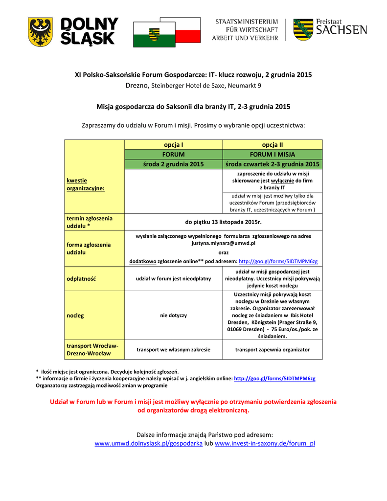 XI Polsko-Saksońskie Forum Gospodarcze: IT- klucz rozwoju, 2 grudnia 2015 Drezno, Steinberger Hotel de Saxe, Neumarkt 9 Misja gospodarcza do Saksonii dla branży IT, 2-3 grudnia 2015 Zapraszamy do udziału w Forum i misji. Prosimy o wybranie opcji uczestnictwa: opcja I FORUM środa 2 grudnia 2015 opcja II FORUM I MISJA środa czwartek 2-3 grudnia 2015 zaproszenie do udziału w misji skierowane jest wyłącznie do firm z branży IT udział w misji jest możliwy tylko dla uczestników Forum (przedsiębiorców branży IT, uczestniczących w Forum ) kwestie organizacyjne: termin zgłoszenia udziału * forma zgłoszenia udziału do piątku 13 listopada 2015r. wysłanie załączonego wypełnionego formularza zgłoszeniowego na adres [email protected] oraz dodatkowo zgłoszenie online** pod adresem: http://goo.gl/forms/5IDTMPM6zg odpłatność nocleg transport WrocławDrezno-Wrocław udział w forum jest nieodpłatny udział w misji gospodarczej jest nieodpłatny. Uczestnicy misji pokrywają jedynie koszt noclegu nie dotyczy Uczestnicy misji pokrywają koszt noclegu w Dreźnie we własnym zakresie. Organizator zarezerwował nocleg ze śniadaniem w Ibis Hotel Dresden, Königstein (Prager Straße 9, 01069 Dresden) - 75 Euro/os./pok. ze śniadaniem. transport we własnym zakresie transport zapewnia organizator * ilość miejsc jest ograniczona. Decyduje kolejność zgłoszeń. ** informacje o firmie i życzenia kooperacyjne należy wpisać w j. angielskim online: http://goo.gl/forms/5IDTMPM6zg Organzatorzy zastrzegają możliwość zmian w programie Udział w Forum lub w Forum i misji jest możliwy wyłącznie po otrzymaniu potwierdzenia zgłoszenia od organizatorów drogą elektroniczną. Dalsze informacje znajdą Państwo pod adresem: www.umwd.dolnyslask.pl/gospodarka lub www.invest-in-saxony.de/forum_pl FORMULARZ ZGŁOSZENIOWY XI Polsko-Saksońskie Forum Gospodarcze Misja gospodarcza do Drezna dla branży IT tak, zgłaszam chęć udziału w forum tak, zgłaszam chęć udziału w forum i misji tak, proszę o wiążącą rezerwację pokoju w hotelu Ibis w związku z moim udziałem w misji gospodarczej, pokryję koszty noclegu w wysokości 75 Euro/os/pok. Imię i nazwisko: Funkcja: Firma: Adres: tel. / faks: e-mail: strona internetowa data: podpis: Organizatorzy zastrzegają sobie prawo do filmowania i fotografowania uczestników spotkania oraz publikacji materiału. Przesłane zgłoszenie jest automatycznym wyrażeniem przez uczestnika zgody na powyższe działania. Osoby do kontaktu: Justyna Młynarz, Wydział Gospodarki, Urząd Marszałkowski Województwa Dolnośląskiego, tel.: +48 71 776 96 96, e-mail: [email protected], www.umwd.dolnyslask.pl/gospodarka Anna Sikorska, Przedstawiciel WFS w Polsce, Biuro Saksońskiej Agencji Wspierania Gospodarki, tel.: +48 71 372 46 31, fax: +48 71 313 11 74, e-mail: [email protected], www.invest-in-saxony.de/pl