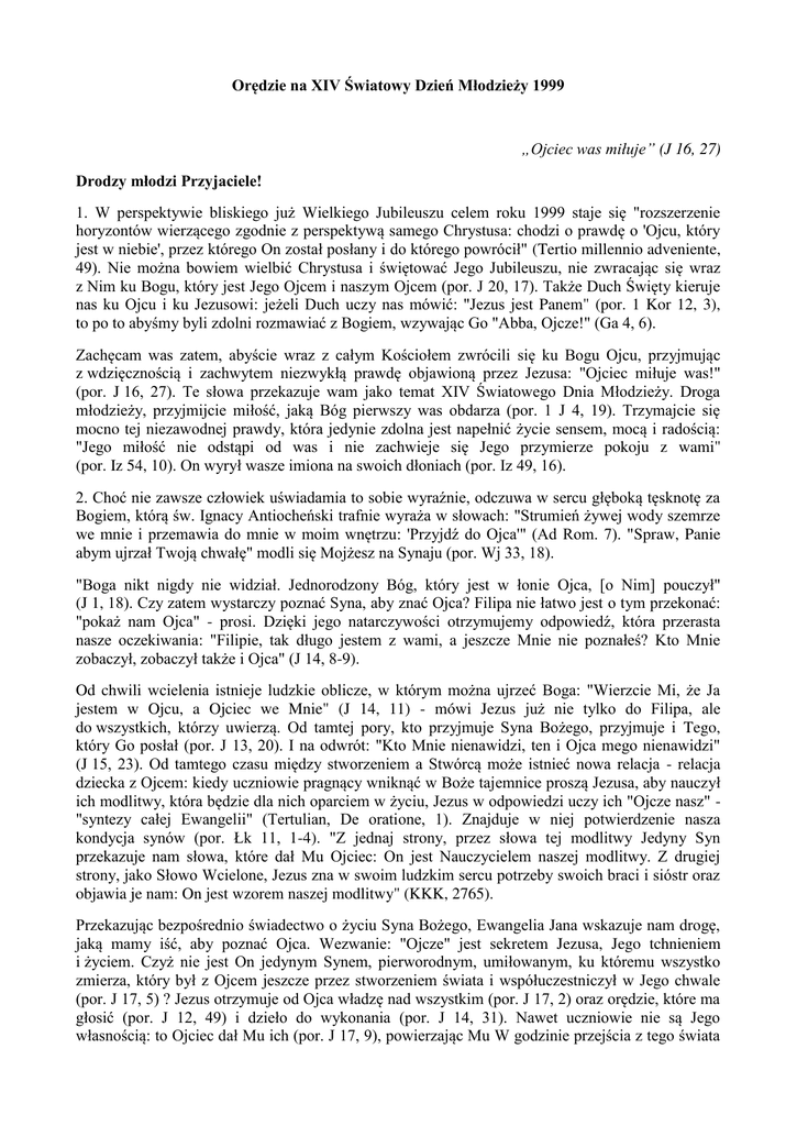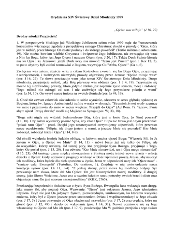 Orędzie na XIV Światowy Dzień Młodzieży 1999 „Ojciec was miłuje” (J 16, 27) Drodzy młodzi Przyjaciele! 1. W perspektywie bliskiego już Wielkiego Jubileuszu celem roku 1999 staje się "rozszerzenie horyzontów wierzącego zgodnie z perspektywą samego ChrystusaŚ chodzi o prawdę o 'Ojcu, który jest w niebie', przez którego On został posłany i do którego powrócił" (Tertio millennio adveniente, 49). Nie można bowiem wielbić Chrystusa i więtować Jego Jubileuszu, nie zwracając się wraz z Nim ku Bogu, który jest Jego Ojcem i naszym Ojcem (por. J 20, 17). Także Źuch więty kieruje nas ku Ojcu i ku JezusowiŚ jeżeli Źuch uczy nas mówićŚ "Jezus jest Panem" (por. 1 Kor 12, 3), to po to aby my byli zdolni rozmawiać z Bogiem, wzywając Go "Abba, Ojcze!" (Ga 4, 6). Zachęcam was zatem, aby cie wraz z całym Ko ciołem zwrócili się ku Bogu Ojcu, przyjmując z wdzięczno cią i zachwytem niezwykłą prawdę objawioną przez JezusaŚ "Ojciec miłuje was!" (por. J 16, 27). Te słowa przekazuje wam jako temat XIV wiatowego Źnia Młodzieży. Źroga młodzieży, przyjmijcie miło ć, jaką Bóg pierwszy was obdarza (por. 1 J 4, 19). Trzymajcie się mocno tej niezawodnej prawdy, która jedynie zdolna jest napełnić życie sensem, mocą i rado ciąŚ "Jego miło ć nie odstąpi od was i nie zachwieje się Jego przymierze pokoju z wami" (por. Iz 54, 10). On wyrył wasze imiona na swoich dłoniach (por. Iz 49, 16). 2. Choć nie zawsze człowiek u wiadamia to sobie wyra nie, odczuwa w sercu głęboką tęsknotę za Bogiem, którą w. Ignacy Antiocheński trafnie wyraża w słowachŚ "Strumień żywej wody szemrze we mnie i przemawia do mnie w moim wnętrzuŚ 'Przyjd do Ojca'" (Ad Rom. 7). "Spraw, Panie abym ujrzał Twoją chwałę" modli się Mojżesz na Synaju (por. Wj 33, 18). "Boga nikt nigdy nie widział. Jednorodzony Bóg, który jest w łonie Ojca, [o Nim] pouczył" (J 1, 18). Czy zatem wystarczy poznać Syna, aby znać Ojca? Filipa nie łatwo jest o tym przekonaćŚ "pokaż nam Ojca" - prosi. Źzięki jego natarczywo ci otrzymujemy odpowied , która przerasta nasze oczekiwaniaŚ "Filipie, tak długo jestem z wami, a jeszcze Mnie nie poznałe ? Kto Mnie zobaczył, zobaczył także i Ojca" (J 14, 8-9). Od chwili wcielenia istnieje ludzkie oblicze, w którym można ujrzeć BogaŚ "Wierzcie Mi, że Ja jestem w Ojcu, a Ojciec we Mnie" (J 14, 11) - mówi Jezus już nie tylko do Filipa, ale do wszystkich, którzy uwierzą. Od tamtej pory, kto przyjmuje Syna Bożego, przyjmuje i Tego, który Go posłał (por. J 13, 20). I na odwrótŚ "Kto Mnie nienawidzi, ten i Ojca mego nienawidzi" (J 15, 23). Od tamtego czasu między stworzeniem a Stwórcą może istnieć nowa relacja - relacja dziecka z OjcemŚ kiedy uczniowie pragnący wniknąć w Boże tajemnice proszą Jezusa, aby nauczył ich modlitwy, która będzie dla nich oparciem w życiu, Jezus w odpowiedzi uczy ich "Ojcze nasz" "syntezy całej źwangelii" (Tertulian, Źe oratione, 1). Znajduje w niej potwierdzenie nasza kondycja synów (por. Łk 11, 1-4). "Z jednaj strony, przez słowa tej modlitwy Jedyny Syn przekazuje nam słowa, które dał Mu OjciecŚ On jest Nauczycielem naszej modlitwy. Z drugiej strony, jako Słowo Wcielone, Jezus zna w swoim ludzkim sercu potrzeby swoich braci i sióstr oraz objawia je nam: On jest wzorem naszej modlitwy" (KKK, 2765). Przekazując bezpo rednio wiadectwo o życiu Syna Bożego, źwangelia Jana wskazuje nam drogę, jaką mamy i ć, aby poznać Ojca. WezwanieŚ "Ojcze" jest sekretem Jezusa, Jego tchnieniem i życiem. Czyż nie jest On jedynym Synem, pierworodnym, umiłowanym, ku któremu wszystko zmierza, który był z Ojcem jeszcze przez stworzeniem wiata i współuczestniczył w Jego chwale (por. J 17, 5) ? Jezus otrzymuje od Ojca władzę nad wszystkim (por. J 17, 2) oraz orędzie, które ma głosić (por. J 12, 49) i dzieło do wykonania (por. J 14, 31). Nawet uczniowie nie są Jego własno ciąŚ to Ojciec dał Mu ich (por. J 17, 9), powierzając Mu W godzinie przej cia z tego wiata do Ojca "modlitwa arcykapłańska" odsłania wnętrze SynaŚ "Ojcze, otocz Mnie u siebie tą chwałą, którą miałem u Ciebie pierwej, zanim wiat powstał" (J 17, 5). Jako Najwyższy Kapłan i Wieczny Kapłan Chrystus staje na czele niezmierzonego orszaku odkupionych. Jako Pierworodny po ród niezliczonych braci, sprowadza na powrót do jednej owczarni rozproszone owce, aby nastała "jedna owczarnia i jeden pasterz" (por. J 10, 16). Źzięki Jego dziełu wię miło ci, jaka istnieje w łonie Trójcy więtej, zostaje przeniesiona na relację Ojca z odkupioną ludzko ciąŚ "Ojciec miłuje was!" A czyż można by pojąć tę tajemnicę miło ci bez działania Źucha, którego Ojciec wylał na uczniów dzięki modlitwie Jezusa (por. J 14, 16)? Wcielenie Przedwiecznego Słowa w czasie oraz narodziny do wieczno ci tych, którzy zostają w Nie wszczepieni przez chrzest, byłyby nie do pomy lenia bez ożywiającego działania Źucha więtego. 3. "Tak bowiem Bóg umiłował wiat, że Syna swego Jednorodzonego dał, aby każdy, kto w Niego wierzy, nie zginął, ale miał życie wieczne" (J 3, 16). Bóg kocha wiat! I chociaż wiat jest zdolny Boga odrzucić, będzie kochany przez Niego aż do końca. "Ojciec miłuje was" od zawsze i na zawszeŚ oto prawda najbardziej zdumiewająca, "proste, a jakże przejmujące orędzie, które Ko ciół jest winien człowiekowi" (Christifideles laici, 34). Gdyby Chrystus pozostawił nam tylko to jedno słowo, ono samo by wystarczyło. "Popatrzcie, jaką miło cią obdarzył nas OjciecŚ zostali my nazwani dziećmi BożymiŚ i rzeczywi cie nimi jeste my" (por. 1 J 3, 1). Nie jeste my sierotami, miło ć jest możliwa. Bo wiecie przecież, że człowiek nie potrafi kochać, je li nie jest kochany. Jak jednak mamy głosić tę dobrą nowinę ? Jezus wskazuje drogęŚ mamy wsłuchiwać się w słowa Ojca, aby On nas nauczał (por. J 6, 45), i zachowywać Jego przykazania (por. J 14,
