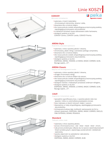 Linie KOSZY CONVOY Wzornictwo minimalistyczne •wykonany z trzech materiałów: chromowanych elementów, drewna i szkła, •drewniane dno w kolorze białym, •dno kosza pokryte zostało antypoślizgową przezroczystą powłoką zapobiegającą przesuwaniu się produktów, •w szklanych boczkach kosza zastosowano szkło hartowane, •dostępne systemy w tej linii: CONVOY Centro, CONVOY Lavido, CONVOY Premio. ARENA Style Prosta forma, nowoczesne wykończenie •wykonany z drutu wysokiej jakości i drewna, •chromowany, płaski reling o szerokości jednego centymetra, •drewniane dno w kolorze białym, •dno kosza pokryte zostało antypoślizgową przezroczystą powłoką zapobiegającą przesuwaniu się produktów, •dostępne systemy w tej linii: DISPENSA, SWING, TANDEM, LE MANS, MAGIC CORNER, SLIM, Wyciągi wąskie „15”. ARENA Classic Klasyczny wzór dla designerskich trendów •wykonany z drutu wysokiej jakości i drewna, •okrągłe chromowane relingi, •drewniane dno w kolorze białym lub szarym, •dno kosza pokryte zostało antypoślizgową przezroczystą powłoką zapobiegającą przesuwaniu się produktów, •dostępne również z malowanym proszkowo srebrnym relingiem, •dostępne systemy w tej linii: DISPENSA, SWING, TANDEM, LE MANS, MAGIC CORNER, SLIM, Wyciągi wąskie „15”. Libell Oryginalność, funkcjonalność, wygoda •specjalnie wyprofilowany kosz, z wysokiej jakości stali, bez spawów i nitów co uniemożliwia powstawaniu korozji, •kosz malowany w dwóch kolorach: białym i szarym, •doposażony w matę antypoślizgową, zapobiegającą przesuwaniu się produktów, •innowacyjna budowa daje możliwość zastosowania tej linii w różnych systemach: DISPENSA, SWING, MAGIC CORNER, SNELLO, Półki EXTENDO, SESAM, PEGASUS. Standard Tradycyjne, solidne, trwałe •wykonany z drutu wysokiej jakości, •proces chromowania drutu : stal - nikiel - miedź - nikiel - chrom, •cały proces produkcyjny odbywa się na wysoce zautomatyzowanych liniach produkcyjnych, zapewniając powtarzalność i dokładność wykonania, •wysoka odporność na uszkodzenia i zabrudzenia, •dostępne systemy w tej linii: DISPENSA, SWING, MAGIC CORNER, SLIM.