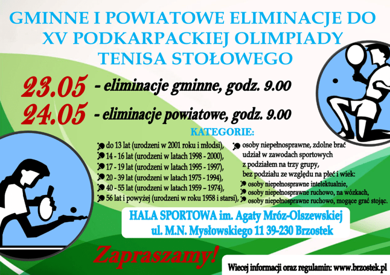 XV Podkarpacka Olimpiada Tenisa Stołowego eliminacje gminne, powiatowe Szanowni Państwo! Mamy zaszczyt zaprosić Państwa do udziału w eliminacjach gminnych do XV Podkarpackiej Olimpiady Tenisa Stołowego. Eliminacje gminne i powiatowe zostaną rozegrane na Hali sportowej im. Agaty Mróz - Olszewskiej w Brzostku, ul. M.N.M. Mysłowskiego 11. I. Cel: 1. Popularyzacja tenisa stołowego jako dyscypliny sportowej dostępnej dla wszystkich chętnych. 2. Promocja aktywnego stylu życia wśród wszystkich grup społecznych jako skutecznej formy profilaktyki zdrowotnej i przeciwdziałania patologiom społecznym. 3. Integracja osób niepełnosprawnych z całym środowiskiem sportowym. 4. Propagowanie i rozwijanie aktywności fizycznej wśród osób nieaktywnych zawodowo i społecznie oraz w starszym wieku. II. Uczestnicy: Uczestniczyć mogą wszyscy chętni (w tym osoby niepełnosprawne), za wyjątkiem zawodników, którzy w bieżącym bądź poprzednim sezonie rozgrywkowym rozegrali przynajmniej jeden mecz w rozgrywkach III lub wyższej ligi tenisa stołowego (nie dotyczy kategorii do lat 13 - urodzeni w 2001 roku i młodsi, a także osób powyżej 40 lat – urodzeni w 1973 roku i starsi). III. Organizatorzy: 1. Na szczeblu podstawowym – stowarzyszenia sportowe, placówki i instytucje oświatowe, kulturalne, straż pożarna i inne osoby prawne lub fizyczne. 2. Na szczeblu miejskim, gminnym, powiatowym – urzędy miast, gmin i powiatów oraz wolontariusze stowarzyszeń sportowych. 3. Na szczeblu wojewódzkim – Podkarpacki Okręgowy Związek Tenisa Stołowego, Urząd Marszałkowski Województwa Podkarpackiego i Urząd Miasta Łańcuta. IV. Termin i miejsce: 1. Eliminacje gminne zostaną rozegrane 23 maja(piątek) 2014 roku. Program zawodów: • godz. 900 – 930 przyjmowanie zgłoszeń i weryfikacja zawodników • godz. 930 – 950 rozstawianie zawodników do pierwszych gier • godz. 950 – 1000 uroczyste otwarcie turnieju • godz. 1000 rozpoczęcie gier • ok. godz. 1400 uroczyste zakończenie turnieju. 2. Eliminacje powiatowe zostaną rozegrane 24 maja(sobota) 2014 roku. Program zawodów: • godz. 900 – 930 przyjmowanie zgłoszeń i weryfikacja zawodników • godz. 930 – 950 rozstawianie zawodników do pierwszych gier • godz. 950 – 1000 uroczyste otwarcie turnieju • godz. 1000 rozpoczęcie gier • ok. godz. 1600 uroczyste zakończenie turnieju . 3. Finał wojewódzki - 15 czerwca 2014 roku (niedziela), godz. 9:00, hala MOSiR w Łańcucie, ul. Armii Krajowej 57. V. System współzawodnictwa: 1. Zawody przeprowadzone będą w grach indywidualnych wg przepisów Polskiego Związku Tenisa Stołowego - systemem pucharowym do dwóch przegranych pojedynków lub "każdy z każdym". Decyzję dotyczącą wyboru systemu podejmuje Organizator przed zawodami - w zależności od liczby uczestników. 2. Współzawodnictwo rozgrywane będzie w sześciu grupach wiekowych dla dziewcząt i chłopców oraz kobiet i mężczyzn: a) do 13 lat (urodzeni w 2001 roku i młodsi), b) 14 - 16 lat (urodzeni w latach 1998 - 2000), c) 17 - 19 lat (urodzeni w latach 1995 - 1997), d) 20 - 39 lat (urodzeni w latach 1975 - 1994), e) 40 - 55 lat (urodzeni w latach 1959 – 1974), f) 56 lat i powyżej (urodzeni w roku 1958 i starsi), g) osoby niepełnosprawne, zdolne brać udział w zawodach sportowych z podziałem na trzy grupy, bez podziału ze względu na płeć i wiek: - osoby niepełnosprawne intelektualnie, - osoby niepełnosprawne ruchowo, na wózkach, - osoby niepełnosprawne ruchowo, mogące grać stojąc. 3. Do eliminacji wyższego szczebla, aż do finału wojewódzkiego przechodzą zdobywcy I i II miejsca w poszczególnych kategoriach (nie dotyczy osób niepełnosprawnych). 4. Organizatorzy zastrzegają sobie możliwość połączenia poszczególnych kategorii wiekowych, w przypadku niewielkiej liczby zgłoszeń. VI. Nagrody: 1. Przewiduje się puchary oraz dyplomy dla zdobywców miejsc I – III na wszystkich kategoriach wiekowych. VII. Sprawy różne: 1. Koszty organizacji imprez pokrywają Organizatorzy zawodów poszczególnych szczebli, zaś koszty uczestnictwa pokrywają sami zawodnicy lub jednostki je delegujące. 2. Organizatorzy nie ubezpieczają uczestników Olimpiady, w związku z czym startują oni na własną odpowiedzialność. 3. We wszystkich sprawach związanych z organizacją Olimpiady należy się zwracać do: Podkarpackiego Okręgowego Związku Tenisa Stołowego ul. Pułaskiego 13a, 35-011 Rzeszów tel./fax: (17) 853 22 70 e-mail: [email protected] 4. Organizatorzy zastrzegają sobie ostateczną interpretację postanowień niniejszego regulaminu.