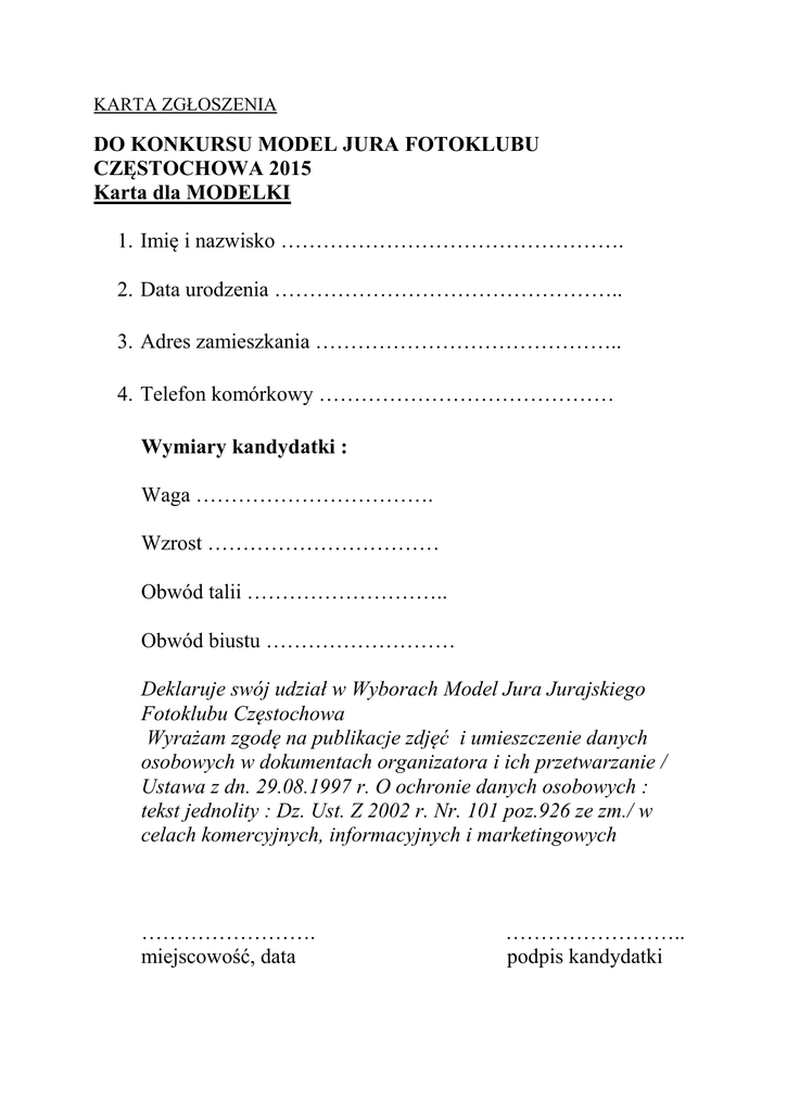 KARTA ZGŁOSZENIA DO KONKURSU MODEL JURA FOTOKLUBU CZĘSTOCHOWA 2015 Karta dla MODELKI 1. Imię i nazwisko …………………………………………. 2. Data urodzenia ………………………………………….. 3. Adres zamieszkania …………………………………….. 4. Telefon komórkowy …………………………………… Wymiary kandydatki : Waga ……………………………. Wzrost …………………………… Obwód talii ……………………….. Obwód biustu ……………………… Deklaruje swój udział w Wyborach Model Jura Jurajskiego Fotoklubu Częstochowa Wyrażam zgodę na publikacje zdjęć i umieszczenie danych osobowych w dokumentach organizatora i ich przetwarzanie / Ustawa z dn. 29.08.1997 r. O ochronie danych osobowych : tekst jednolity : Dz. Ust. Z 2002 r. Nr. 101 poz.926 ze zm./ w celach komercyjnych, informacyjnych i marketingowych ……………………. miejscowość, data …………………….. podpis kandydatki