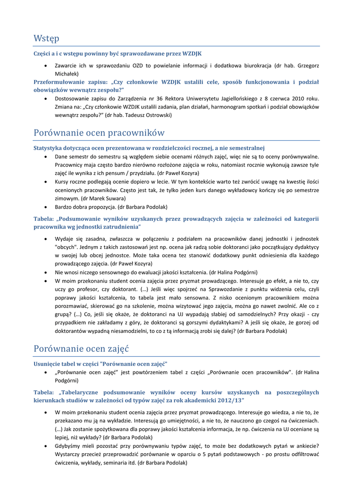 Wstęp Części a i c wstępu powinny być sprawozdawane przez WZDJK Zawarcie ich w sprawozdaniu OZD to powielanie informacji i dodatkowa biurokracja (dr hab. Grzegorz Michałek) Przeformułowanie zapisu: „Czy członkowie WZDJK ustalili cele, sposób funkcjonowania i podział obowiązków wewnątrz zespołu?” Dostosowanie zapisu do Zarządzenia nr 36 Rektora Uniwersytetu Jagiellońskiego z 8 czerwca 2010 roku. Zmiana na: „Czy członkowie WZDJK ustalili zadania, plan działań, harmonogram spotkań i podział obowiązków wewnątrz zespołu?” (dr hab. Tadeusz Ostrowski) Porownanie ocen pracownikow Statystyka dotycząca ocen prezentowana w rozdzielczości rocznej, a nie semestralnej Dane semestr do semestru są względem siebie ocenami różnych zajęć, więc nie są to oceny porównywalne. Pracownicy maja często bardzo nierówno rozłożone zajęcia w roku, natomiast rocznie wykonują zawsze tyle zajęć ile wynika z ich pensum / przydziału. (dr Paweł Kozyra) Kursy roczne podlegają ocenie dopiero w lecie. W tym kontekście warto też zwrócić uwagę na kwestię ilości ocenionych pracowników. Często jest tak, że tylko jeden kurs danego wykładowcy kończy się po semestrze zimowym. (dr Marek Suwara) Bardzo dobra propozycja. (dr Barbara Podolak) Tabela: „Podsumowanie wyników uzyskanych przez prowadzących zajęcia w zależności od kategorii pracownika wg jednostki zatrudnienia” Wydaje się zasadna, zwłaszcza w połączeniu z podziałem na pracowników danej jednostki i jednostek "obcych". Jednym z takich zastosowań jest np. ocena jak radzą sobie doktoranci jako początkujący dydaktycy w swojej lub obcej jednostce. Może taka ocena tez stanowić dodatkowy punkt odniesienia dla każdego prowadzącego zajęcia. (dr Paweł Kozyra) Nie wnosi niczego sensownego do ewaluacji jakości kształcenia. (dr Halina Podgórni) W moim przekonaniu student ocenia zajęcia przez pryzmat prowadzącego. Interesuje go efekt, a nie to, czy uczy go profesor, czy doktorant. (…) Jeśli więc spojrzeć na Sprawozdanie z punktu widzenia celu, czyli poprawy jakości kształcenia, to tabela jest mało sensowna. Z nisko ocenionym pracownikiem można porozmawiać, skierować go na szkolenie, można wizytować jego zajęcia, można go nawet zwolnić. Ale co z grupą? (…) Co, jeśli się okaże, że doktoranci na UJ wypadają słabiej od samodzielnych? Przy okazji - czy przypadkiem nie zakładamy z góry, że doktoranci są gorszymi dydaktykami? A jeśli się okaże, że gorzej od doktorantów wypadną niesamodzielni, to co z tą informacją zrobi się dalej? (dr Barbara Podolak) Porownanie ocen zajęc Usunięcie tabel w części "Porównanie ocen zajęć" „Porównanie ocen zajęć” jest powtórzeniem tabel z części „Porównanie ocen pracowników”. (dr Halina Podgórni) Tabela: „Tabelaryczne podsumowanie wyników oceny kursów uzyskanych na poszczególnych kierunkach studiów w zależności od typów zajęć za rok akademicki 2012/13” W moim przekonaniu student ocenia zajęcia przez pryzmat prowadzącego. Interesuje go wiedza, a nie to, że przekazano mu ją na wykładzie. Interesują go umiejętności, a nie to, że nauczono go czegoś na ćwiczeniach. (…) Jak zostanie spożytkowana dla poprawy jakości kształcenia informacja, że np. ćwiczenia na UJ oceniane są lepiej, niż wykłady? (dr Barbara Podolak) Gdybyśmy mieli pozostać przy porównywaniu typów zajęć, to może bez dodatkowych pytań w ankiecie? Wystarczy przecież przeprowadzić porównanie w oparciu o 5 pytań podstawowych - po prostu odfiltrować ćwiczenia, wykłady, seminaria itd. (dr Barbara Podolak) Tabela: „Tabelaryczne podsumowanie wyników oceny kursów na poszczególnych kierunkach studiów w zależności od charakteru zajęć (obligatoryjne/fakultatywne)” Pojęcie „zajęcia fakultatywne” jest nieostre. Na studiach drugiego stopnia wybiera się specjalizację –jak więc potraktować zajęcia związane ze specjalizacją, np. seminarium mgr? Czy wszystkie fakultatywne? Nazwa kursu albo symbol niekoniecznie wskazują, czy przedmiot ma charakter fakultatywny, czy nie. Nie da się tego zrobić automatycznie, a nie możecie Państwo oczekiwać od pełnomocników zastanawiania się oddzielnie nad każdym kursem, jeżeli w jednostce jest ich kilkadziesiąt. (dr hab. Bożena Kucała) Wypełnienie tej tabeli wymaga od nas dokładnej znajomości programu studiów i wiąże się z dodatkowym obciążeniem. (dr Halina Podgórni) Analiza komentarzy Ograniczenie analizy komentarzy do jednego pytania: „Jakie zagadnienia poruszane są w komentarzach najczęściej?” Odpowiedź na dwa pierwsze pytania wydaje się niemożliwa lub bardzo trudna, ponieważ poszczególne komentarze są zbudowane bardzo różnie. Mieszają się w nich różne aspekty oceny. Ścisła kategoryzacja w tym punkcie nie wnosi niczego do meritum sprawy. (dr Halina Podgórni) Pozostałe uwagi Publikowanie skróconej wersji sprawozdania OZD / raportu kierunkowego Dostęp do raportu i sprawozdania OZD jest bardzo ograniczony (wydziałowy zespół, dziekan, prorektor), zatem ogromna praca w dużej części się marnuje. Udostępnienie sprawozdania pracownikom umożliwi im skonfrontowanie swojej oceny z: średnia oceną jednostki, podjednostki, z zajęć danego typu, ze średnią dla danej kategorii pracowników, co stanowi o użyteczności oceny. Studenci powinni dostać informację zwrotną, aby widzieli, co z ich wypełniania wynika, stąd propozycja aktywnego ich uczestnictwa w tworzeniu tego skrótu (wzoru skrótu). W sprawozdaniach OZD / raportach nie ma danych osobowych, więc nie ma formalnego problemu z publikacją tych danych. (dr Paweł Kozyra) Dostęp do danych OZD dla koordynatorów przedmiotów: czy jest możliwy i jak to rozwiązać formalnie? Dane w połączeniu z raportem wydziałowym (jako punktem odniesienia) dla koordynatorów dopiero zaczynają być użyteczne: a) wiadomo jak radzą sobie poszczególni prowadzący w 