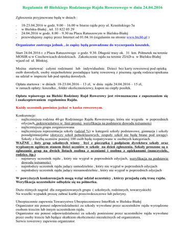 Regulamin 40 Bielskiego Rodzinnego Rajdu Rowerowego w dniu 24.04.2016 Zgłoszenia przyjmowane będą w dniach : - 18-23.04.2016 w godz. 9.00 – 16.00 w biurze rajdu przy ul. Krasińskiego 5a w Bielsku-Białej , tel. 33 822 05 29 24.04.2016 w godz. 8.00 – 9.30 na Placu Ratuszowym w Bielsku-Białej przewidujemy zapisy przez Internet od 01.04.16 (regulamin na stronie www.btcbb.pl ) Organizator zastrzega jednak , że zapisy będą prowadzone do wyczerpania koszulek. Start 24.04.2016 r. z Placu Ratuszowego o godz. 9.30. Długość trasy ok. 31 km. Półmetek na terenie MOSIR-u w Czechowicach-dziedzicach. Zakończenie rajdu na terenie ZIAD-u w Bielsku-Białej wjazd od ul. Bliskiej. Można startować całymi rodzinami lub indywidualnie. Dzieci bez karty rowerowej pod opieką osób dorosłych, osoby niepełnoletnie posiadające kartę rowerową z pisemną zgodą rodzica/opiekuna na udział w imprezie lub pod opieką dorosłych. Opłata startowa : w dniach 18-23.04.2016 – 13 zł, w dniu rajdu 24.04.2016 – 15 zł, w ramach opłaty: koszulka , folder okolicznościowy, kupon na ciepły posiłek. Opłata wpisowego na Bielski Rodzinny Rajd Rowerowy jest równoznaczna z zapoznaniem się i zaakceptowaniem regulaminu Rajdu. Każdy uczestnik powinien jechać w kasku rowerowym. Konkurencje: - najliczniejsza rodzina 40-go Rodzinnego Rajdu Rowerowego, która nie wygrała w poprzednich edycjach, pokrewieństwo w linii prostej weryfikacja na podstawie dowodu tożsamości - najliczniejsza grupa zorganizowana - najliczniejsza reprezentacja szkoły (udział %) w kategorii szkoły podstawowe, gimnazja i szkoły ponadgimnazjalne (dotyczy szkół pełnoklasowych, zespoły szkół nie będą brane pod uwagę). Szkoły z liczbą uczniów poniżej 100 osób będą rozpatrywane w osobnych kategoriach. WAŻNE : listy grup szkolnych winny być z pieczątką i podpisem dyrektora szkoły oraz wypisanym ogólnym stanem ilości uczniów w szkole na dzień zgłoszenia. Szkoły proszone są o zgłaszanie grup na dwóch listach osobna z uczniami i osobna z opiekunami (nauczyciele, rodzice, itp.) - najstarszy uczestnik rajdu , który nie wygrał w poprzednich edycjach, weryfikacja na podstawie dowodu tożsamości - najmłodszy uczestnik rajdu jadący samodzielnie , który nie wygrał w poprzednich edycjach - najmłodszy uczestnik rajdu jadący niesamodzielnie , który nie wygrał w poprzednich edycjach W powyższych konkurencjach mogą wziąć udział uczestnicy , którzy przejadą całą trasę rajdu. Weryfikacja uczestników odbędzie się na półmetku. Dużo różnych nagród dla zorganizowanych grupa ( szkolnych, rodzinnych, towarzyskich) Na wszelki wypadek proszę zabrać kurtki przeciwdeszczowe lub peleryny. Ubezpieczenie zapewnia Towarzystwo Ubezpieczeniowe InterRisk w Bielsku-Białej Organizator nie ponosi odpowiedzialności za szkody wywołane przez uczestników rajdu wyrządzone osobom trzecim lub innym uczestnikom rajdu. Organizator nie ponosi odpowiedzialności za szkody poniesione przez uczestników rajdu wywołane przez osoby trzecie lub będące skutkiem okoliczności niezależnych od organizatora. Serwis rowerowy zapewnia organizator. Zabroniony jest udział w wydarzeniu osobom pod wpływem alkoholu i innych środków odurzających. Użycie tego rodzaju środków zagraża zdrowiu i życiu osobie przyjmującej substancje oraz negatywnie wpływa na bezpieczeństwo poruszającego się peletonu. Osoby nie mogące kontynuować jazdy w tempie rajdu będą zobowiązane do poruszania się w ruchu ulicznym na własną odpowiedzialność zgodnie z zasadami prawa o ruchu drogowym lub do skorzystania z transportu busem Organizatora. Każdy uczestnik, poprzez opłatę startowego , wyraża zgodę na nieodpłatne publikowanie swojego wizerunku w materiałach medialnych (internet, radio, telewizja, prasa, publikacje drukowane) oraz w materiałach marketingowych Organizatora służących promocji Rajdu i w materiałach marketingowych innych instytucji powiązanych z organizacją tego wydarzenia. Podczas rajdu należy bezwzględnie przestrzegać przepisów o ruchu drogowym. Nie jeździć po chodnikach – za wyjątkiem wyznaczonych miejsc. Nie ścigać się. Zachować ostrożność. Poruszamy się prawą stroną jezdni. Kolumna Rajdu składa się z : samochodu Policji - peletonu rowerzystów (jednakowe koszulki) w środku peletonu organizatorzy BTC w kamizelkach odblaskowych - karetki pogotowia i Grupy PCK – 2 samochodów dostawczych na rowery i osoby, które nie mogą kontynuować jazdy– samochodu serwisu rowerowego . Przed rajdem należy sprawdzić stan techniczny roweru. Osobą odpowiedzialną za całość rajdu , trasę oraz rozstawienie służb jest Jolanta Koźmin – Beskidzkie Towarzystwo Cyklistów w Bielsku – Białej , tel. 534211 271, Beata Załubska tel.793 721 920 Uczestnicy stosują się bezwzględnie do poleceń POLICJI oraz zabezpieczającej trasę ekipy porządkowej na całej trasie rajdu. Wszyscy Uczestnicy wydarzenia pt "40 Bielski Rodzinny Rajd Rowerowy" mają obowiązek zapoznania się z treścią niniejszego Regulaminu oraz stosowania się do zasad w nim zawartych. Sprawy nie ujęte w regulaminie należą do organizatorów.