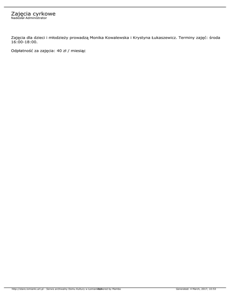 Zajęcia cyrkowe Nadesłał Administrator Zajęcia dla dzieci i młodzieży prowadzą Monika Kowalewska i Krystyna Łukaszewicz. Terminy zajęć: środa 16:00-18:00. Odpłatność za zajęcia: 40 zł / miesiąc http://stare.lomianki.art.pl - Serwis archiwalny Domu Kultury w Łomiankach Powered by Mambo Generated: 4 March, 2017, 10:53