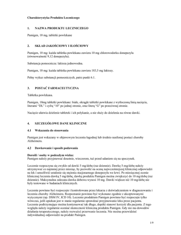 Charakterystyka Produktu Leczniczego 1. NAZWA PRODUKTU LECZNICZEGO Pamigen, 10 mg, tabletki powlekane 2. SKŁAD JAKOŚCIOWY I ILOŚCIOWY Pamigen, 10 mg: kaŜda tabletka powlekana zawiera 10 mg chlorowodorku donepezylu (równowaŜność 9,12 donepezylu). Substancja pomocnicza: laktoza jednowodna. Pamigen, 10 mg: kaŜda tabletka powlekana zawiera 183,5 mg laktozy. Pełny wykaz substancji pomocniczych, patrz punkt 6.1. 3. POSTAĆ FARMACEUTYCZNA Tabletka powlekana. Pamigen, 10mg tabletki powlekane: białe, okrągłe tabletki powlekane z wytłoczoną linią nacięcia, literami “DL” i cyfrą “10” po jednej stronie, oraz literą “G” po przeciwnej stronie. Nacięcie ułatwia dzielenie tabletek i ich połykanie, a nie słuŜy do dzielenia na równe dawki. 4. SZCZEGÓŁOWE DANE KLINICZNE 4.1 Wskazania do stosowania Pamigen jest wskazany w objawowym leczeniu łagodnej lub średnio nasilonej postaci choroby Alzheimera. 4.2 Dawkowanie i sposób podawania Dorośli / osoby w podeszłym wieku: Pamigen naleŜy przyjmować doustnie, wieczorem, tuŜ przed udaniem się na spoczynek. Leczenie rozpoczyna się zwykle od dawki 5 mg/dobę (raz dziennie). Dawkę 5-mg/dobę naleŜy utrzymywać co najmniej przez miesiąc, by pozwolić na ocenę najwcześniejszej klinicznej odpowiedzi na lek i umoŜliwić ustalenie się stęŜenia stacjonarnego donepezylu we krwi. Po miesięcznej ocenie klinicznej leczenia dawką 5 mg/dobę, dawkę produktu Pamigen moŜna zwiększyć do 10 mg/dobę (raz dziennie). Maksymalna zalecana dawka dobowa wynosi 10 mg. Dawki większe niŜ 10 mg/dobę nie były testowane w badaniach klinicznych. Leczenie powinno być rozpoczęte i kontrolowane przez lekarza z doświadczeniem w diagnozowaniu i leczeniu choroby Alzheimera. Rozpoznanie powinno być wykonane zgodnie z akceptowanymi wytycznymi (np. DSM IV, ICD 10). Leczenie produktem Pamigen powinno być rozpoczęte tylko wówczas, jeśli opiekun jest w stanie regularnie sprawdzać przyjmowanie leku przez pacjenta. Leczenie podtrzymujące moŜna kontynuować tak długo, dopóki stanowi korzyść dla pacjenta. Z tego względu naleŜy regularnie oceniać skuteczność kliniczną produktu Pamigen. Gdy nie ma dowodów działania terapeutycznego, naleŜy rozwaŜyć przerwanie leczenia. Nie moŜna przewidzieć indywidualnej odpowiedzi na produkt Pamigen. 1/9 Po przerwaniu leczenia obserwuje się stopniowe zanikanie korzystnych efektów działania produktu Pamigen. Zaburzenia czynności wątroby / nerek: U pacjentów z upośledzeniem czynności nerek moŜna stosować podobny schemat dawkowania, poniewaŜ wydalanie produktu Pamigen nie zaleŜy od sprawności nerek. Ze względu na moŜliwość zwiększonego naraŜenia (patrz punkt 5.2) u pacjentów z łagodnym lub średnio nasilonym upośledzeniem czynności wątroby zaleca się zwiększanie dawki w zaleŜności od indywidualnej tolerancji pacjenta. Brak danych odnośnie stosowania leku u chorych z cięŜką niewydolnością wątroby. Dzieci: Pamigen jest zalecany do stosowania wyłącznie u osób dorosłych . 4.3 Przeciwwskazania NadwraŜliwość na chlorowodorek donepezylu, pochodne piperydyny lub którykolwiek ze składników leku. 4.4 Specjalne ostrzeŜenia i środki ostroŜności dotyczące stosowania Nie badano stosowania produktu Pamigen u pacjentów z zaawansowaną chorobą Alzheimera, innymi rodzajami demencji, innymi rodzajami zaburzeń pamięci (np. zaburzeniami poznawczymi związanymi z wiekiem). Znieczulenie: Donepezyl, jako inhibitor cholinesterazy moŜe podczas znieczulenia nasilać zwiotczenie mięśni wywołane sukcynylocholiną lub jej pochodnymi. Choroby układu sercowo-naczyniowego: Ze względu na swoje działanie farmakologiczne inhibitory cholinesterazy mogą wywierać wpływ wagotoniczny na serce (np. wywoływać bradykardię). Ten wpływ moŜe być szczególnie istotny dla pacjentów z zespołem chorej zatoki lub innymi nadkomorowymi zaburzeniami przewodzenia, takimi jak blok zatokowo-przedsionkowy lub przedsionkowo-komorowy. Istnieją doniesienia o omdleniach i drgawkach. U takich pacjentów naleŜy brać pod uwagę moŜliwość bloku sercowego lub wydłuŜenia czasu pobudzeń zatokowych. Dolegliwości Ŝołądkowo-jelitowe: Pacjenci z grup podwyŜszonego ryzyka rozwoju choroby wrzodowej, tzn. osoby z chorobą wrzodową w wywiadzie lub leczone obecnie niesteroidowymi lekami przeciwzapalnymi (NLPZ), powinny być monitorowane pod kątem ewentualnych objawów. Jednak badania kliniczne donepezylu nie wykazały wzrostu częstości w porównaniu do placebo wrzodów trawiennych ani krwawień z przewodu pokarmowego. Dolegliwości układu moczowo-płciowego: Jakkolwiek nie obserwowano tego w badaniach klinicznych donepezylu, cholinomimetyki mogą hamować odpływ moczu z pęcherza. 2/9 Dolegliwości neurologiczne: Drgawki: przypuszcza się, Ŝe cholinomimetyki mają pewien potencjał do wywoływania uogólnionych drgawek, jednak aktywność drgawkowa moŜe być teŜ przejawem choroby Alzheimera. Cholinomimetyki mogą teŜ nasilać lub wywoływać objawy pozapiramidowe. Dolegliwości układu oddechowego: Ze względu na działanie cholinomimetyczne inhibitory cholinesterazy naleŜy przepisywać ostroŜnie pacjentom, u których rozpoznano astmę lub POChP (przewlekłą chorobę obturacyjną płuc). NaleŜy unikać podawania produktu Pamigen jednocześnie z innymi inhibitorami acetylocholinesterazy, agonistami lub antagonistami układu cholinergicznego. CięŜka niewydolność wątroby: Brak danych dotyczacych stosowania leku u chorych z cięŜką niewydolnością wątroby. Produkt leczniczy zawiera laktozę: Produkt zawiera laktozę, dlatego nie naleŜy go stosować u pacjentów z rzadko występującą dziedziczną nietolerancją galaktozy, niedoborem laktazy (typu Lapp) lub zespołem złego wchłaniania glukozy-galaktozy. Umieralność ogólna w badaniach klinicznych nad otępieniem naczyniopochodnym Przeprowadzono trzy badania kliniczne trwające 6 miesięcy. Badano w nich osoby 
