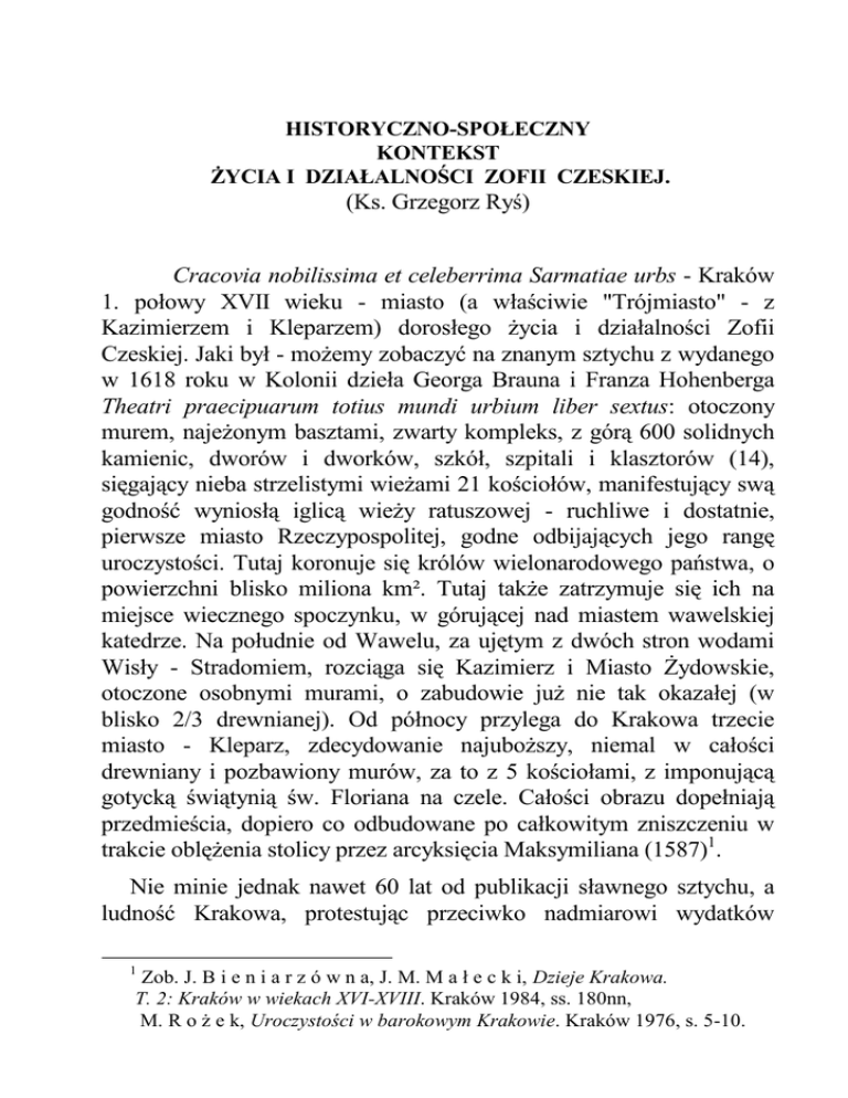 HISTORYCZNO-SPOŁECZNY KONTEKST ŻYCIA I DZIAŁALNOŚCI ZOFII CZESKIEJ. (Ks. Grzegorz Ryś) Cracovia nobilissima et celeberrima Sarmatiae urbs - Kraków 1. połowy XVII wieku - miasto (a właściwie "Trójmiasto" - z Kazimierzem i Kleparzem) dorosłego życia i działalności Zofii Czeskiej. Jaki był - możemy zobaczyć na znanym sztychu z wydanego w 1618 roku w Kolonii dzieła Georga Brauna i Franza Hohenberga Theatri praecipuarum totius mundi urbium liber sextus: otoczony murem, najeżonym basztami, zwarty kompleks, z górą 600 solidnych kamienic, dworów i dworków, szkół, szpitali i klasztorów (14), sięgający nieba strzelistymi wieżami 21 kościołów, manifestujący swą godność wyniosłą iglicą wieży ratuszowej - ruchliwe i dostatnie, pierwsze miasto Rzeczypospolitej, godne odbijających jego rangę uroczystości. Tutaj koronuje się królów wielonarodowego państwa, o powierzchni blisko miliona km². Tutaj także zatrzymuje się ich na miejsce wiecznego spoczynku, w górującej nad miastem wawelskiej katedrze. Na południe od Wawelu, za ujętym z dwóch stron wodami Wisły - Stradomiem, rozciąga się Kazimierz i Miasto Żydowskie, otoczone osobnymi murami, o zabudowie już nie tak okazałej (w blisko 2/3 drewnianej). Od północy przylega do Krakowa trzecie miasto - Kleparz, zdecydowanie najuboższy, niemal w całości drewniany i pozbawiony murów, za to z 5 kościołami, z imponującą gotycką świątynią św. Floriana na czele. Całości obrazu dopełniają przedmieścia, dopiero co odbudowane po całkowitym zniszczeniu w trakcie oblężenia stolicy przez arcyksięcia Maksymiliana (1587)1. Nie minie jednak nawet 60 lat od publikacji sławnego sztychu, a ludność Krakowa, protestując przeciwko nadmiarowi wydatków 1 Zob. J. B i e n i a r z ó w n a, J. M. M a ł e c k i, Dzieje Krakowa. T. 2: Kraków w wiekach XVI-XVIII. Kraków 1984, ss. 180nn, M. R o ż e k, Uroczystości w barokowym Krakowie. Kraków 1976, s. 5-10. związanych z koronacją Jana III i Marii Kazimiery, będzie z goryczą podpowiadać rajcom, "aby tak bramy tryumfalne, jako i fajerwerki skromne były (...) żebyśmy wielkiej nędze miasta tego nie zakrywali, ale ją, owszem, jawnie światu pokazali"2. "Najsławniejszego miasta Sarmacji" nie oszczędził więc charakterystyczny, nie tylko dla Rzeczypospolitej, ale także dla całego starego kontynentu XVII-wieczny wielopostaciowy „kryzys” (ekonomiczny, społeczny, polityczny, w pewnym sensie religijny). "Dla historyków zajmujących się dziejami nowożytnej Europy - pisze Niels Stensgaard - kryzys jest niekwestionowanym faktem; stał się on wyznacznikiem XVII wieku, w ten sam sposób jak renesans i reformacja charakteryzują wiek XVI, a rewolucja - wiek XVIII"3. Opisana wszakże tym samym słowem – „kryzys” powszechna choroba, nie wszędzie przecież miała ten sam przebieg, nie wszędzie te same przyczyny. Czasem, wręcz odwrotnie, podobne - jakby się mogło wydawać - fakty prowadziły do całkowicie przeciwnych następstw. Podczas, gdy na zachodzie Europy wojna XXX-letnia zaowocowała ostatecznie sekularyzacją polityki, wojny toczone przez Rzeczypospolitą w XVII stuleciu petryfikowały, zarówno jej obraz jako „przedmurza chrześcijaństwa”, jak i wyradzające się niejednokrotnie w nietolerancję i utożsamienie tego, co „polskie”, z tym, co „katolickie”. Na Zachodzie konsekwencją kryzysu było powstanie monarchii absolutnych, w Rzeczypospolitej - kompletny paraliż władzy królewskiej. Był więc to także w Polsce kryzys dojrzałości politycznej - "kryzys złotej wolności", którą jeszcze u kresu XVI wieku Skarga, nie bez słusznej dumy, definiował jako nie mieć tyrana, ani takiemu królowi służyć, który by nas, jako chciał, prawa nie patrząc, sądził, zabijał i majętności wasze brał, i córki i żony wasze wybierał, i czynił co mu się podoba, na Boga się i na sprawiedliwość nie oglądając, a która w następnym stuleciu przeobraziła się w wolność przebraną, diabelską: bez prawa, bez 2 3 Cyt. za: M. R o ż e k, Uroczystości..., s. 266. Zob. N. S t e e n s g a a r d, Kryzys XVII wieku; G. P a r k e r, Wojna trzydziestoletnia, (w:) Europa i świat w początkach epoki nowożytnej. Cz. 2: Ideologie, kryzysy, konflikty. Pod red. A. M ą c z a k a. Warszawa 1992, s. 18 - 44 i 98 - 135. urzędu żyć, na zwierzchność nie dbać4. Dla zobrazowania rozmiarów dramatu dość powiedzieć, że np. w okresie od roku 1688 do 1695 na sześć sejmów tylko jeden doszedł do końca, a sejm w roku 1688 zerwano jeszcze przed ukonstytuowaniem się izby poselskiej. Szlachecka demokracja obracała się w najszkodliwszą i najgorszą nade wszytki rządy5. Upadek Rzeczypospolitej katalizowało uwikłanie w dominujący nad polityką europejską, nie kończący się spór Francji z Habsburgami o pierwszeństwo w Europie. Ten spór angażował wszystkie liczące się europejskie siły polityczne, wokół niego kształtowały się nowe przymierza, ogniskowały zbrojne konflikty. Nie pozostał on bez wpływu, oczywiście, także na sytuację Rzeczypospolitej. ProHabsburska, przez większość stulecia, orientacja wiodła ją nieuchronnie do wojny z Turcją, po której nie bez słuszności spodziewał się Sobieski, że pochłonie ostatecznie resztki polskich możliwości ludzkich i finansowych. Wojna! – słowo, w równej mierze co „kryzys”, właściwe dla opisania XVII wieku, zarówno w Europie, jak i w Polsce. Wobec wojny XXX-letniej udało się wprawdzie Rzeczypospolitej zachować neutralność, a pod auspicjami króla Władysława IV w 1645 r. odbyło się w Toruniu sławne colloquium charitativum – „prowadzona w duchu miłości rozmowa” między duchownymi katolickimi a luteranami, kalwinistami i braćmi czeskimi, stanowiąca dokładne przeciwieństwo zbrojnych zmagań, toczonych w całej Europie, pod sztandarami manipulowanej przez politykę religii. Widziane jednak w całości XVII stulecie 