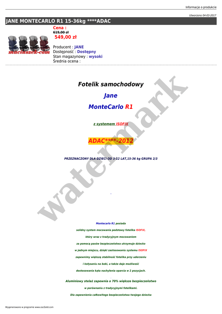 Informacje o produkcie Utworzono 04-03-2017 JANE MONTECARLO R1 15-36kg ****ADAC Cena : 619,00 zł 549,00 zł Producent : JANE Dostępność : Dostępny Stan magazynowy : wysoki Średnia ocena : er m ar k Fotelik samochodowy Jane MonteCarlo R1 z systemem ISOFIX ADAC****-2012 w at PRZEZNACZONY DLA DZIECI OD 3-12 LAT,15-36 kg GRUPA 2/3 Montecarlo R1 posiada solidny system mocowania podstawy fotelika ISOFIX, który wraz z tradycyjnym mocowaniem za pomocą pasów bezpieczeństwa utrzymuje dziecko w jednym miejscu, dzięki zastosowaniu systemu ISOFIX zapewnimy większą stabilność fotelika przy uderzeniu i kołysaniu na boki, a także daje możliwość dostosowania kąta nachylenia oparcia w 2 pozycjach. . Aluminiowy stelaż zapewnia o 70% większe bezpieczeństwo w porównaniu z tradycyjnymi fotelikami. Dla zapewnienia całkowitego bezpieczeństwa twojego dziecka Wygenerowano w programie www.oscGold.com i większej wygody szerokość boków zagłówka i wysokość jest regulowane. Posiada także regulowaną szerokość boczków oparcia Montecarlo jest fotelikiem samochodowym nadającym się dla różnych dzieci o różnej masie ciała, ponieważ zastosowany system różnych regulacji łatwo pomaga dostosowywać fotelik do każdego etapu rozwoju twojego dziecka. Ergonomiczny projekt, szereg otworów przepuszczających powietrze, aby zapobiegać poceniu twojego dziecka. er m ar k Możliwość regulacji szerokości zagłówka. Możliwość regulacji szerokości oparcia. Możliwość trzy stopniowej regulacji wysokości podłokietników Możliwość wypięcia oparcia i stosowania samego siedziska-(nie zalecane) Spełnia wymagania nowej normy ECE-R44/04 z czerwca 2005 Waga fotelika ok 7 kg Instrukcja obsługi w języku polskim Dostępne opcje JANE MONTECARLO R1 15-36kg ****ADAC w at » JANE: R1 62, R1 63, R1 65, R1 87.