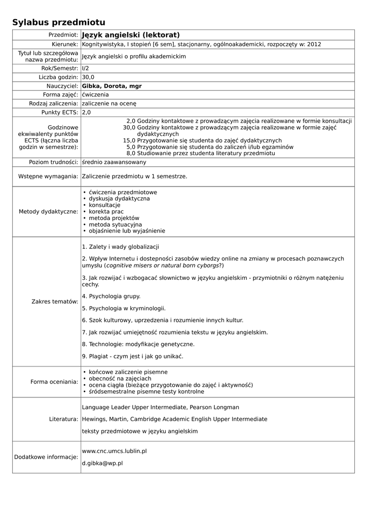 Sylabus przedmiotu Przedmiot: Język angielski (lektorat) Kierunek: Kognitywistyka, I stopień [6 sem], stacjonarny, ogólnoakademicki, rozpoczęty w: 2012 Tytuł lub szczegółowa Język angielski o profilu akademickim nazwa przedmiotu: Rok/Semestr: I/2 Liczba godzin: 30,0 Nauczyciel: Gibka, Dorota, mgr Forma zajęć: ćwiczenia Rodzaj zaliczenia: zaliczenie na ocenę Punkty ECTS: 2,0 2,0 Godziny kontaktowe z prowadzącym zajęcia realizowane w formie konsultacji 30,0 Godziny kontaktowe z prowadzącym zajęcia realizowane w formie zajęć dydaktycznych 15,0 Przygotowanie się studenta do zajęć dydaktycznych 5,0 Przygotowanie się studenta do zaliczeń i/lub egzaminów 8,0 Studiowanie przez studenta literatury przedmiotu Godzinowe ekwiwalenty punktów ECTS (łączna liczba godzin w semestrze): Poziom trudności: średnio zaawansowany Wstępne wymagania: Zaliczenie przedmiotu w 1 semestrze. • • • Metody dydaktyczne: • • • • ćwiczenia przedmiotowe dyskusja dydaktyczna konsultacje korekta prac metoda projektów metoda sytuacyjna objaśnienie lub wyjaśnienie 1. Zalety i wady globalizacji 2. Wpływ Internetu i dostepności zasobów wiedzy online na zmiany w procesach poznawczych umysłu (cognitive misers or natural born cyborgs?) 3. Jak rozwijać i wzbogacać słownictwo w języku angielskim - przymiotniki o różnym natężeniu cechy. Zakres tematów: 4. Psychologia grupy. 5. Psychologia w kryminologii. 6. Szok kulturowy, uprzedzenia i rozumienie innych kultur. 7. Jak rozwijać umiejętność rozumienia tekstu w języku angielskim. 8. Technologie: modyfikacje genetyczne. 9. Plagiat - czym jest i jak go unikać. • • Forma oceniania: • • końcowe zaliczenie pisemne obecność na zajęciach ocena ciągła (bieżące przygotowanie do zajęć i aktywność) śródsemestralne pisemne testy kontrolne Language Leader Upper Intermediate, Pearson Longman Literatura: Hewings, Martin, Cambridge Academic English Upper Intermediate teksty przedmiotowe w języku angielskim Dodatkowe informacje: www.cnc.umcs.lublin.pl [email protected]
