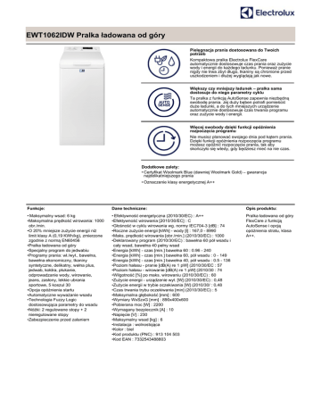 EWT1062IDW Pralka ładowana od góry Pielęgnacja prania dostosowana do Twoich potrzeb Kompaktowa pralka Electrolux FlexCare automatycznie dostosowuje czas prania oraz zużycie wody i energii do każdego ładunku. Ponieważ pranie nigdy nie trwa zbyt długo, tkaniny są chronione przed uszkodzeniem i dłużej wyglądają jak nowe. Większy czy mniejszy ładunek – pralka sama dostosuje do niego parametry cyklu Ta pralka z funkcją AutoSense zapewnia niezbędną swobodę prania. Jej duży bęben potrafi pomieścić duże ładunki, a do tych mniejszych urządzenie automatycznie dostosowuje czas trwania programu oraz zużycie wody i energii. Więcej swobody dzięki funkcji opóźnienia rozpoczęcia programu Nie musisz planować swojego dnia pod kątem prania. Dzięki funkcji opóźnienia rozpoczęcia programu możesz opóźnić rozpoczęcie prania, tak aby skończyło się wtedy, gdy będziesz mieć na nie czas. Dodatkowe zalety: • Certyfikat Woolmark Blue (dawniej Woolmark Gold) – gwarancja najdelikatniejszego prania • Oznaczenie klasy energetycznej A++ Funkcje: Dane techniczne: Opis produktu: • Maksymalny wsad: 6 kg •Maksymalna prędkość wirowania: 1000 obr./min. •O 20% mniejsze zużycie energii niż limit klasy A (0,19 KWh/kg), zmierzone zgodnie z normą EN60456 •Pralka ładowana od góry •Specjalny program do jedwabiu •Programy prania: wł./wył., bawełna, bawełna ekonomiczny, tkaniny syntetyczne, delikatny, wełna plus, jedwab, kołdra, płukanie, odprowadzanie wody, wirowanie, jeans, zasłony, lekkie ubrania sportowe, 5 koszul 30 •Opcja opóźnienia startu •Automatyczne wyważanie wsadu •Technologia Fuzzy Logic dostosowująca parametry do wsadu •Nóżki: 2 regulowane stopy + 2 nieregulowane stopy •Zabezpieczenie przed zalaniem • Efektywność energetyczna (2010/30/EC) : A++ •Efektywność wirowania [2010/30/EC] : C •Głośność w cyklu wirowania wg. normy IEC704-3 [dB] : 74 •Roczne zużycie energii [kWh] - wody [l] : 167,0 - 8990 •Maks. prędkość wirowania [obr./min.] (2010/30/EC) : 1000 •Deklarowany program (2010/30/EC) : bawełna 60 pół wsadu i cały wsad, bawełna 40 pełny wsad •Energia [kWh] - czas [min.] bawełna 60 : 0.96 - 240 •Energia [kWh] - czas [min.] bawełna 60, pół wsadu : 0 - 149 •Energia [kWh] - czas [min.] bawełna 40, pół wsadu : 0.5 - 136 •Poziom hałasu - pranie [dB(A) re 1 pW] (2010/30/EC : 57 •Poziom hałasu - wirowanie [dB(A) re 1 pW] (2010/30 : 74 •Wilgotność [%] po maks. wirowaniu (2010/30/EC) : 60 •Zużycie energii - urządzenie wył. [W] (2010/30/EC) : 0,48 •Zużycie energii w trybie oczekiwania [W] (2010/30/ : 0,48 •Czas trwania trybu oczekiwania [min] (2010/30/EC) : 5 •Maksymalna głębokość [mm] : 600 •Wymiary WxSzxG [mm] : 890x400x600 •Pobierana moc [W] : 2200 •Wymagany bezpiecznik [A] : 10 •Napięcie [V] : 230 •Maksymalny wsad [kg] : 6 •Instalacja : wolnostojąca •Kolor : biel •Kod produktu (PNC) : 913 104 503 •Kod EAN : 7332543488803 Pralka ładowana od góry FlexCare z funkcją AutoSense i opcją opóźnienia stratu, klasa A++.