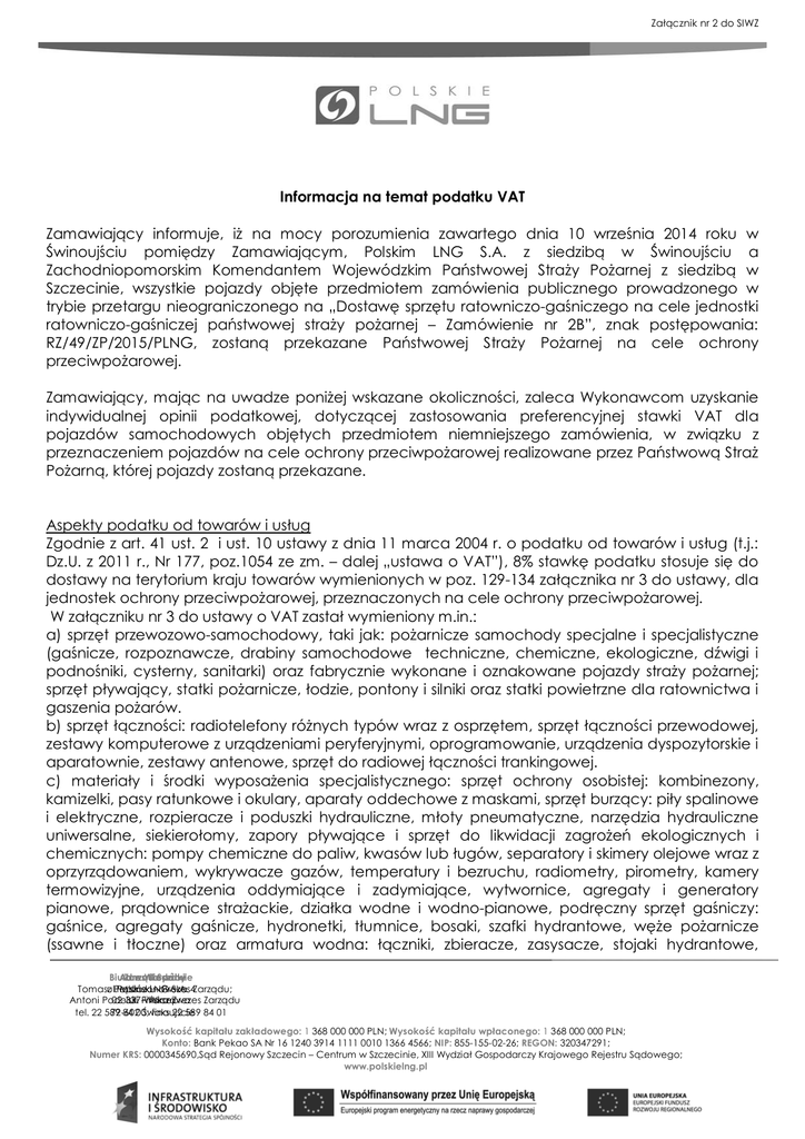 Załącznik nr 2 do SIWZ Informacja na temat podatku VAT Zamawiający informuje, iż na mocy porozumienia zawartego dnia 10 września 2014 roku w Świnoujściu pomiędzy Zamawiającym, Polskim LNG S.A. z siedzibą w Świnoujściu a Zachodniopomorskim Komendantem Wojewódzkim Państwowej Straży Pożarnej z siedzibą w Szczecinie, wszystkie pojazdy objęte przedmiotem zamówienia publicznego prowadzonego w trybie przetargu nieograniczonego na „Dostawę sprzętu ratowniczo-gaśniczego na cele jednostki ratowniczo-gaśniczej państwowej straży pożarnej – Zamówienie nr 2B”, znak postępowania: RZ/49/ZP/2015/PLNG, zostaną przekazane Państwowej Straży Pożarnej na cele ochrony przeciwpożarowej. Zamawiający, mając na uwadze poniżej wskazane okoliczności, zaleca Wykonawcom uzyskanie indywidualnej opinii podatkowej, dotyczącej zastosowania preferencyjnej stawki VAT dla pojazdów samochodowych objętych przedmiotem niemniejszego zamówienia, w związku z przeznaczeniem pojazdów na cele ochrony przeciwpożarowej realizowane przez Państwową Straż Pożarną, której pojazdy zostaną przekazane. Aspekty podatku od towarów i usług Zgodnie z art. 41 ust. 2 i ust. 10 ustawy z dnia 11 marca 2004 r. o podatku od towarów i usług (t.j.: Dz.U. z 2011 r., Nr 177, poz.1054 ze zm. – dalej „ustawa o VAT”), 8% stawkę podatku stosuje się do dostawy na terytorium kraju towarów wymienionych w poz. 129-134 załącznika nr 3 do ustawy, dla jednostek ochrony przeciwpożarowej, przeznaczonych na cele ochrony przeciwpożarowej. W załączniku nr 3 do ustawy o VAT zastał wymieniony m.in.: a) sprzęt przewozowo-samochodowy, taki jak: pożarnicze samochody specjalne i specjalistyczne (gaśnicze, rozpoznawcze, drabiny samochodowe techniczne, chemiczne, ekologiczne, dźwigi i podnośniki, cysterny, sanitarki) oraz fabrycznie wykonane i oznakowane pojazdy straży pożarnej; sprzęt pływający, statki pożarnicze, łodzie, pontony i silniki oraz statki powietrzne dla ratownictwa i gaszenia pożarów. b) sprzęt łączności: radiotelefony różnych typów wraz z osprzętem, sprzęt łączności przewodowej, zestawy komputerowe z urządzeniami peryferyjnymi, oprogramowanie, urządzenia dyspozytorskie i aparatownie, zestawy antenowe, sprzęt do radiowej łączności trankingowej. c) materiały i środki wyposażenia specjalistycznego: sprzęt ochrony osobistej: kombinezony, kamizelki, pasy ratunkowe i okulary, aparaty oddechowe z maskami, sprzęt burzący: piły spalinowe i elektryczne, rozpieracze i poduszki hydrauliczne, młoty pneumatyczne, narzędzia hydrauliczne uniwersalne, siekierołomy, zapory pływające i sprzęt do likwidacji zagrożeń ekologicznych i chemicznych: pompy chemiczne do paliw, kwasów lub ługów, separatory i skimery olejowe wraz z oprzyrządowaniem, wykrywacze gazów, temperatury i bezruchu, radiometry, pirometry, kamery termowizyjne, urządzenia oddymiające i zadymiające, wytwornice, agregaty i generatory pianowe, prądownice strażackie, działka wodne i wodno-pianowe, podręczny sprzęt gaśniczy: gaśnice, agregaty gaśnicze, hydronetki, tłumnice, bosaki, szafki hydrantowe, węże pożarnicze (ssawne i tłoczne) oraz armatura wodna: łączniki, zbieracze, zasysacze, stojaki hydrantowe, Biuro Adres Zarząd w Warszawie Siedziby Spółki Tomaszul.Pepliński Polskie Mszczonowska LNG – Prezes S.A. 4Zarządu; Antoni Podolski 02-337 ul. Fińska –Warszawa Wiceprezes 7 Zarządu tel. 22 589 72-602 84 00; Świnoujście faks 22 589 84 01 Wysokość kapitału zakładowego: 1 368 000 000 PLN; Wysokość kapitału wpłaconego: 1 368 000 000 PLN; Konto: Bank Pekao SA Nr 16 1240 3914 1111 0010 1366 4566; NIP: 855-155-02-26; REGON: 320347291; Numer KRS: 0000345690,Sąd Rejonowy Szczecin – Centrum w Szczecinie, XIII Wydział Gospodarczy Krajowego Rejestru Sądowego; www.polskielng.pl rozdzielacze, zwijadła, zbiorniki wolnostojące, drabiny pożarnicze przenośne: przystawne, wysuwane i zestawiane, sprężarki, ładowarki i przetłaczarki do butli gazowych wysokociśnieniowych, sprzęt ratowniczy: aparaty, skokochrony, wory, rękawy, linki ratownicze, ratowniczy sprzęt wysokogórski i dla płetwonurków, chemiczne środki gaśnicze, sorbenty, neutralizatory i odkażacze, środki zwilżające i modyfikujące, sprzęt kontrolno-pomiarowy stanowisk badawczych, pompy i autopompy pożarnicze, agregaty prądotwórcze i oświetleniowe oraz siłownie energetyczne, sprzęt i środki do uszczelniania i ograniczania przemieszczania się materiałów niebezpiecznych; d) wyposażenie zabezpieczające: pojazdy i samochody specjalistyczne: kasyna polowe, chłodnie, piece piekarskie polowe, urządzenia dezynfekcyjno-kąpielowe, łaźnie polowe, przyczepy, naczepy i kontenery pożarnicze wraz z wyposażeniem, polowe wyposażenie gastronomiczne: kuchnie polowe, termosy polowe, polowe podgrzewacze i rozdzielacze wody, namioty sypialne, techniczne i do kuchni polowych, kasyna polowe, garnki, menażki, niezbędniki, wyposażenie samochodów sanitarnych; e) materiały pędne i smary: paliwa i smary z wyłączeniem wyrobów objętych podatkiem akcyzowym; e) pozostałe towary: urządzenia szkolno-treningowe: trenażery, ścieżki biegowe, urządzenia wydolnościowe i do pomiaru masy ciała, drobny sprzęt sportowy oraz przeszkody i urządzenia torów ćwiczeń sportowo-pożarniczych, umundurowanie, odzież specjalna i ochronna, wyekwipowanie osobiste strażaka państwowej straży pożarnej według obowiązujących norm i wyposażenie specjalistyczne strażaka oraz odznaki, odznaczenia i dystynkcje, wyposażenie stacji diagnostycznych, stacji przeciwdymowych - przeciwgazowych, warsztatów łączności i ćwiczebnych komór gazowych, urządzenia sygnalizacyjno-ostrzegawcze do oznakowania pojazdów uprzywilejowanych w ruchu i terenów akcji ratowniczo-gaśniczych, podwozia oraz nadwozia samochodowe i przyczepy pod zabudowę na pojazdy dla straży pożarnej. Zakupiony przez Spółkę sprzęt ochrony 